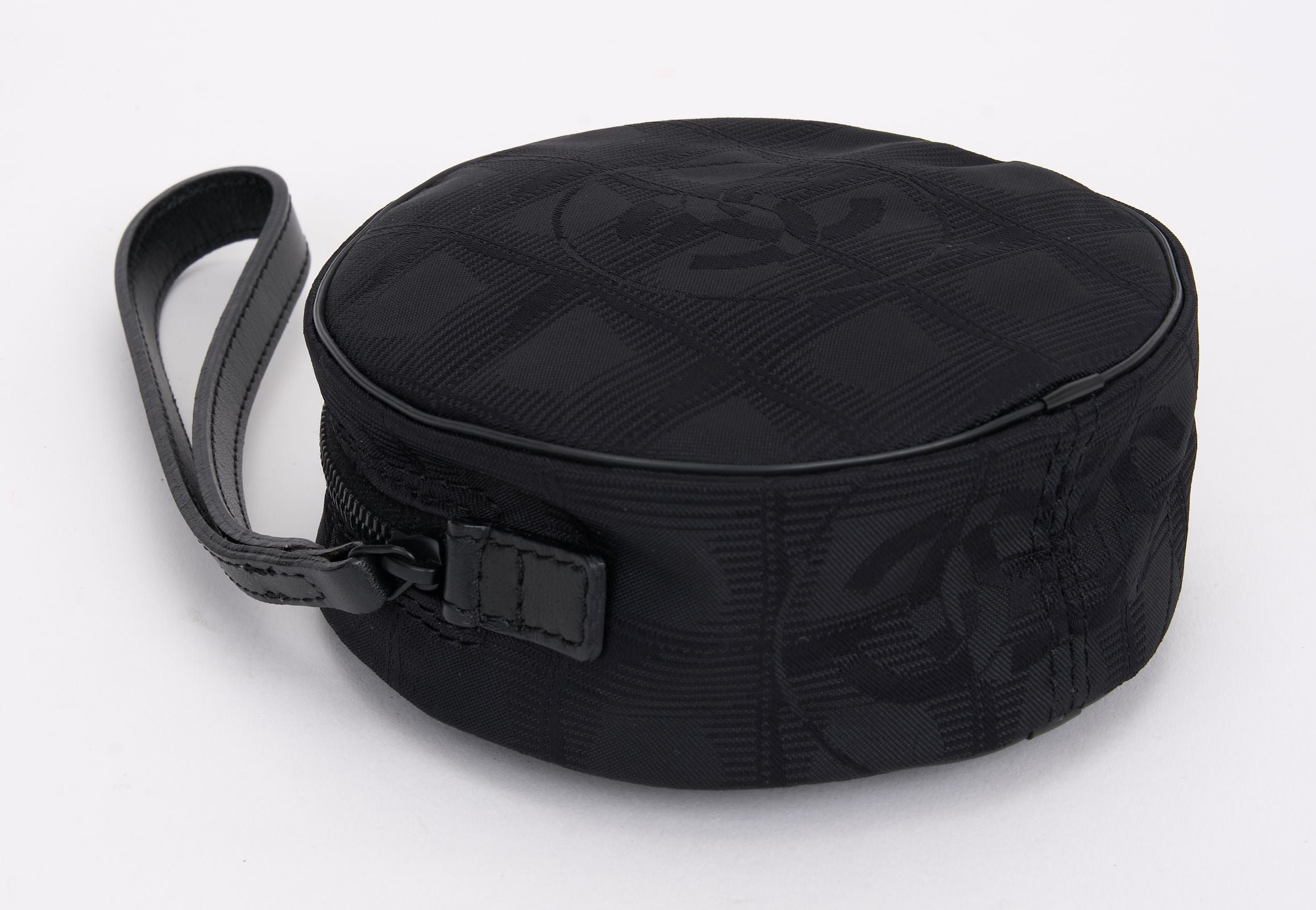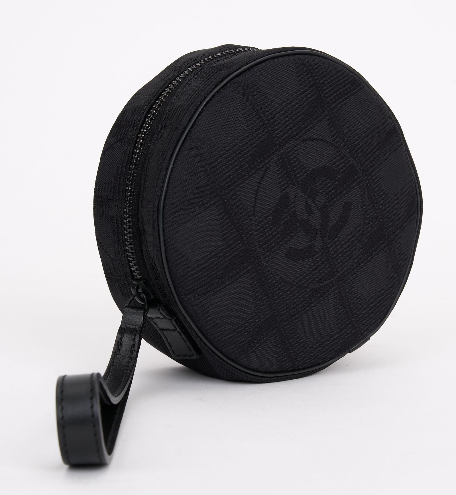 This Chanel travel line round bag in black jacquard nylon features a zipper closure, the inside has black lining and one open pocket. This is a perfect accessory for daily use or to keep your personal belongings in place. Comes with hologram, id card and original dust cover.