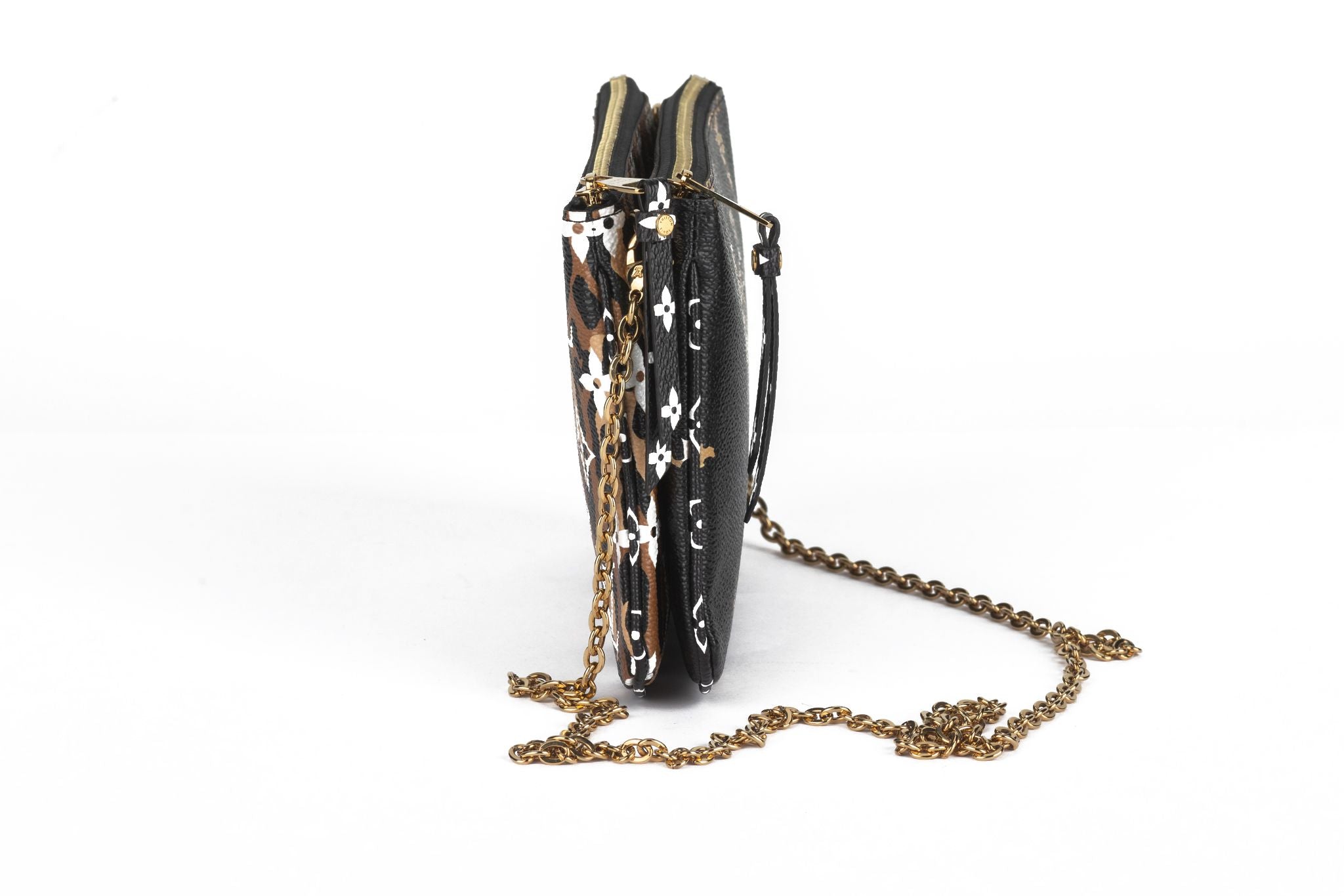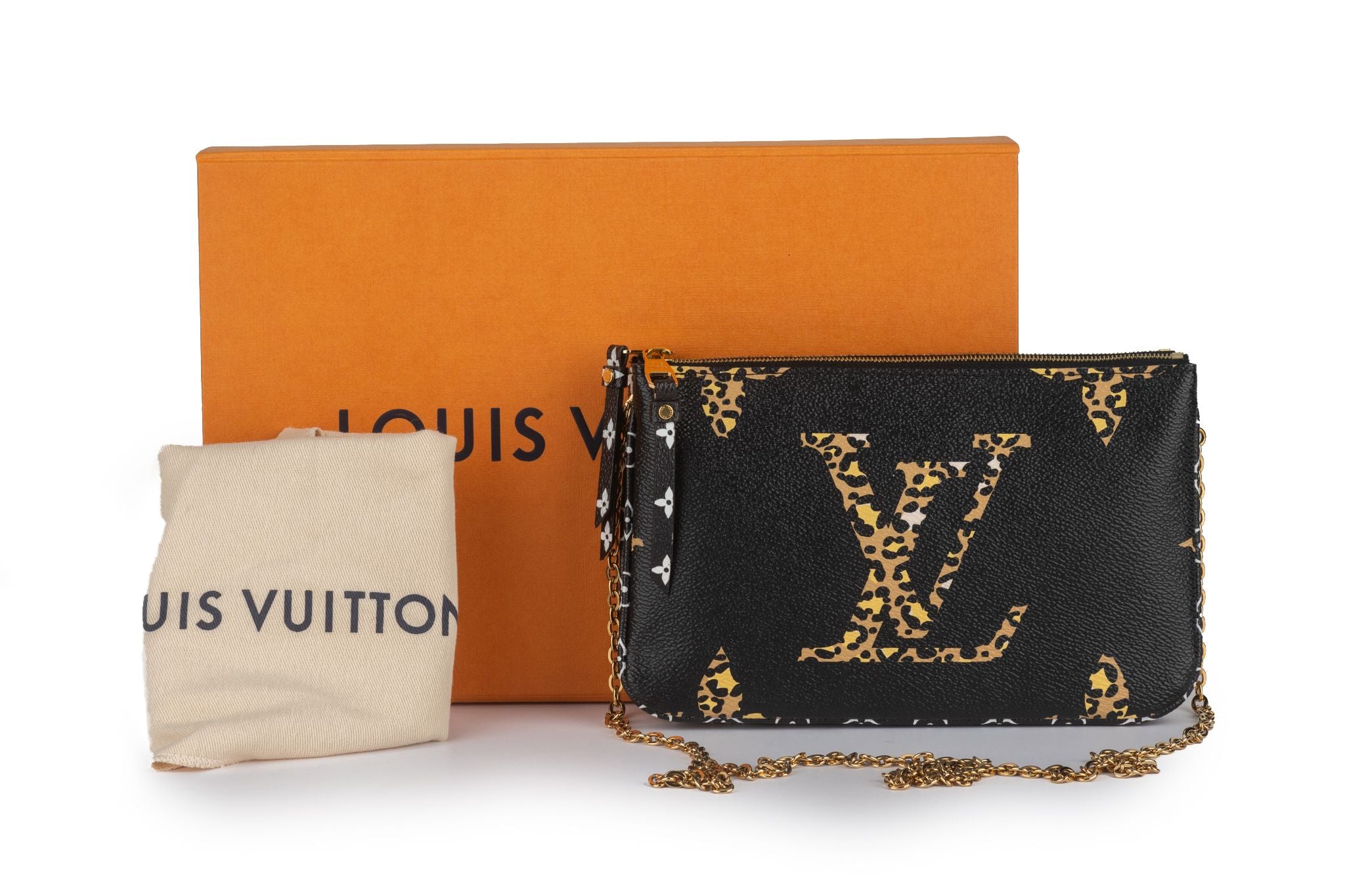 This Louis Vuitton Monogram Jungle Pochette Double Zip in Black. This clutch features the classic Louis Vuitton monogram on black and leopard-print coated canvas. The bag features black and white mini monogram canvas trim and a removable polished brass chain-link shoulder strap. Comes with original dust cover and box .