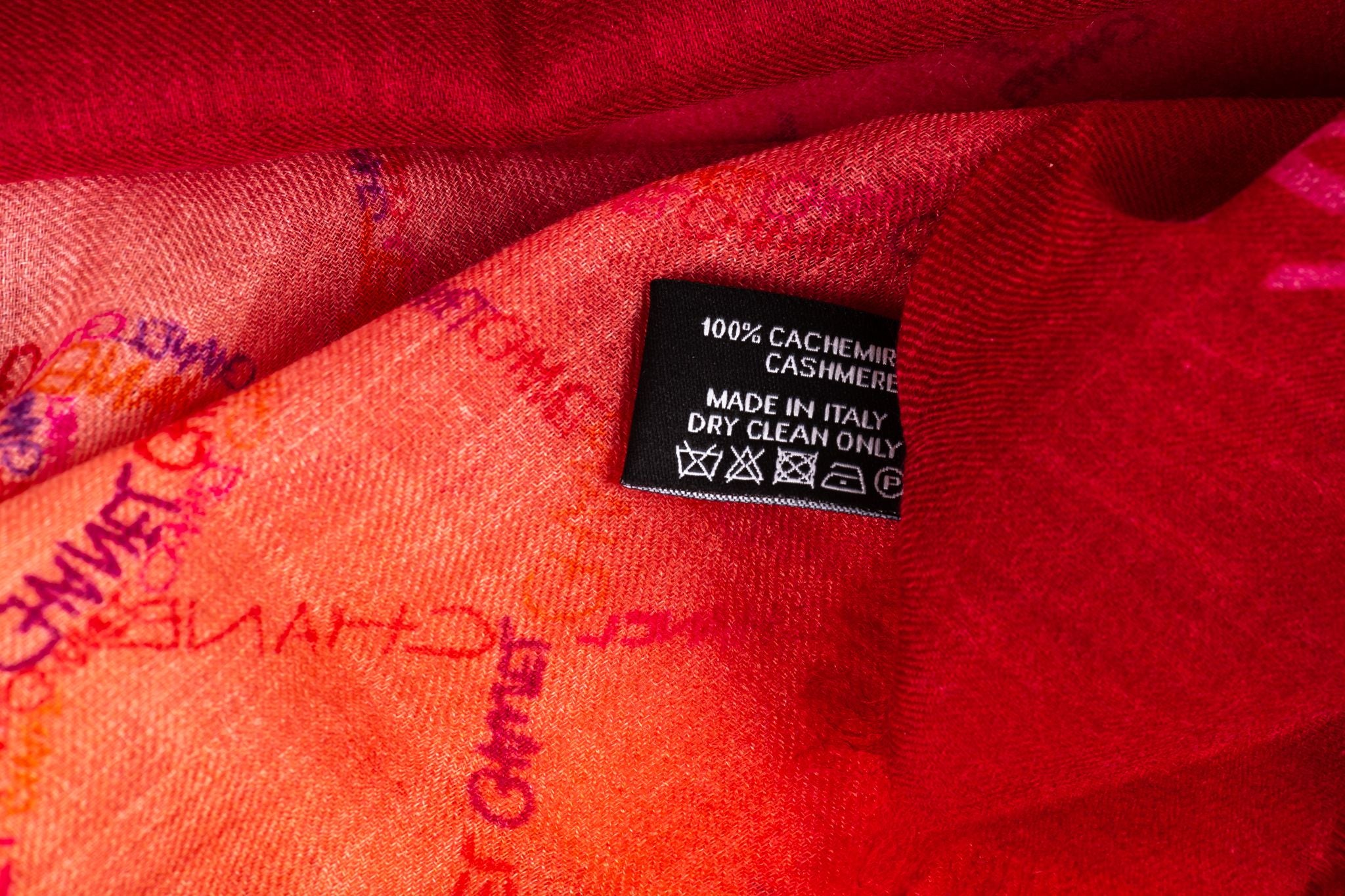 Chanel new cashmere shawl in degrade fuchsia -red . Camellia drawings. Care tag attached.