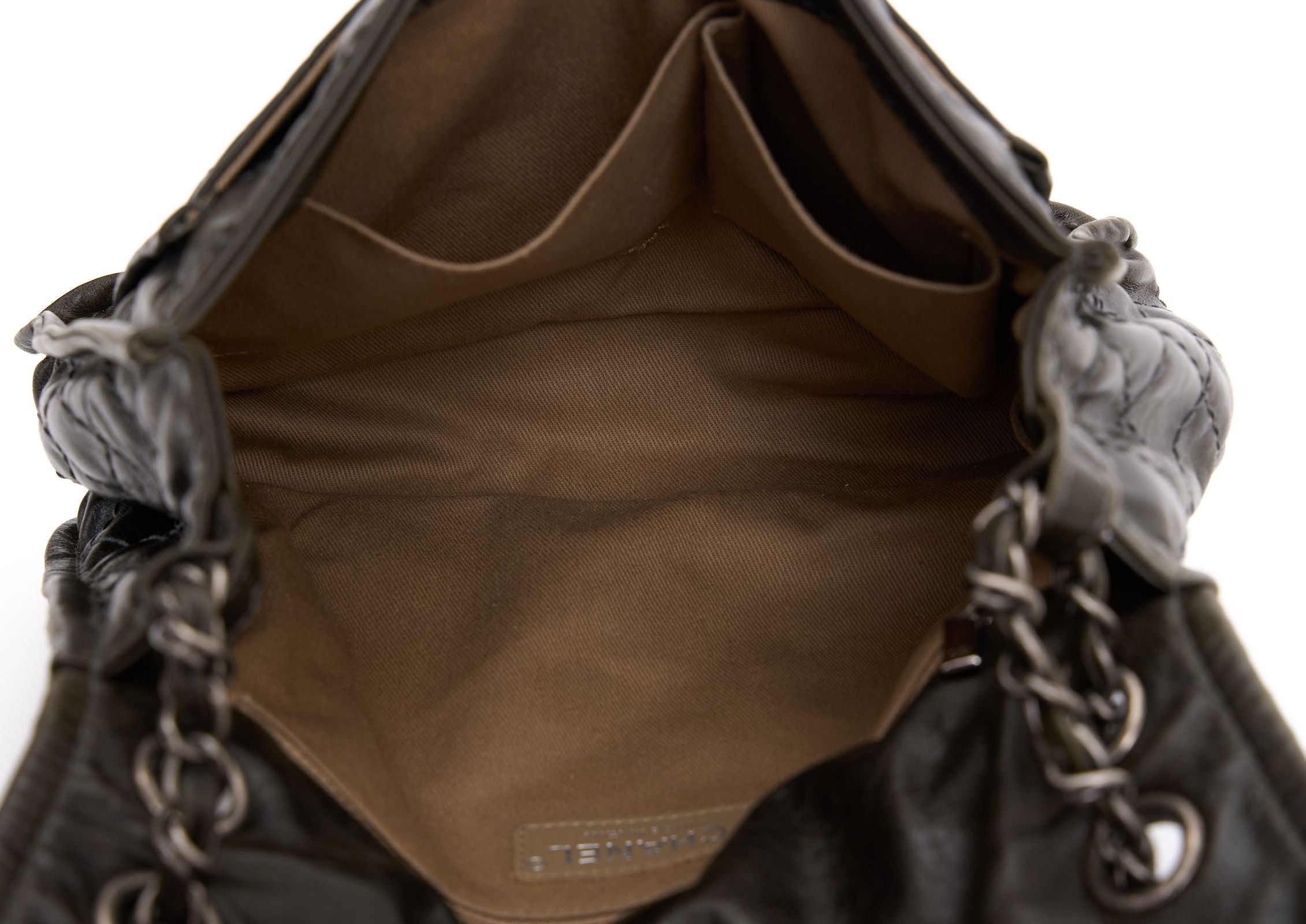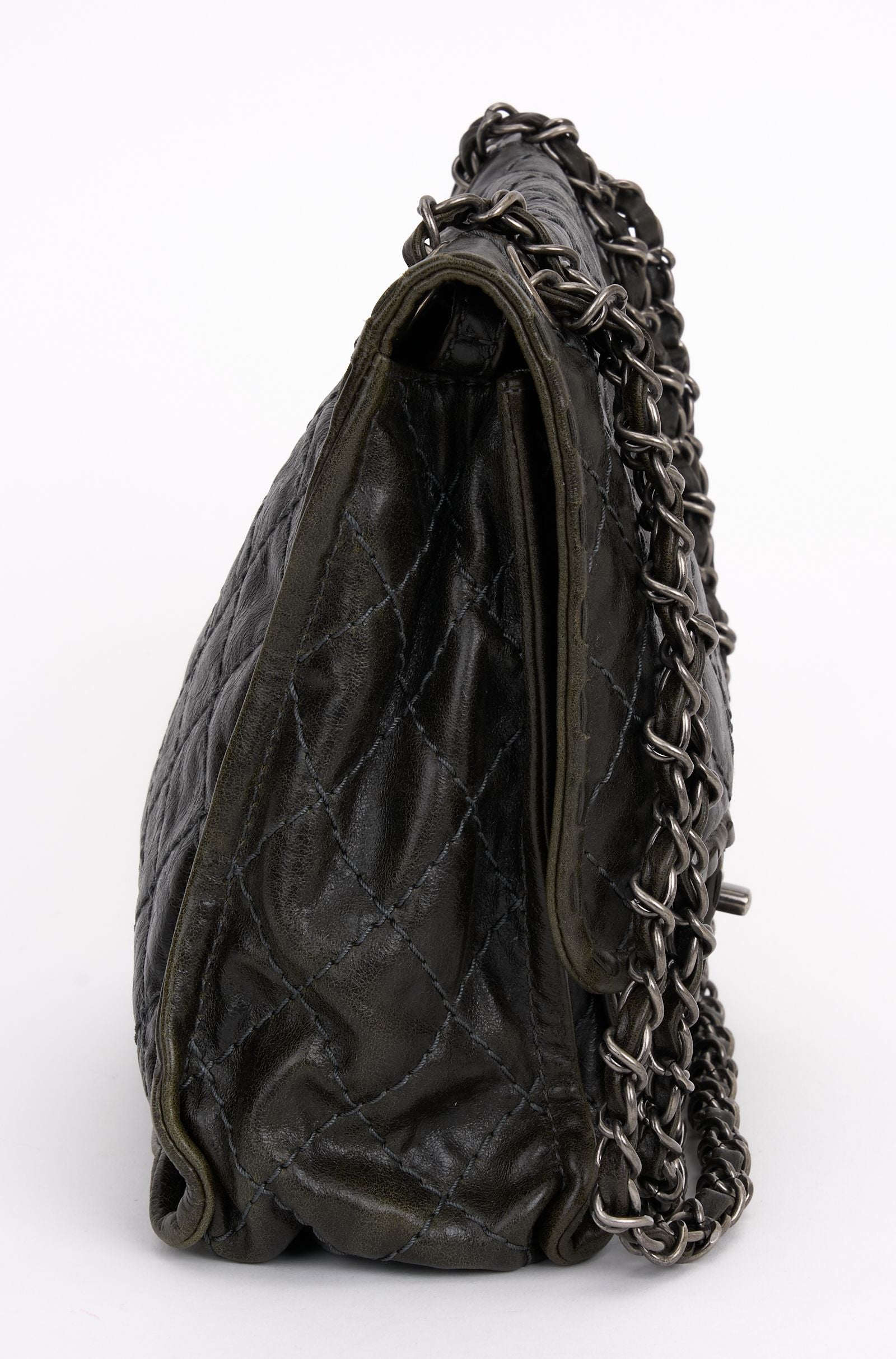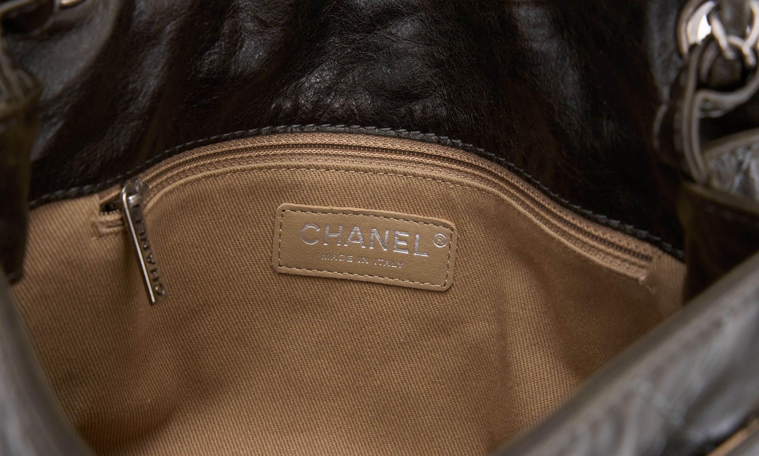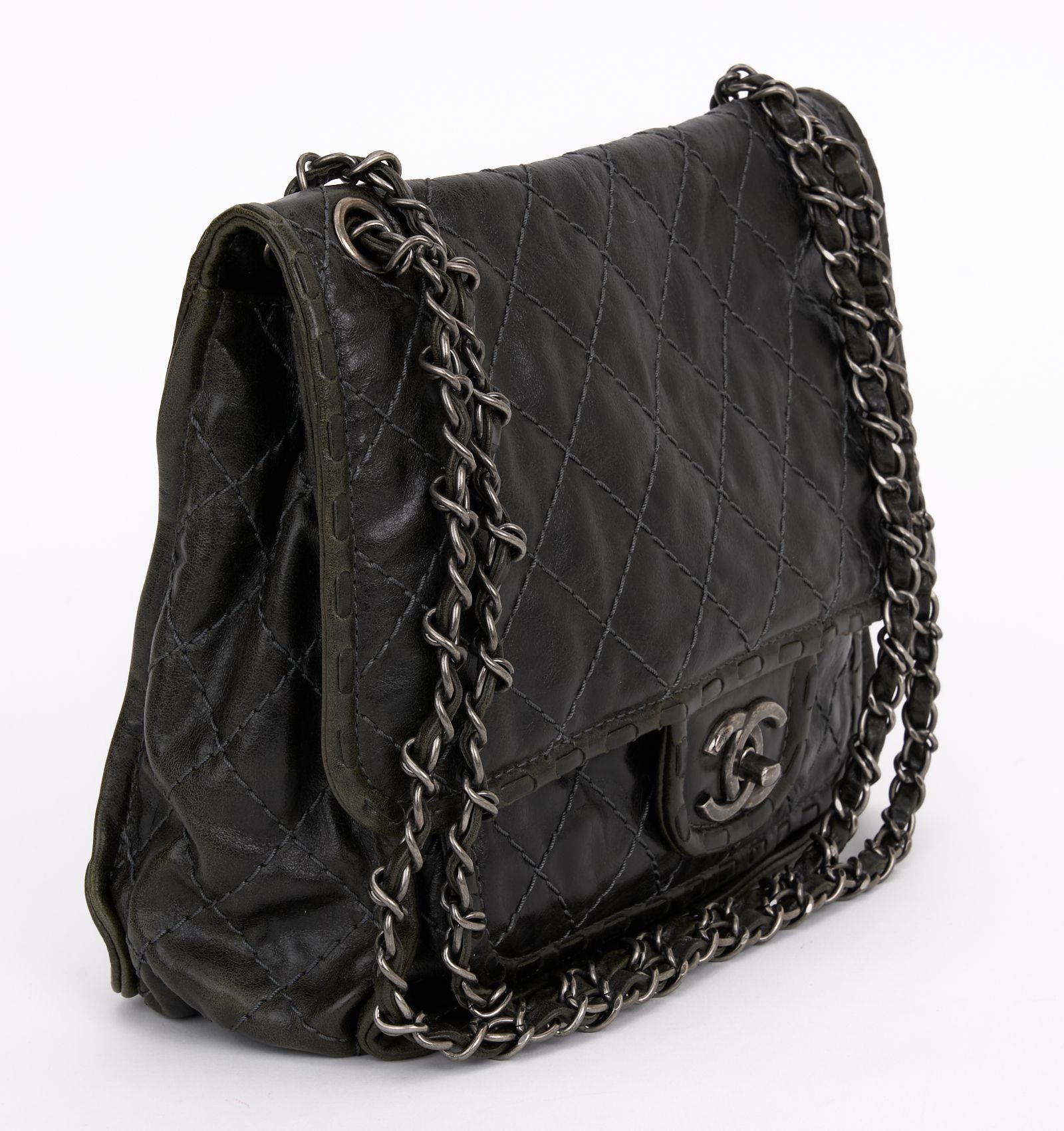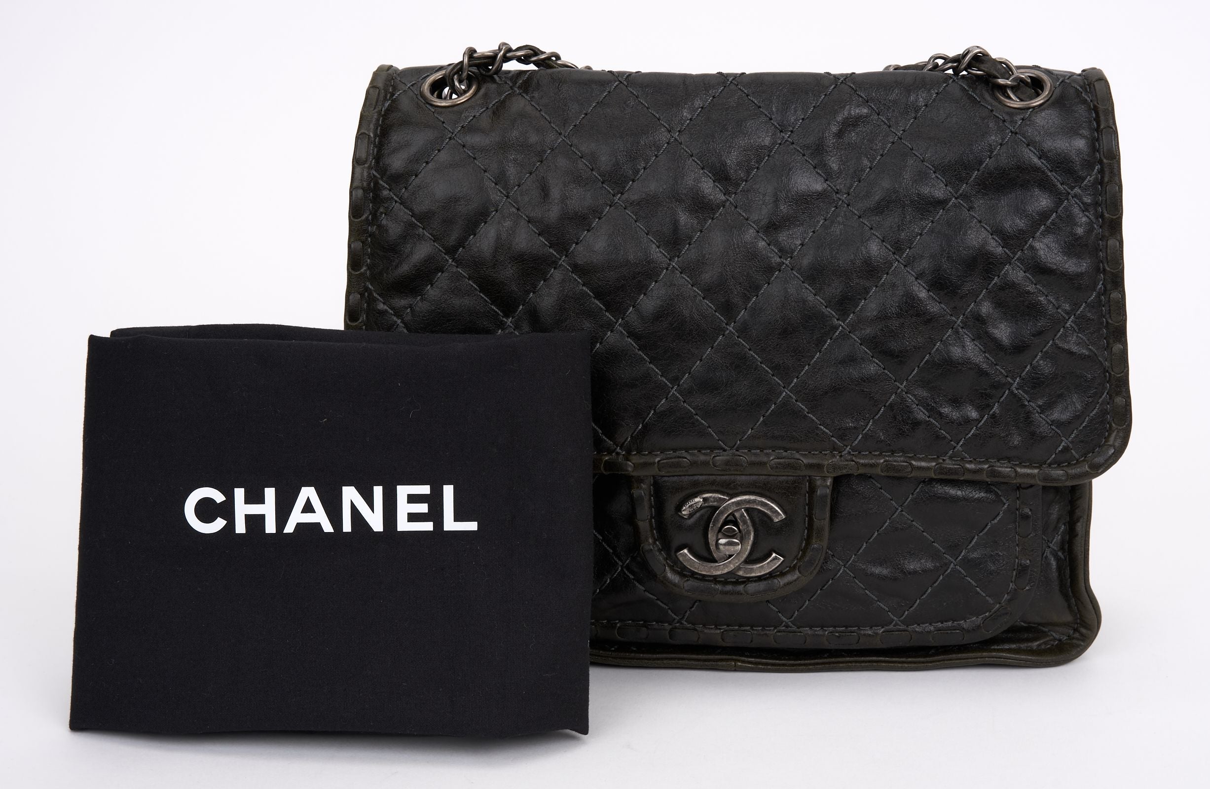 This Chanel Paris-Edinburgh flap bag in black features aged calfskin with a gunmetal chain and leather woven shoulder straps, exterior slot pocket at front, woven interior lining, interior zip wall pocket and slots and flap top with antiqued silver-tone CC at front and turn-lock closure. Comes with hologram and original dust cover. The hologram first two numbers are 18. Strap drop - 11"