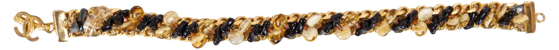 Chanel goldtone metal bracelet adorned with brown and black glass beads. Spring '99 collection. Comes with a original pouch. Minor wear.
