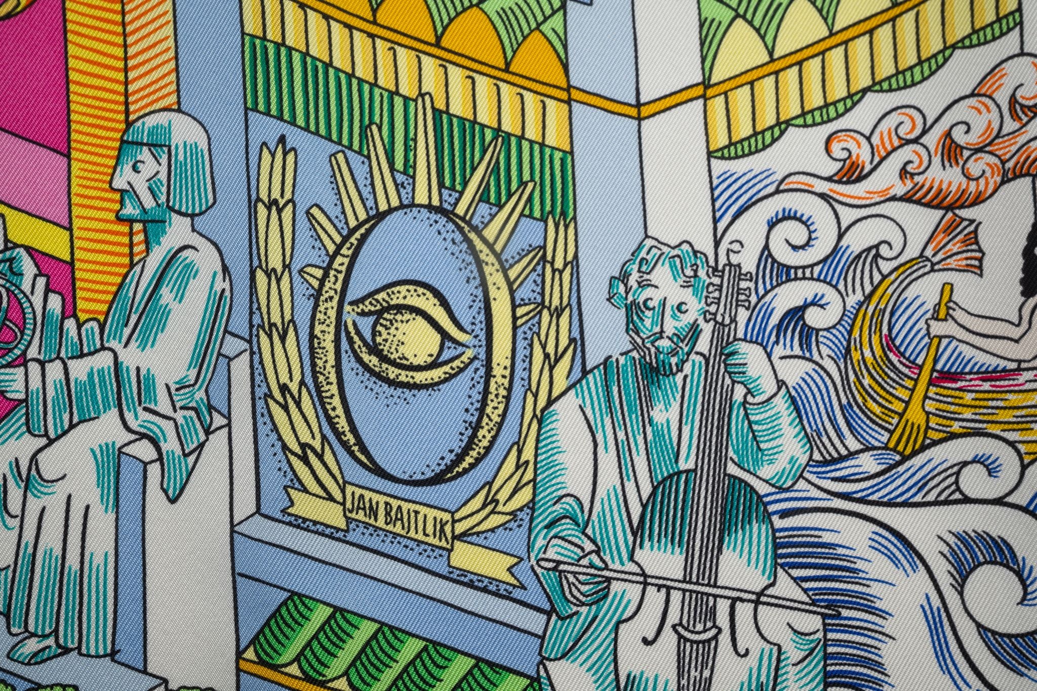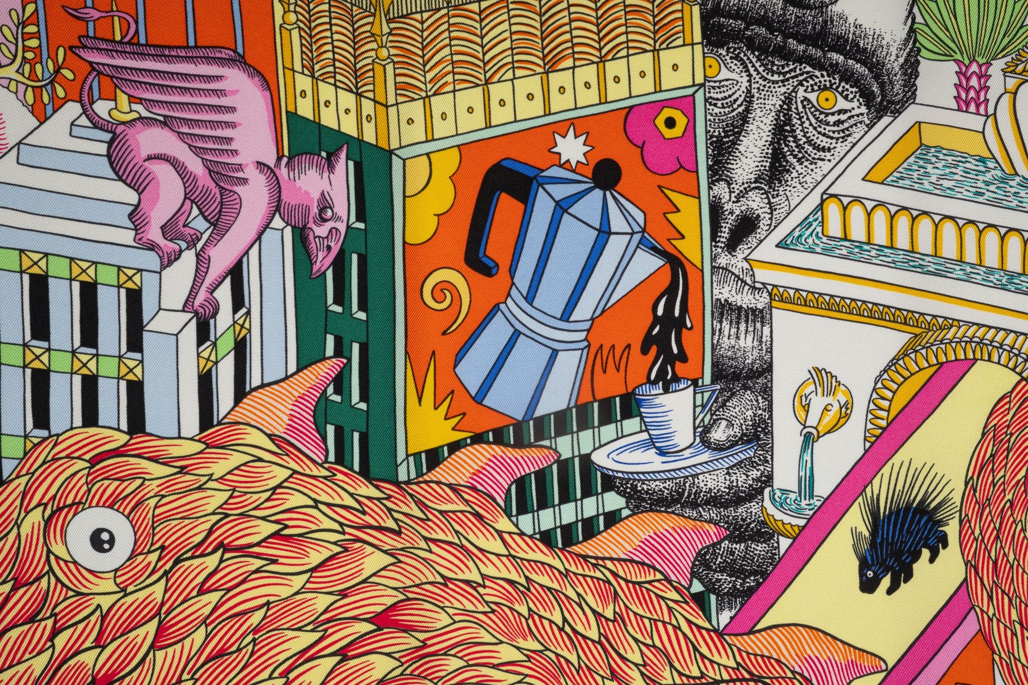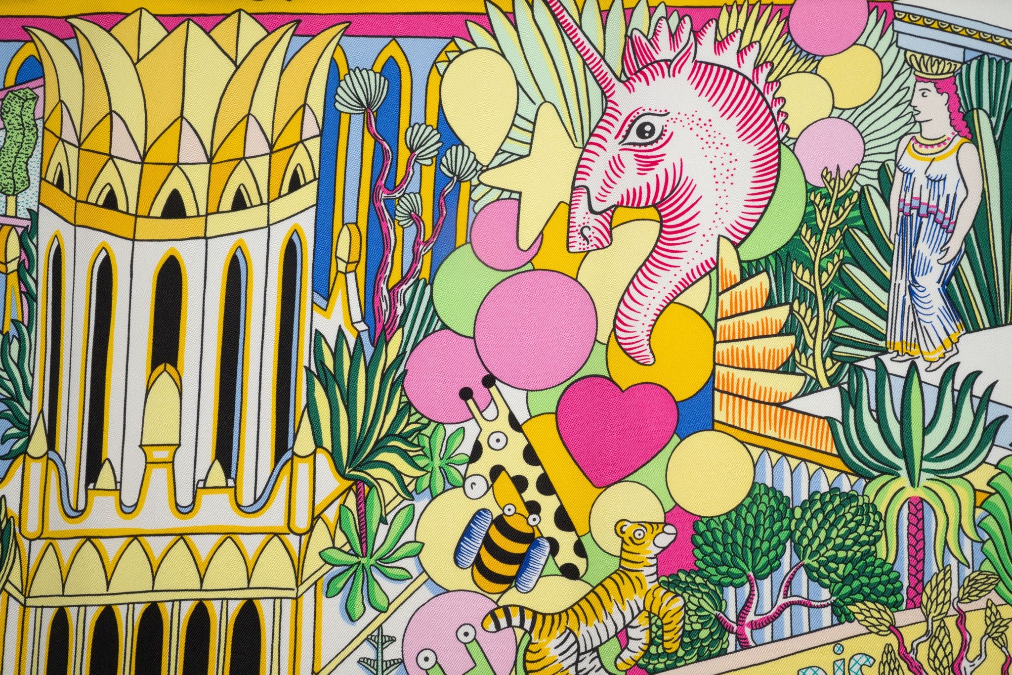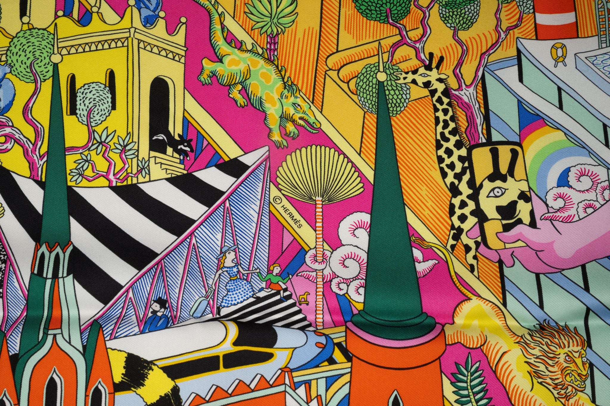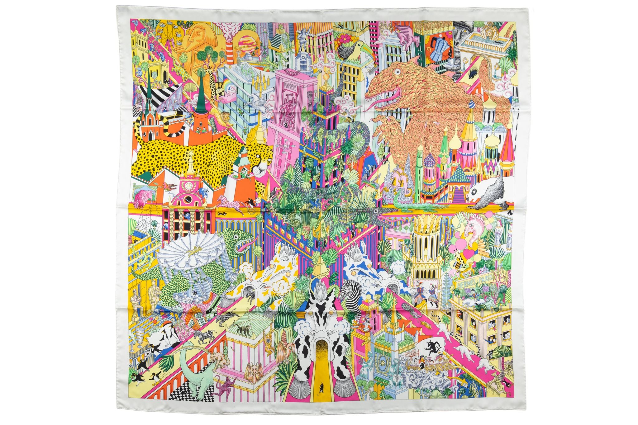 This Hermès "Animapolis" 100% silk scarf, in Jaune, Vif Vert, and Rose. Features a brightly colored graphic design and hand-rolled edges. Comes with ribbon and original box.