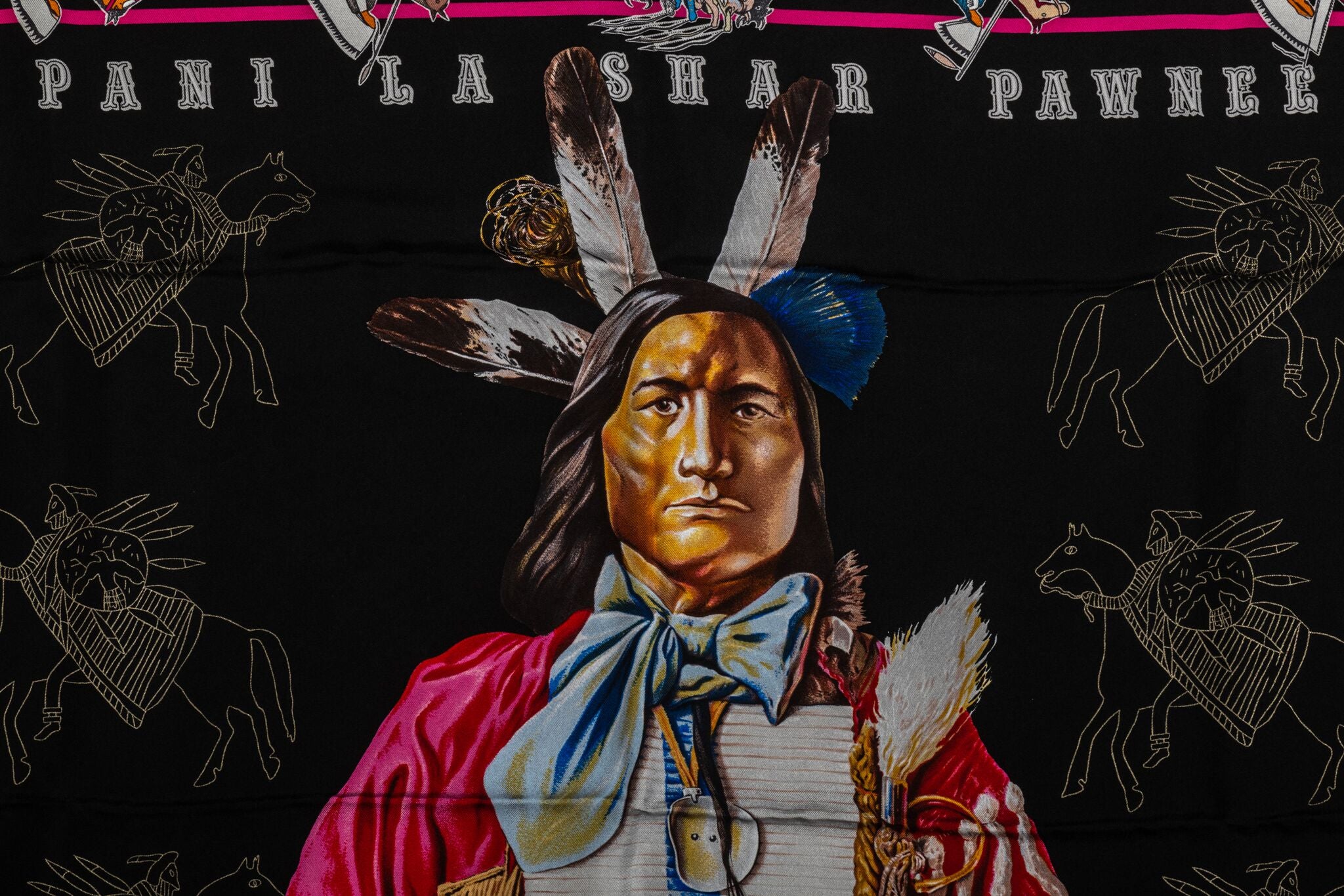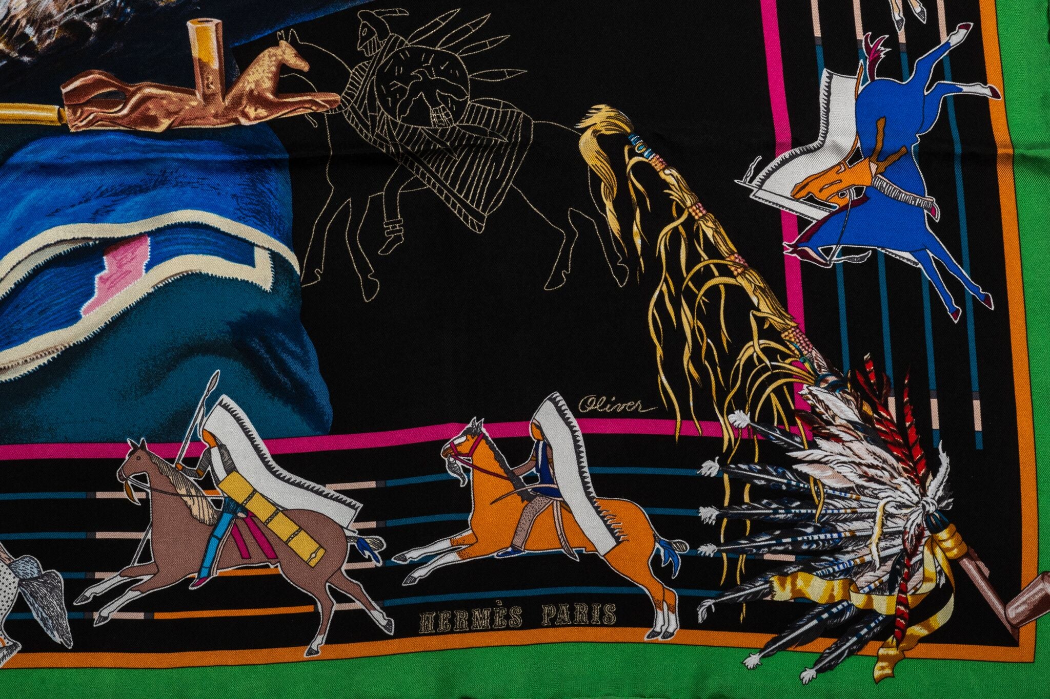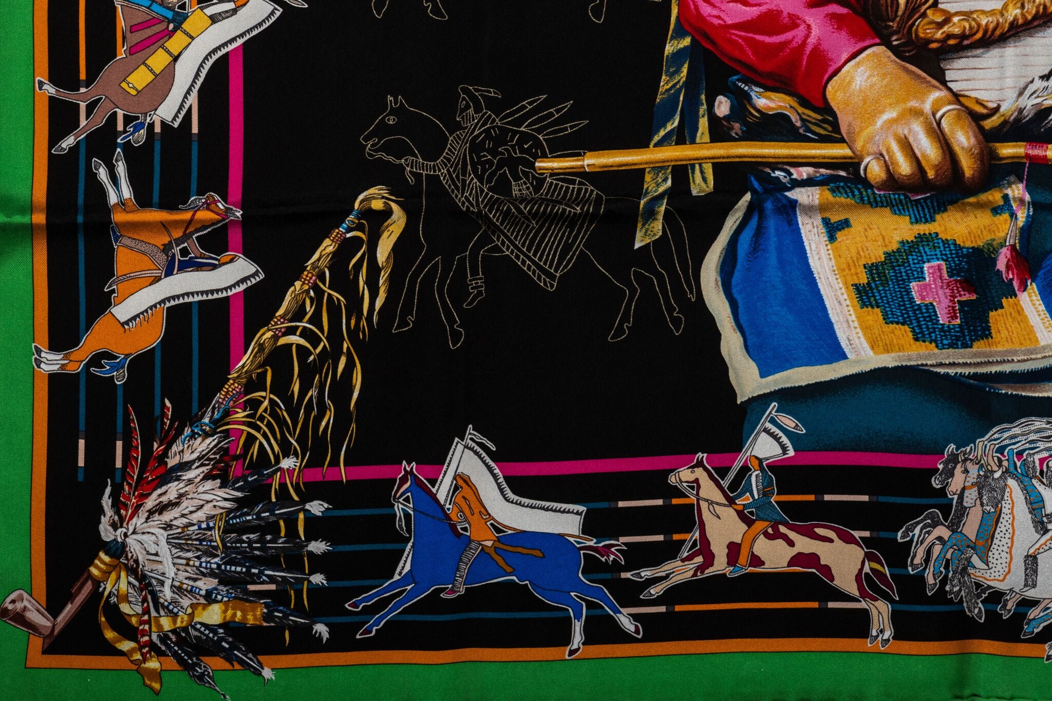 Hermès silk twill Pani La Shar Pawnee 90cm scarf in black with green trim. Designed by artist Kermit Oliver. Brand new with box and ribbon included.