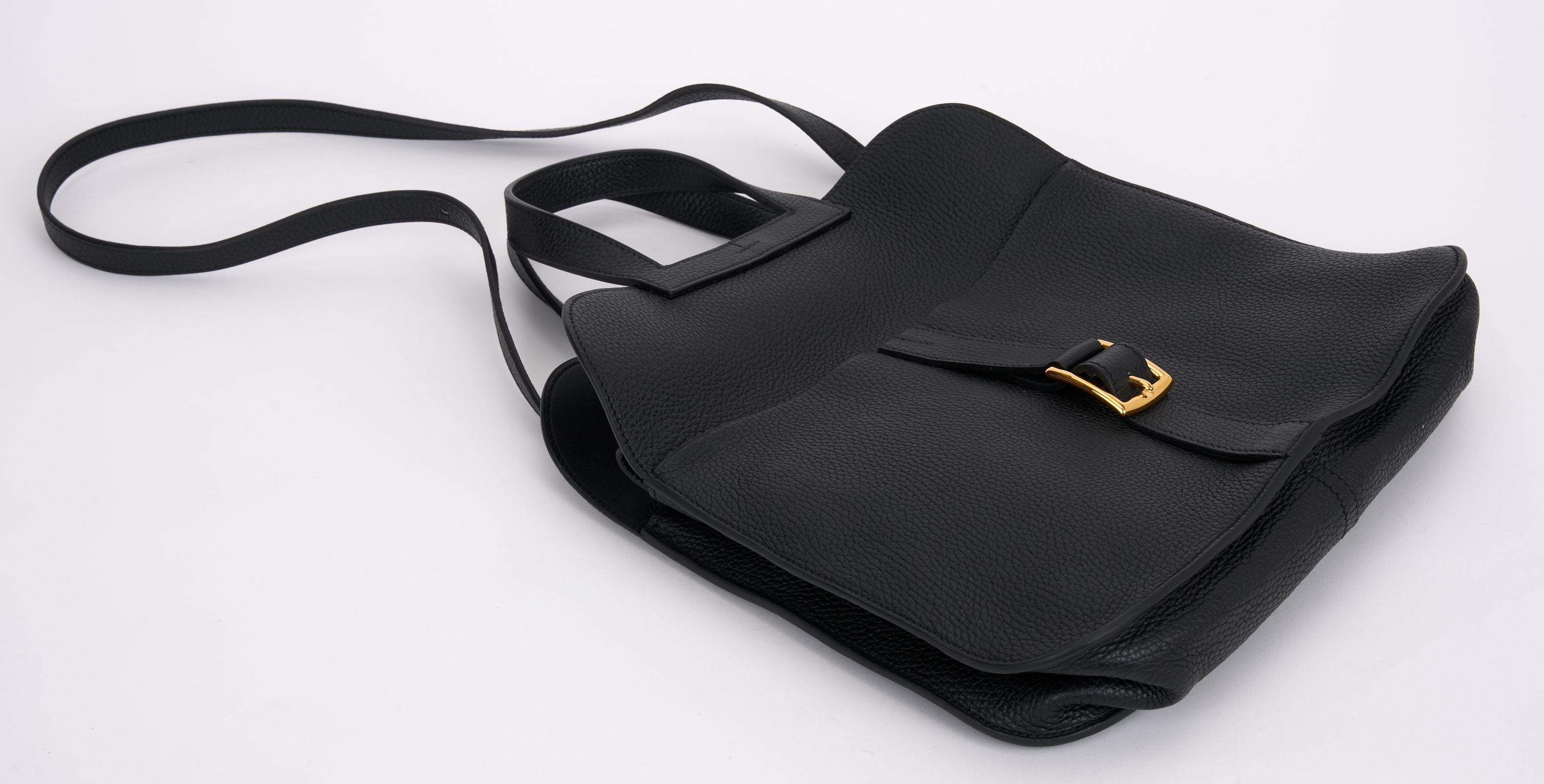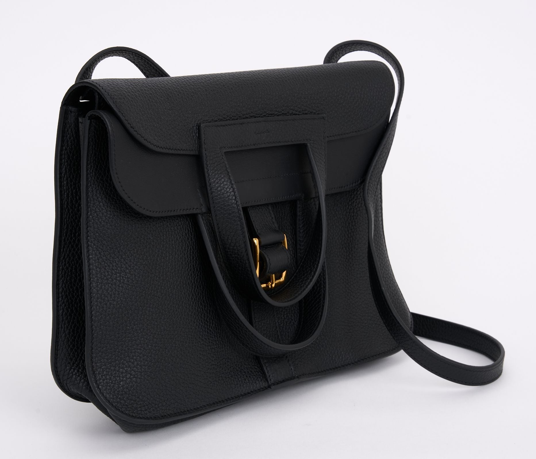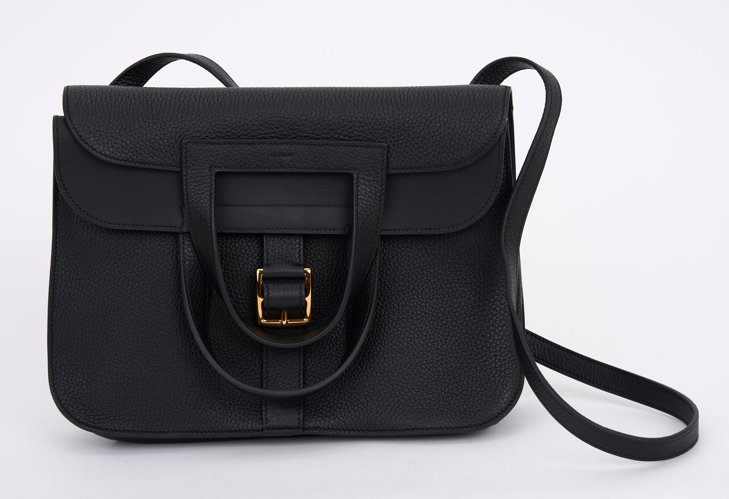 This Hermès Halzan 31 is crafted of black Taurillon Clemence leather and features an optional, adjustable leather shoulder strap, looping top handles, and a gold-plated buckle. The top opens to a smooth black leather interior with pockets. Comes with original box.