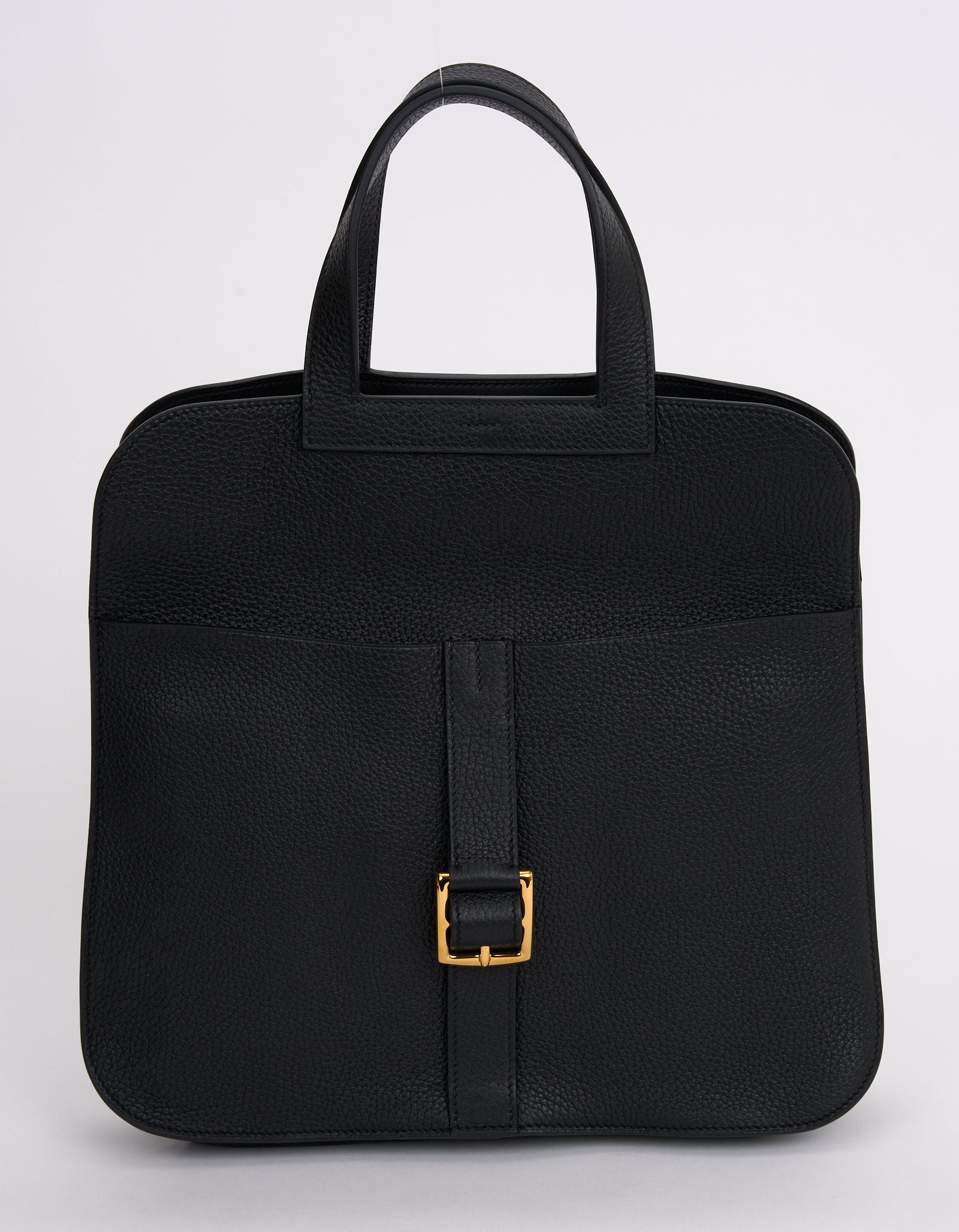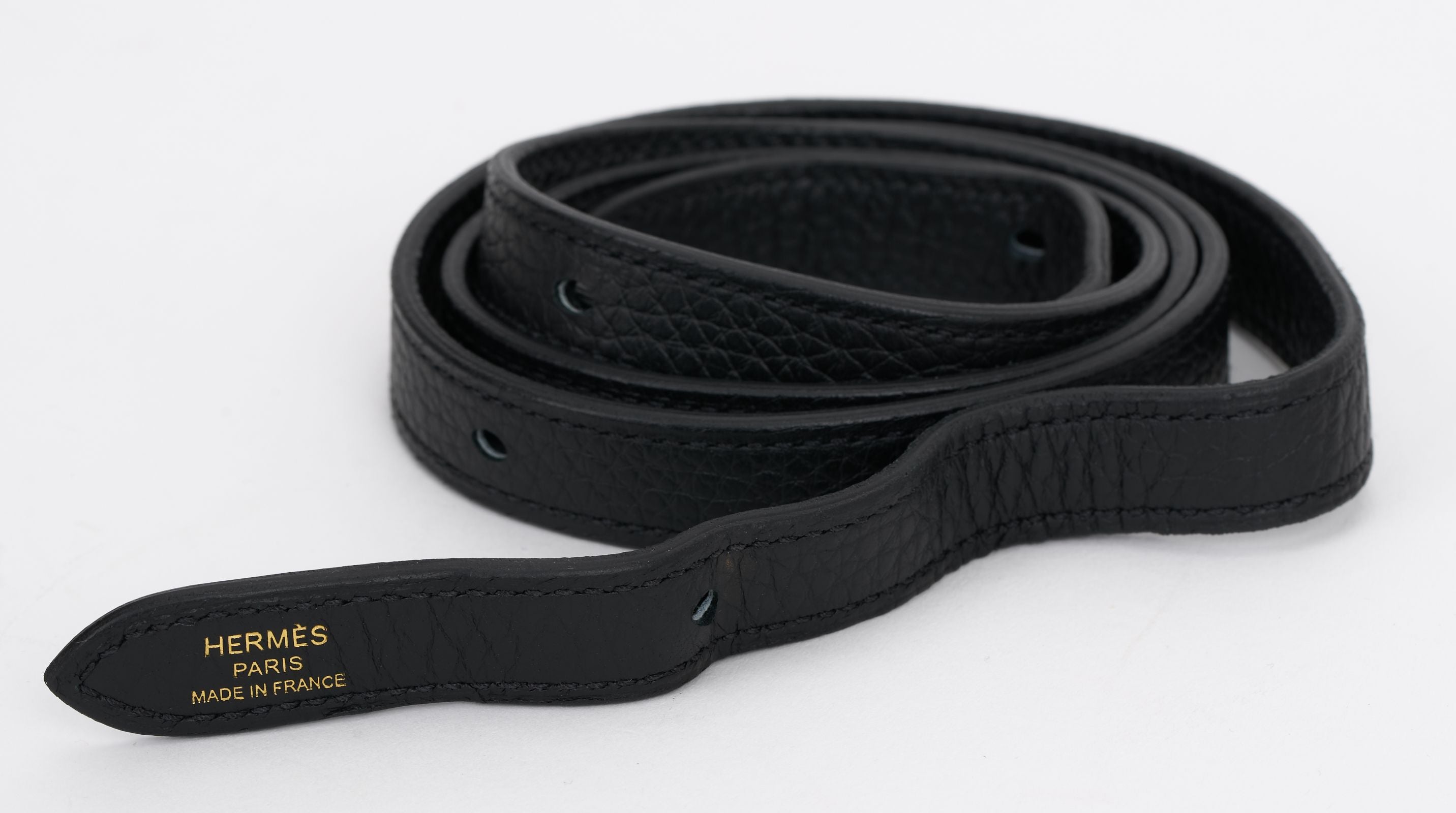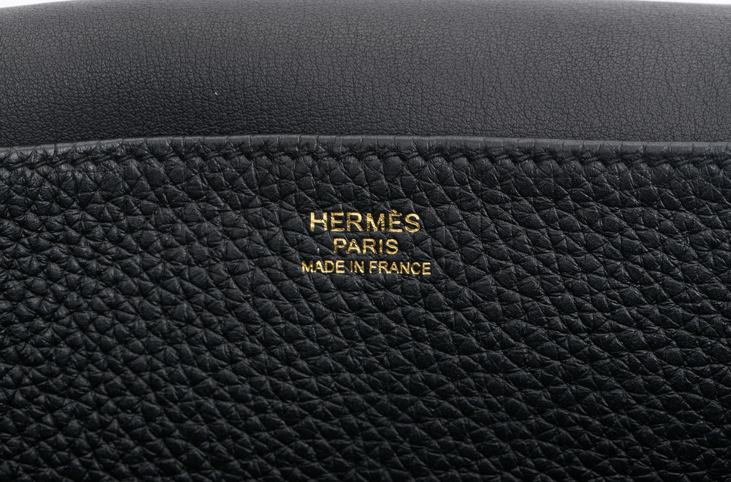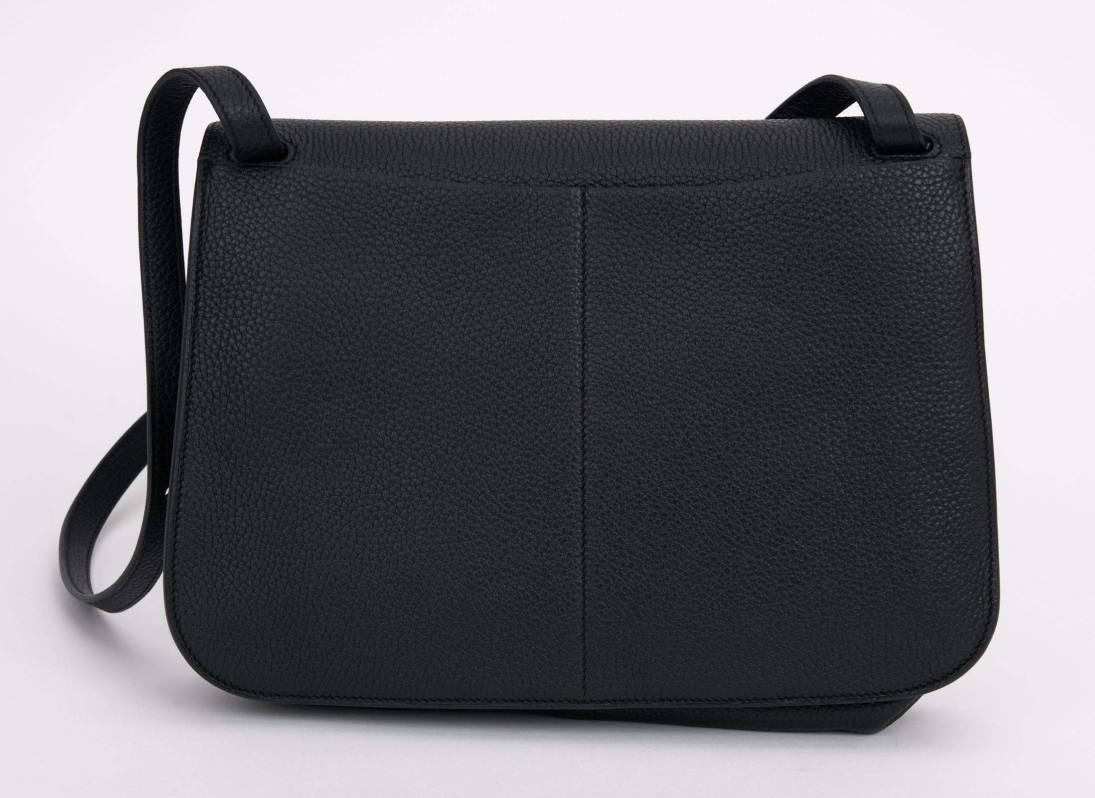 This Hermès Halzan 31 is crafted of black Taurillon Clemence leather and features an optional, adjustable leather shoulder strap, looping top handles, and a gold-plated buckle. The top opens to a smooth black leather interior with pockets. Comes with original box.