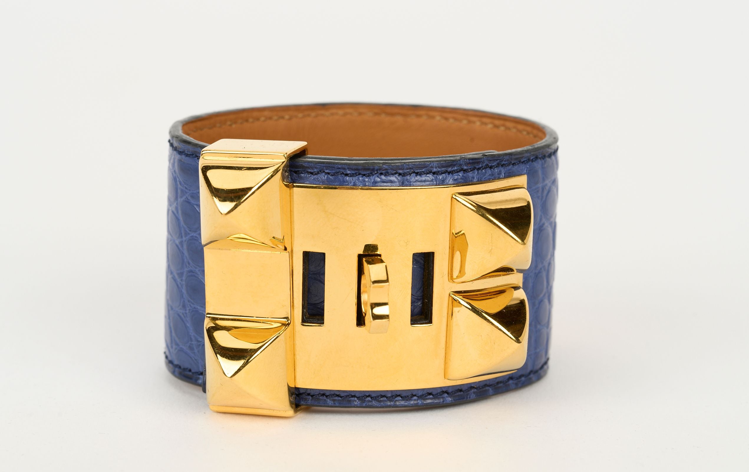 Hermès Collier De Chien Bracelet made from Mississippiensis alligator blue leather with an adjustable closure and gold tone hardware. Very marks on gold hardware. Date stamp N. Size small. Comes with original dust cover . Store price $2100