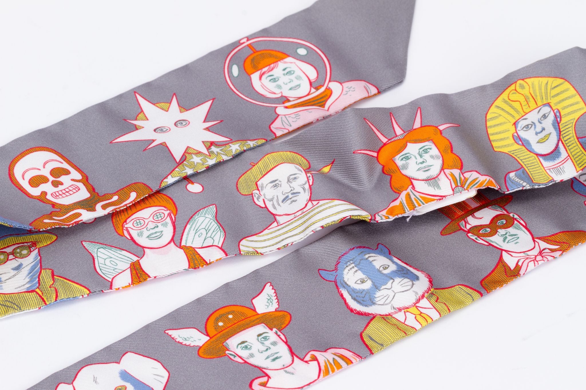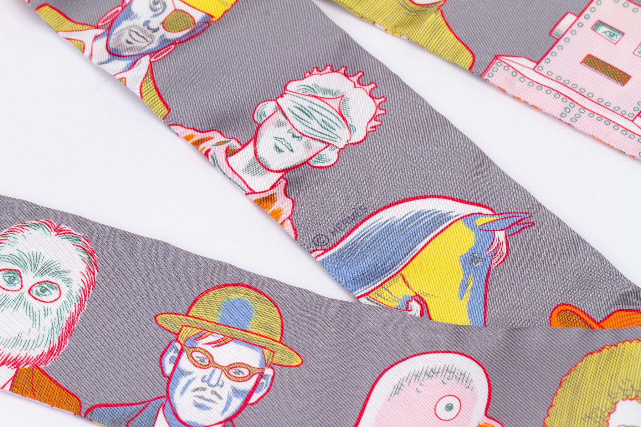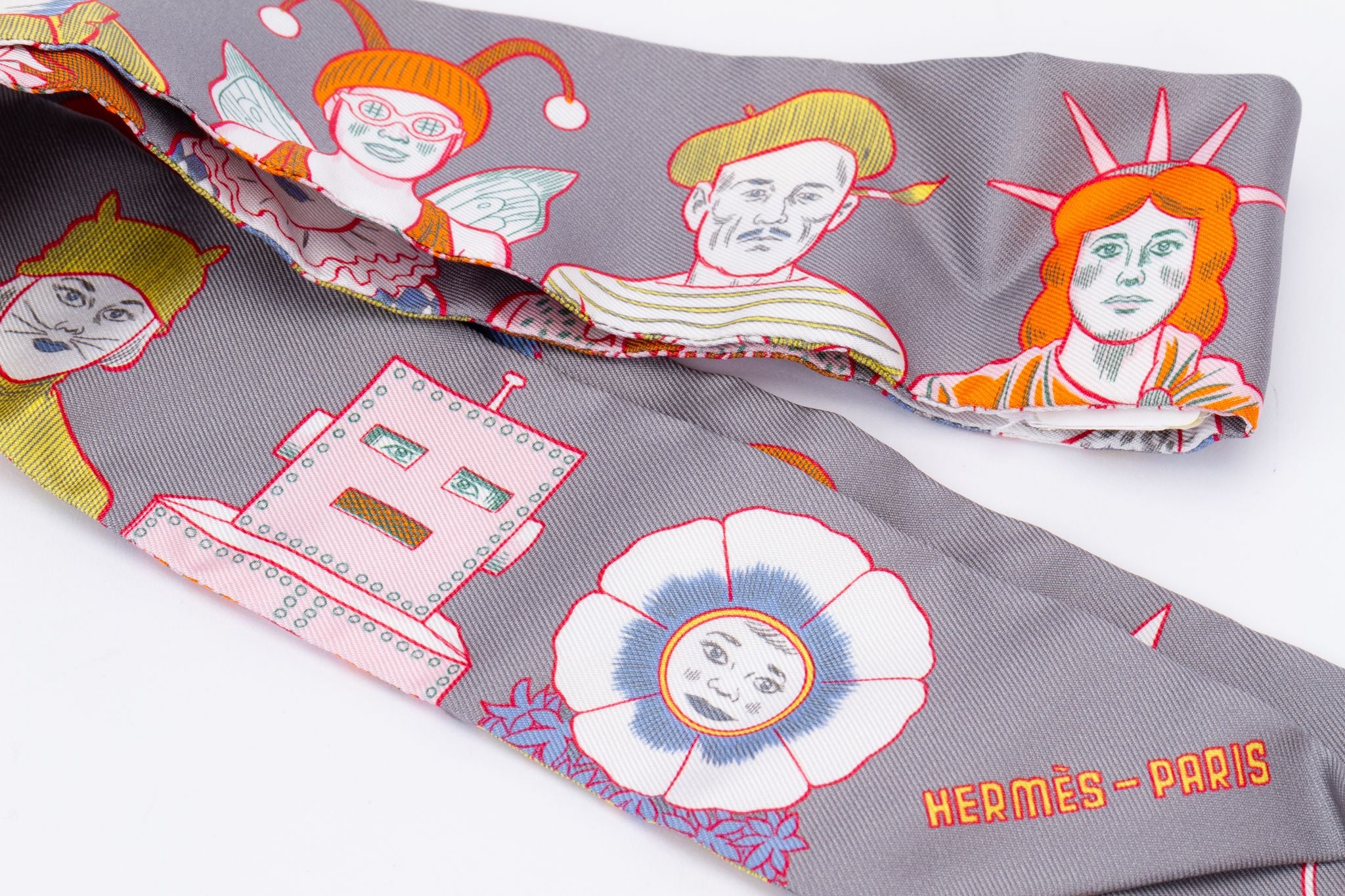 Hermès Dresscode Twilly brand new. This scarf is made out of silk and has never been worn. It is multicolor and shows for example a robot or the statue of liberty. The piece comes in the original box and is wrapped with the traditional Hermès ribbon.
