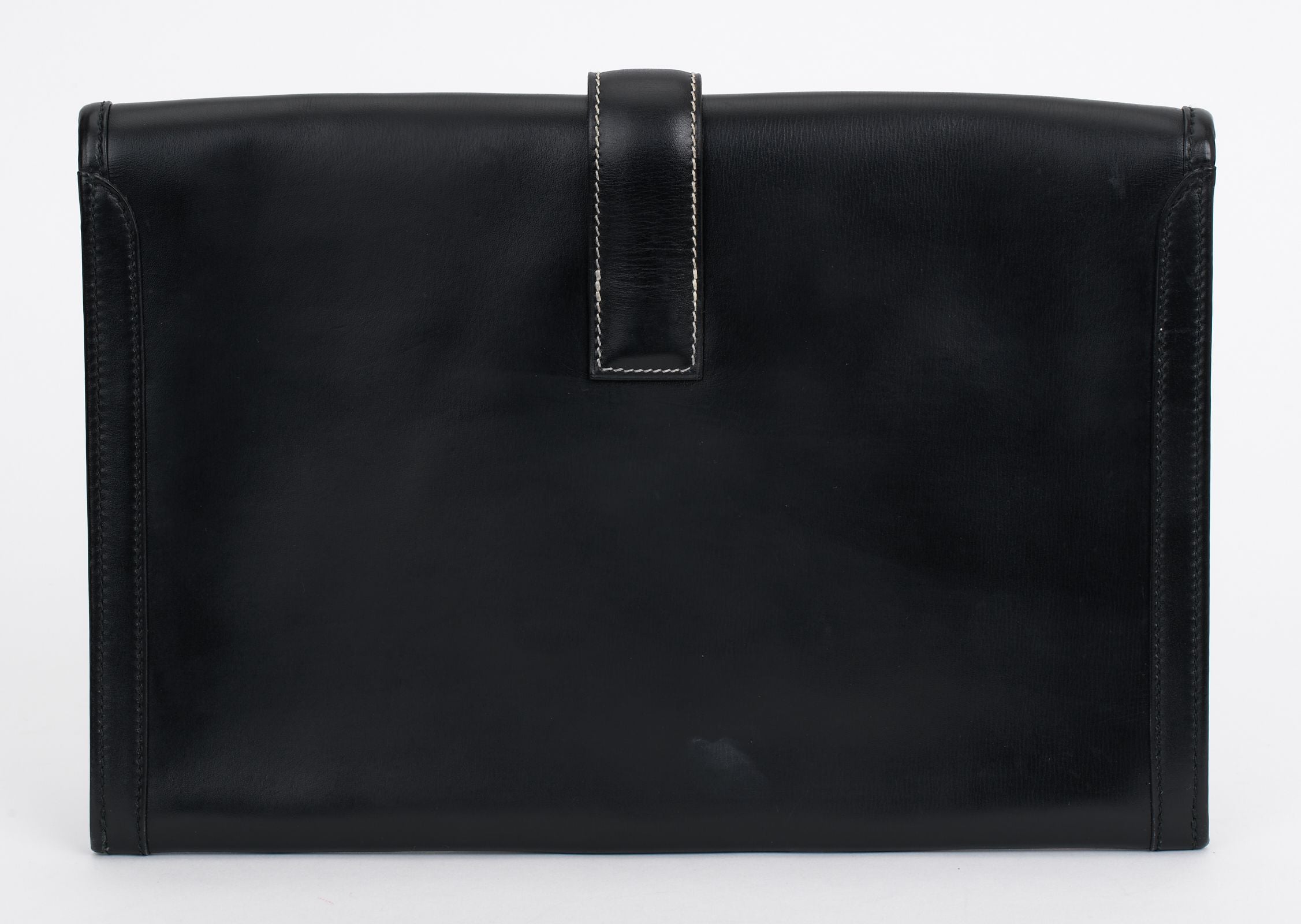 The Hermès Hand Painted Jige Clutch in black box calf leather features an art deco hand painted design, inspired by the Chrysler building in New York. Front strap flap H closure opens to a woven canvas lined interior. Clean corners and edges. The original, hand-painted design makes this piece a collectable. Comes with original dust bag and letter of certification.