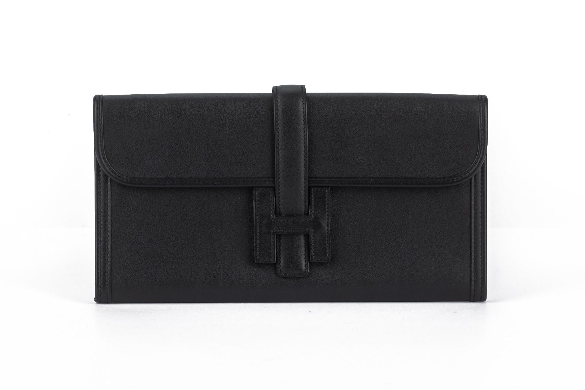 This Hermès Swift Jige Elan 29 Clutch in black features swift calfskin leather in black. It features a cross-over flap with a strap that tucks under a leather Hermes "H." This opens to a black leather interior. Comes with original dust cover.