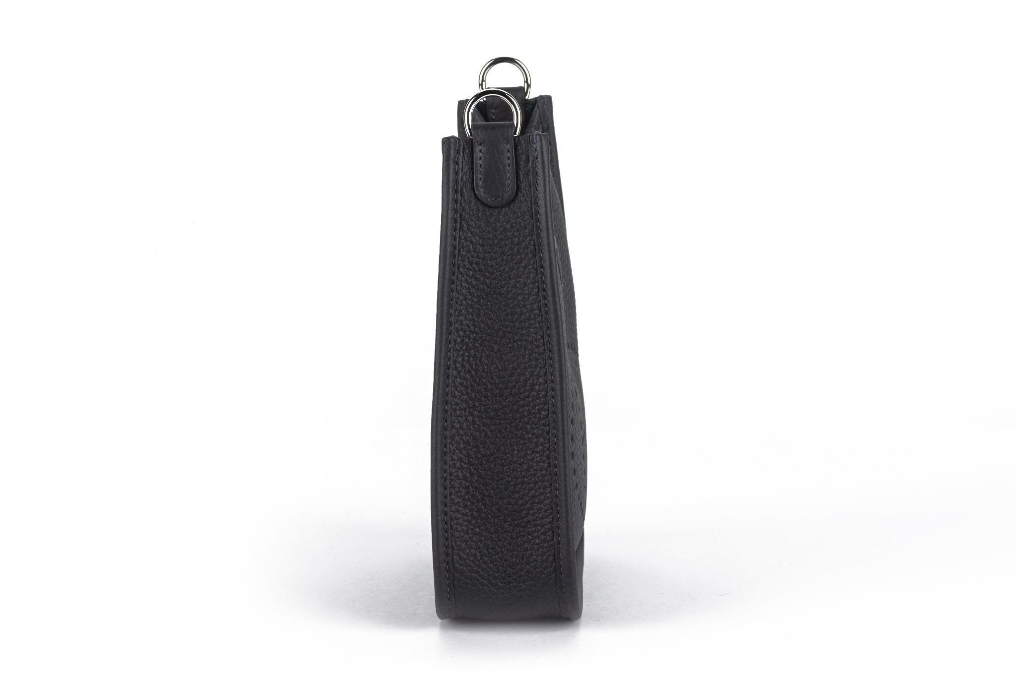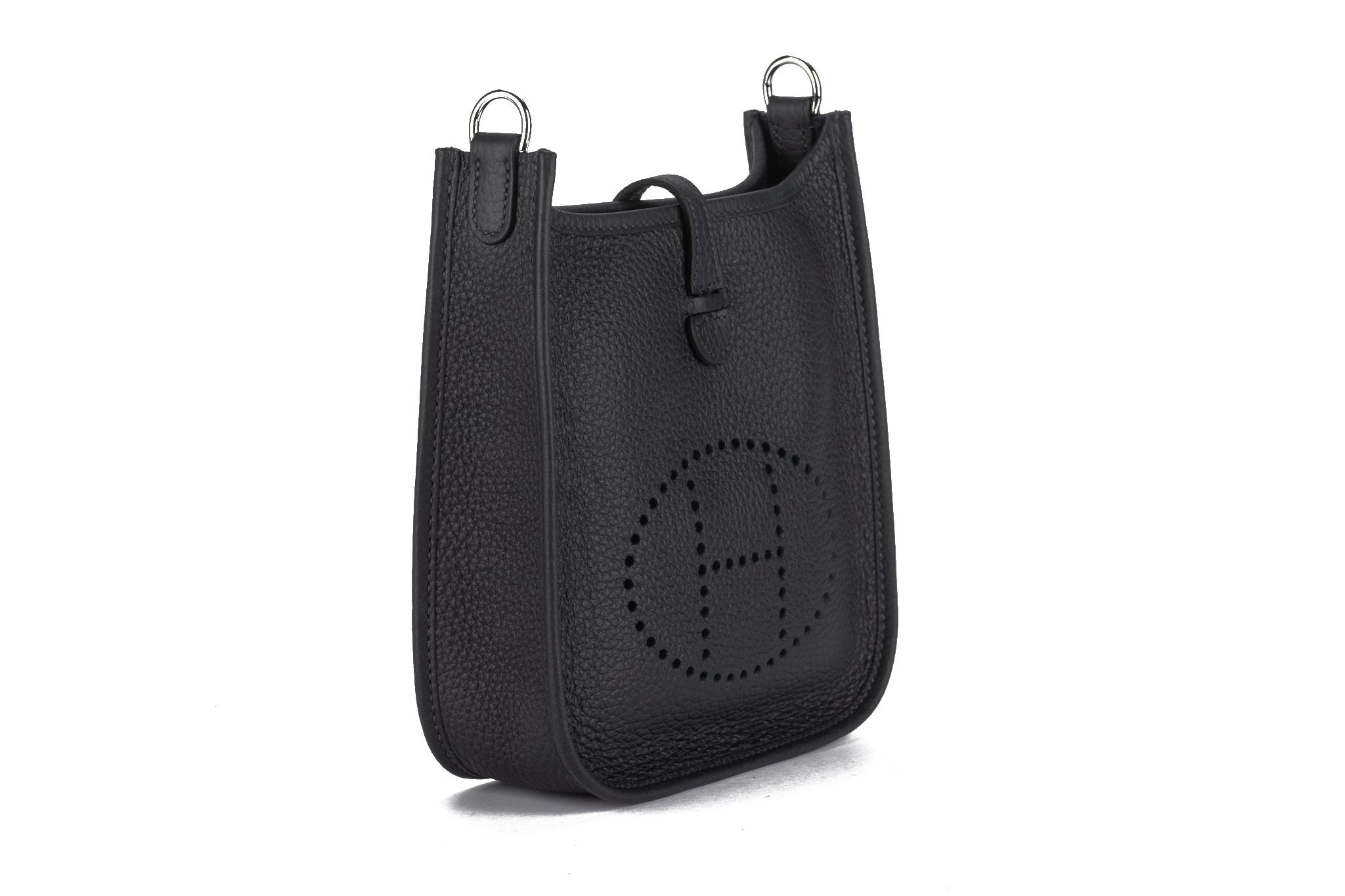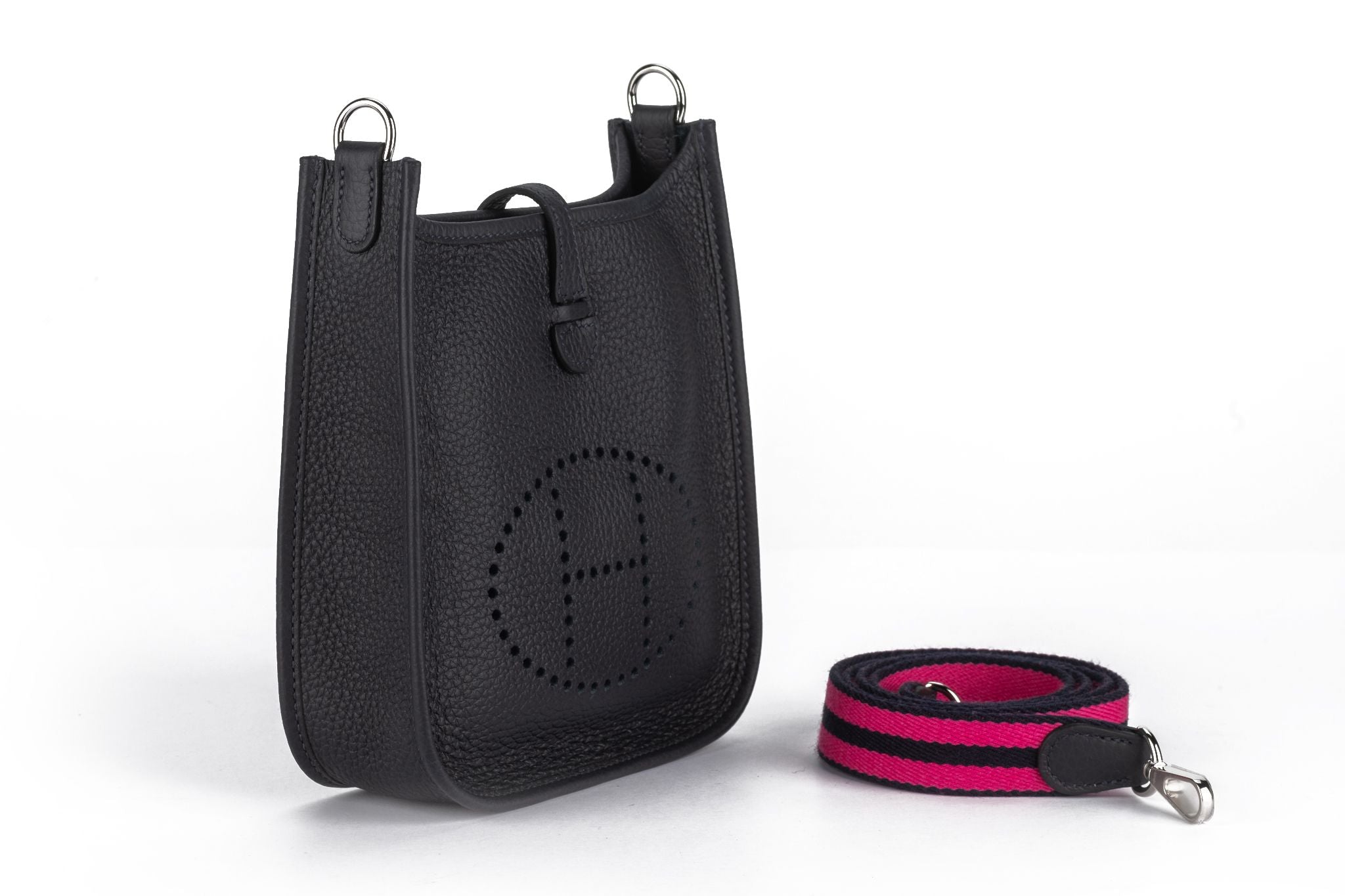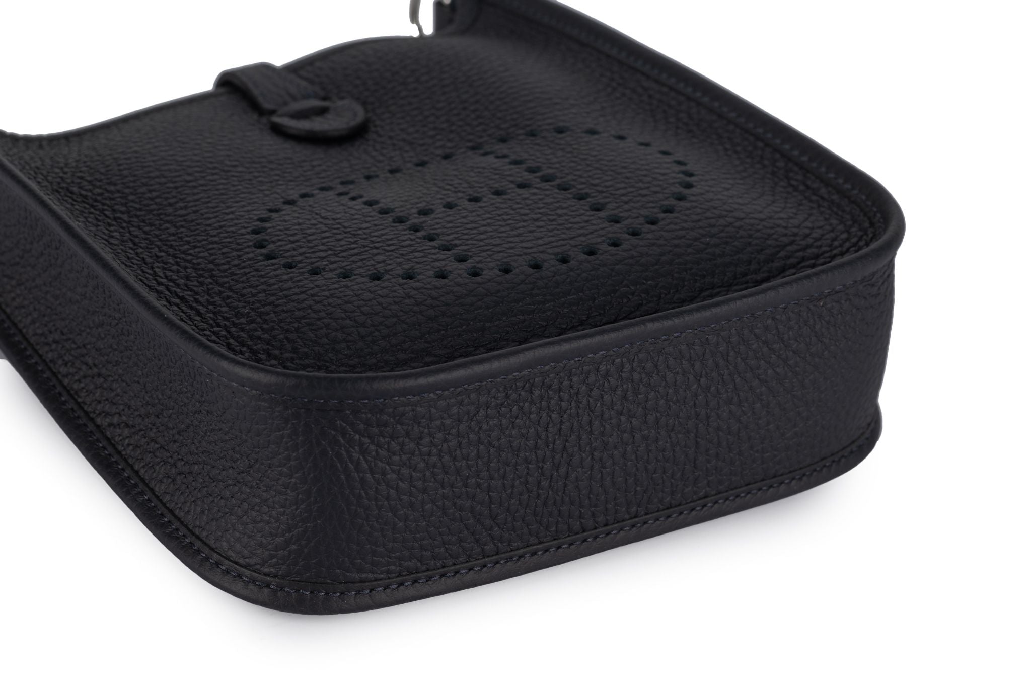 Hermès Mini Evelyne Bag in indigo blue taurillon clemence leather with palladium hardware and a wool bicolor shoulder strap. Shoulder drop, 22"L. Date stamp B for 2023. Comes with booklet, original dustcover and box.