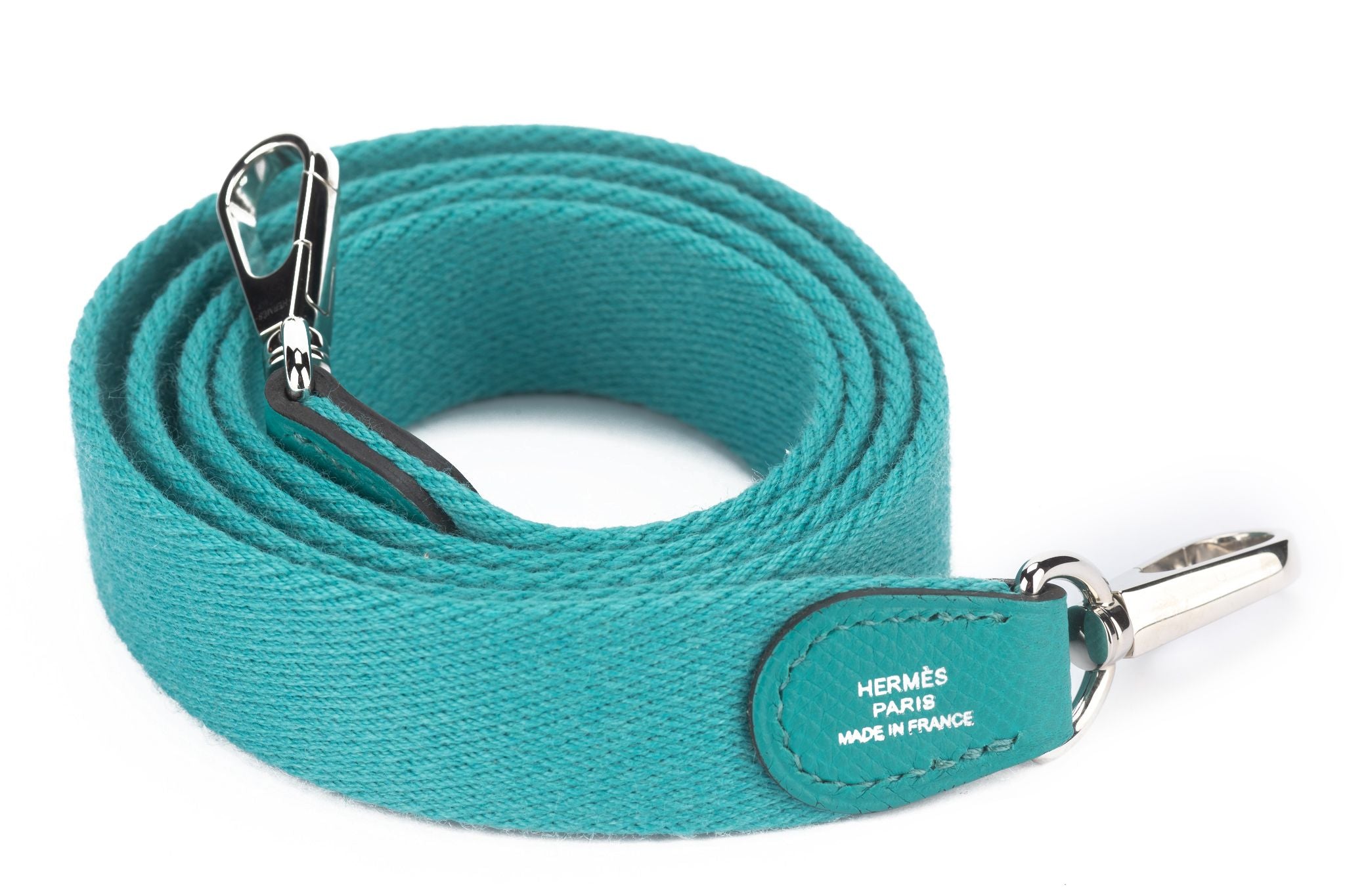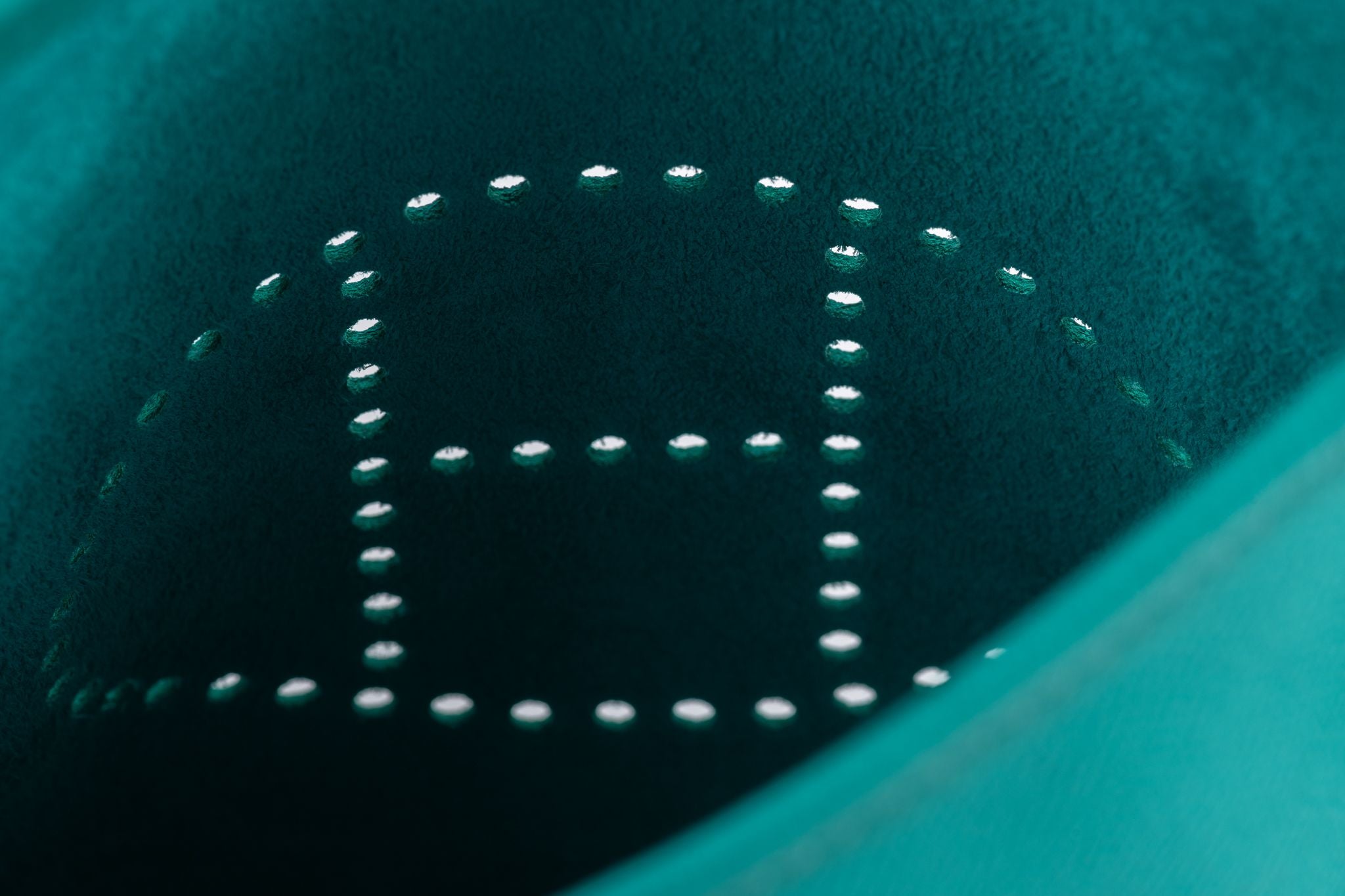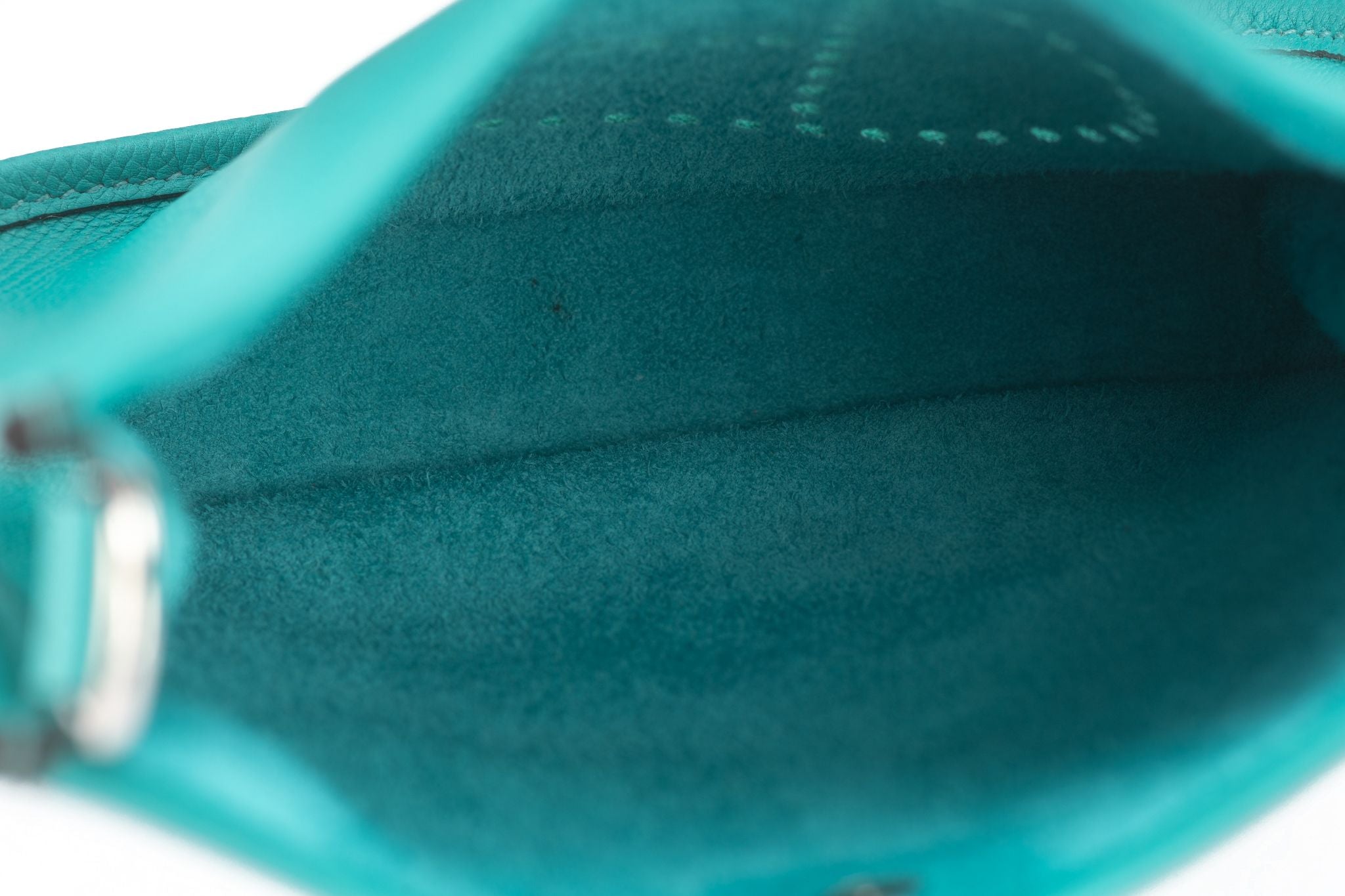 This mini Evelyne bag from Hermès has proven itself an iconic piece. This bag is featured in blue paon epsom leather, palladium hardware, and a perforated H logo on the front. Date stamp X. Comes with booklet, double dust cover and original box.
