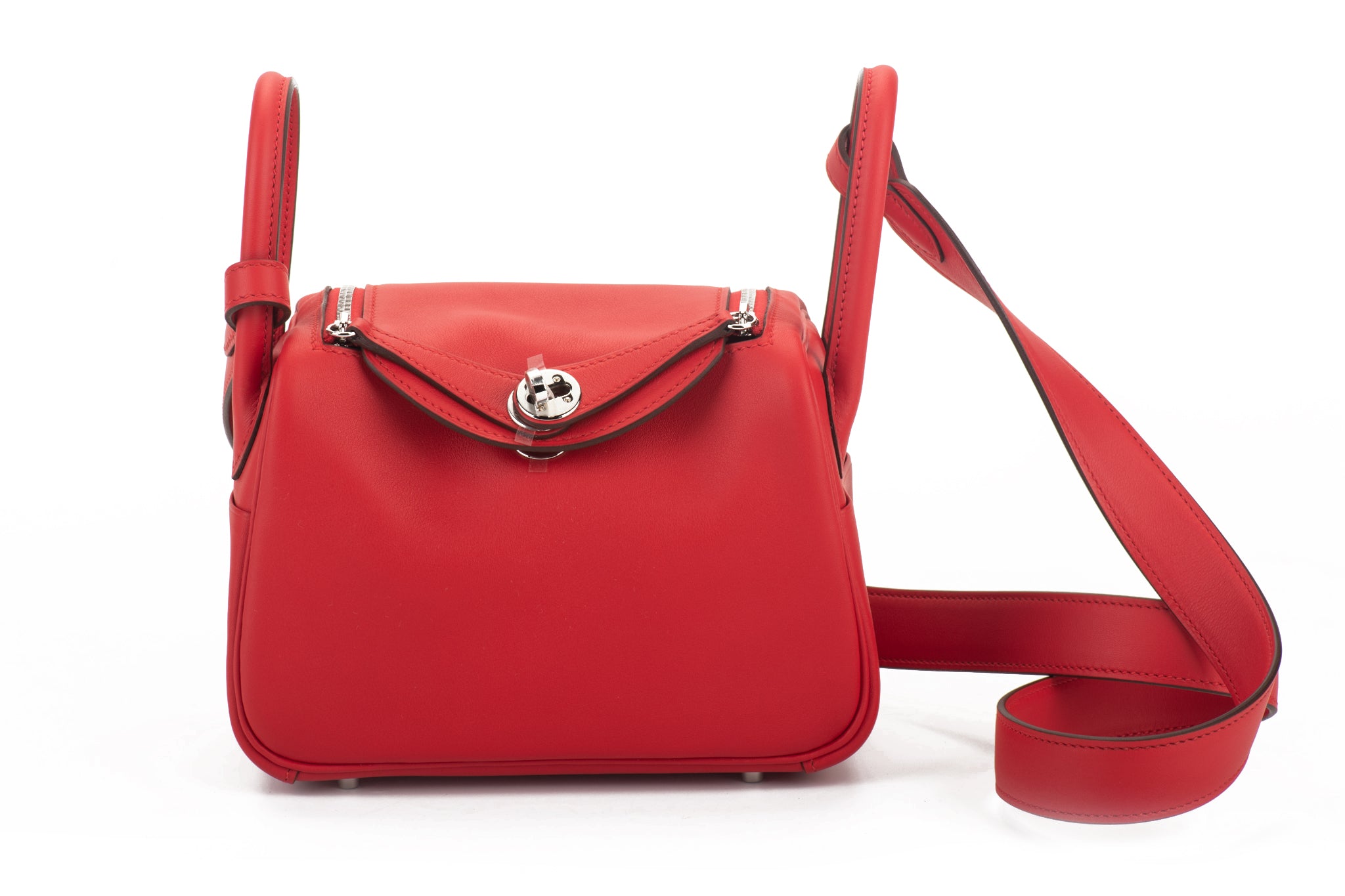 Hermes brand new in box mini lindy verso rouge de coeur et rouge pilent swift with palladium hardware. Date stamp Z, 2021. Coveted new size , can be worn in three ways, also cross body. Two interior pockets. Comes with dust cover and original box.