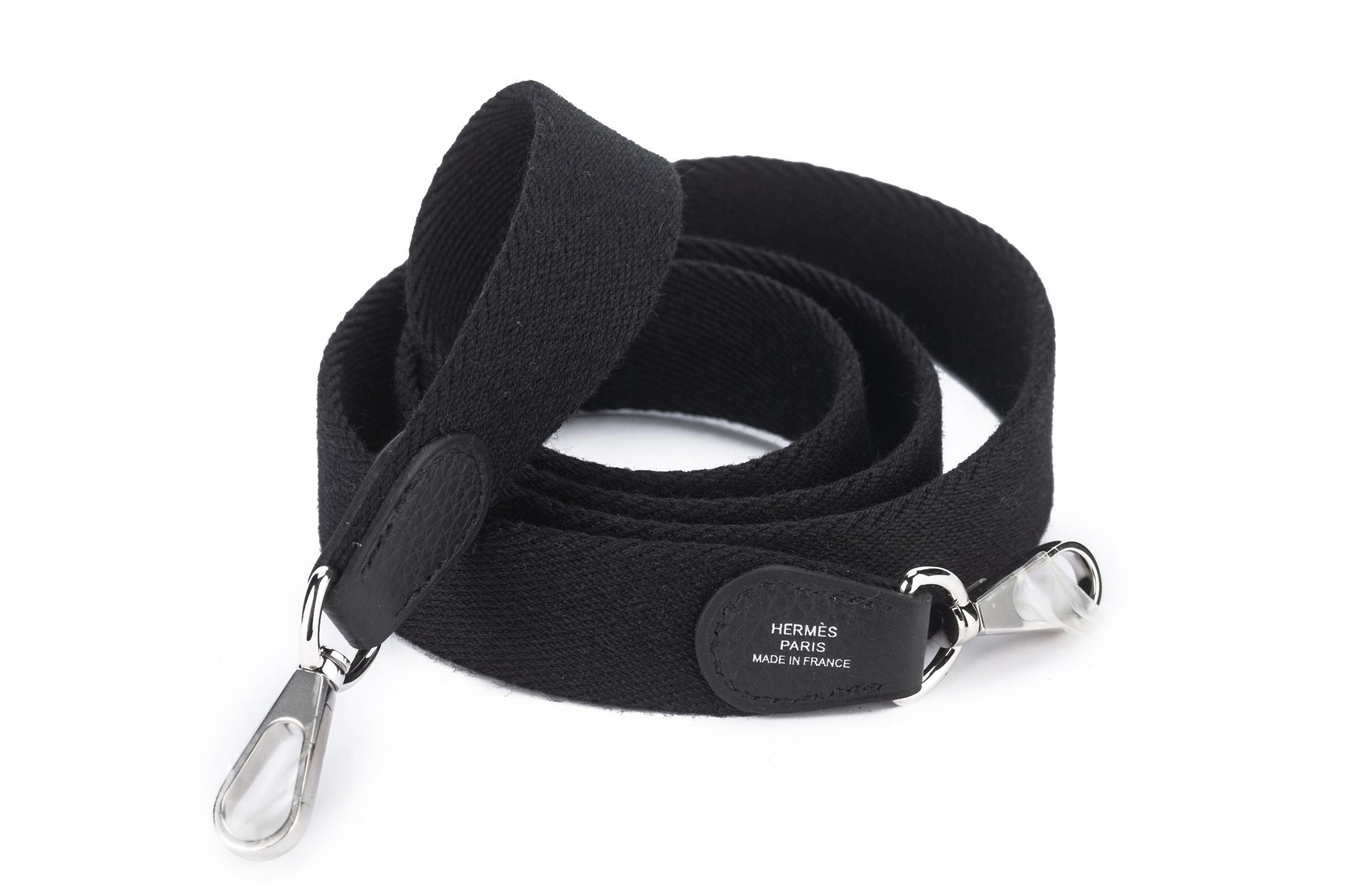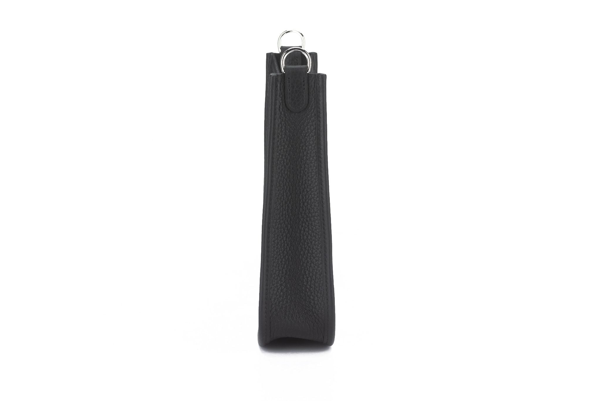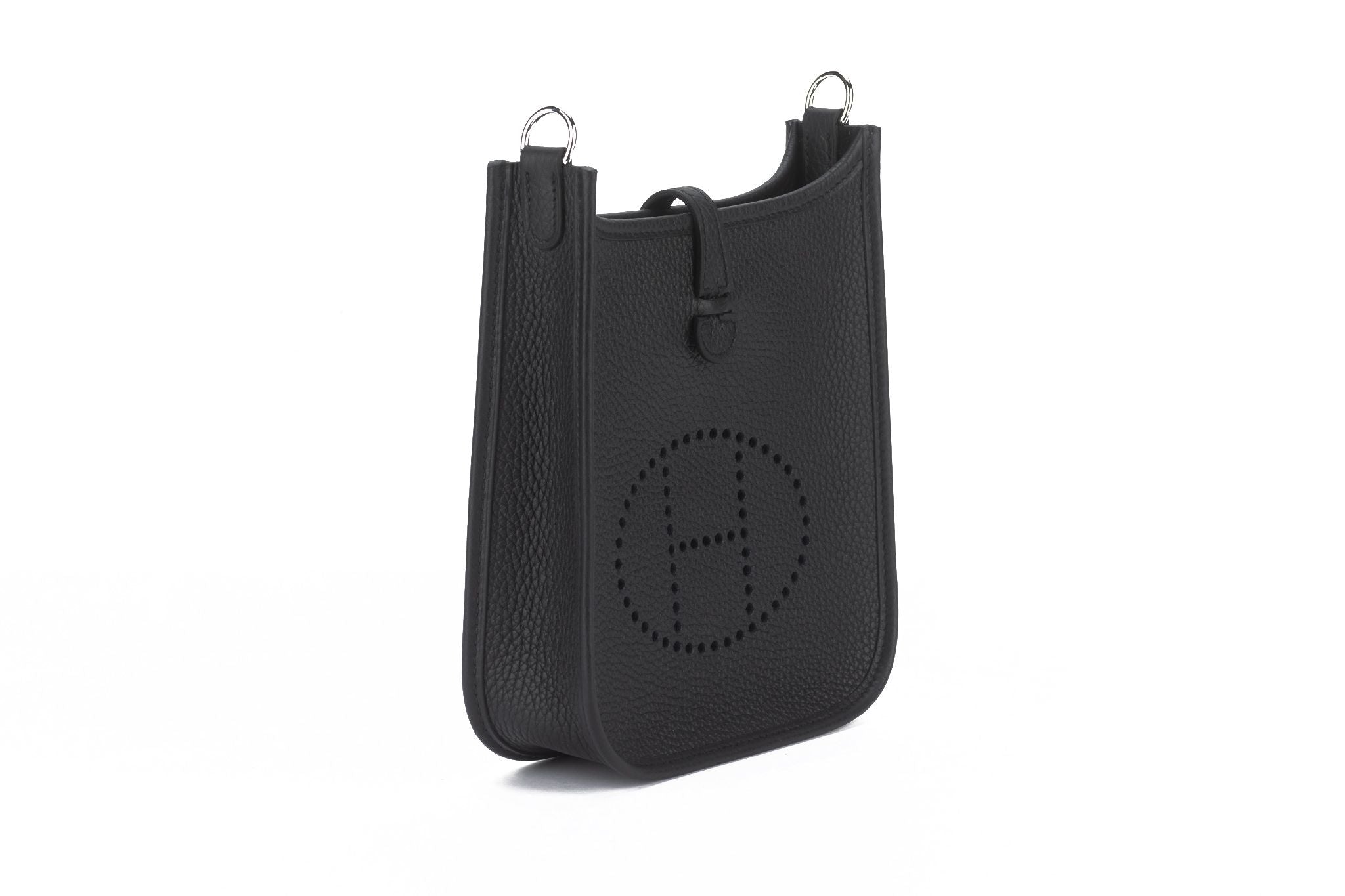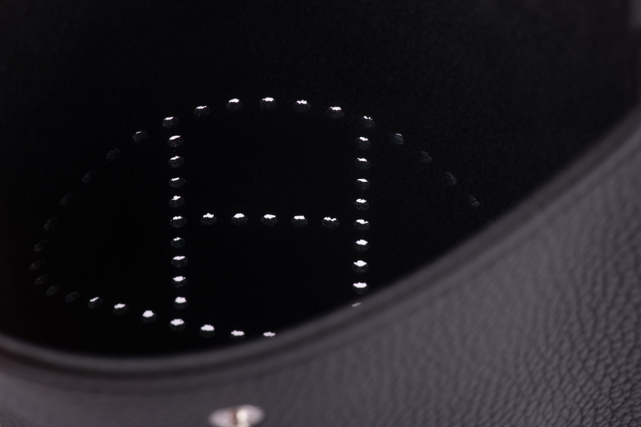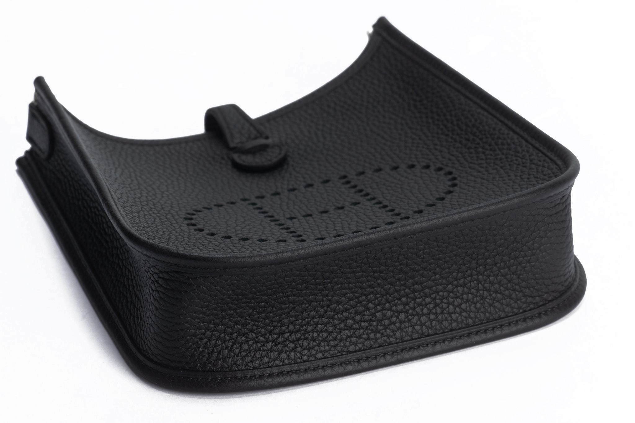 This Hermès Clemence mini Evelyne in black is a classic small shoulder bag with a front perforated Hermes "H" oval. The crossbody bag features a black canvas shoulder strap with polished palladium hardware. The top crossover strap and snap open to an interior of black suede. Brand new, comes with the double original dust cover and box. Date Stamp - W.