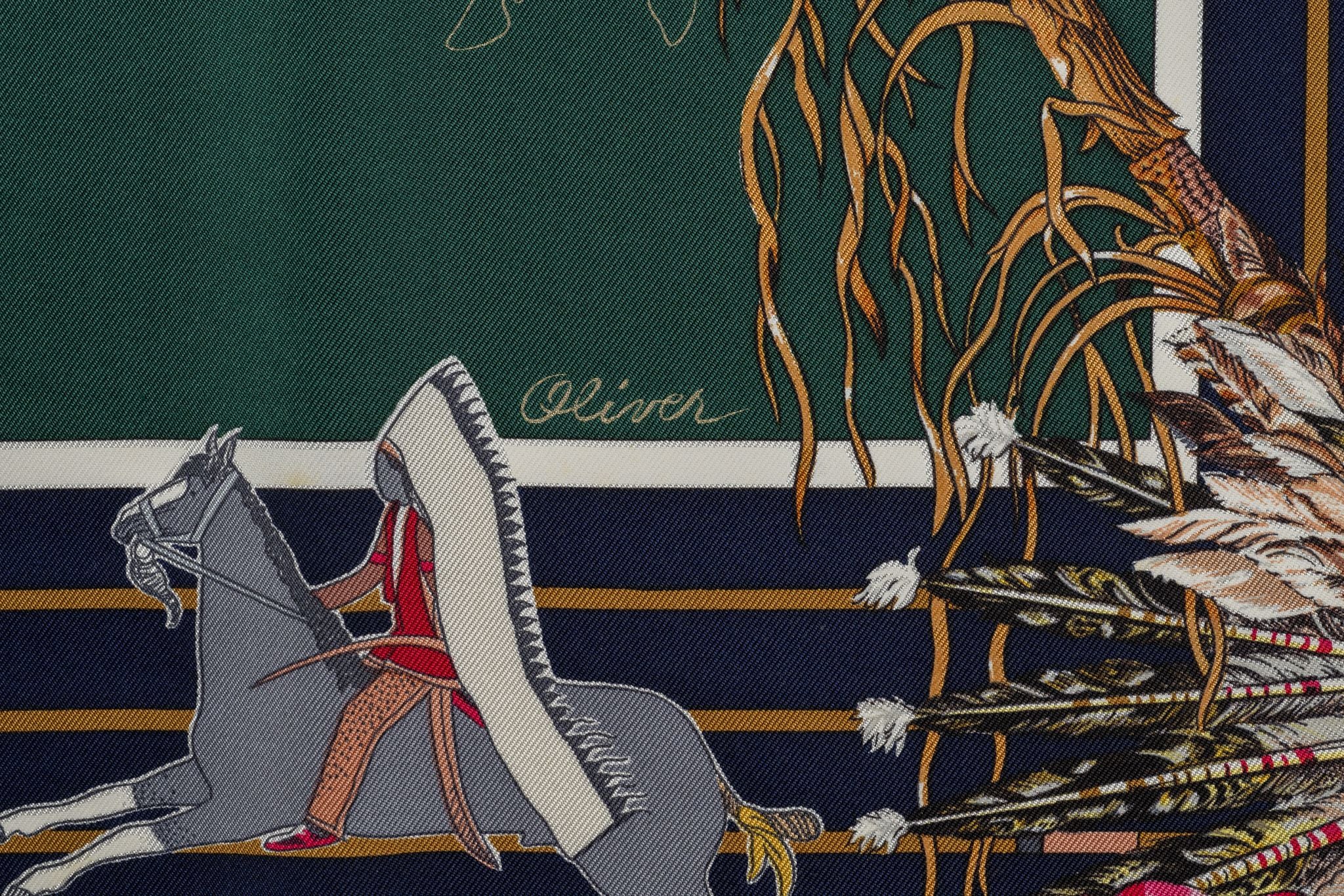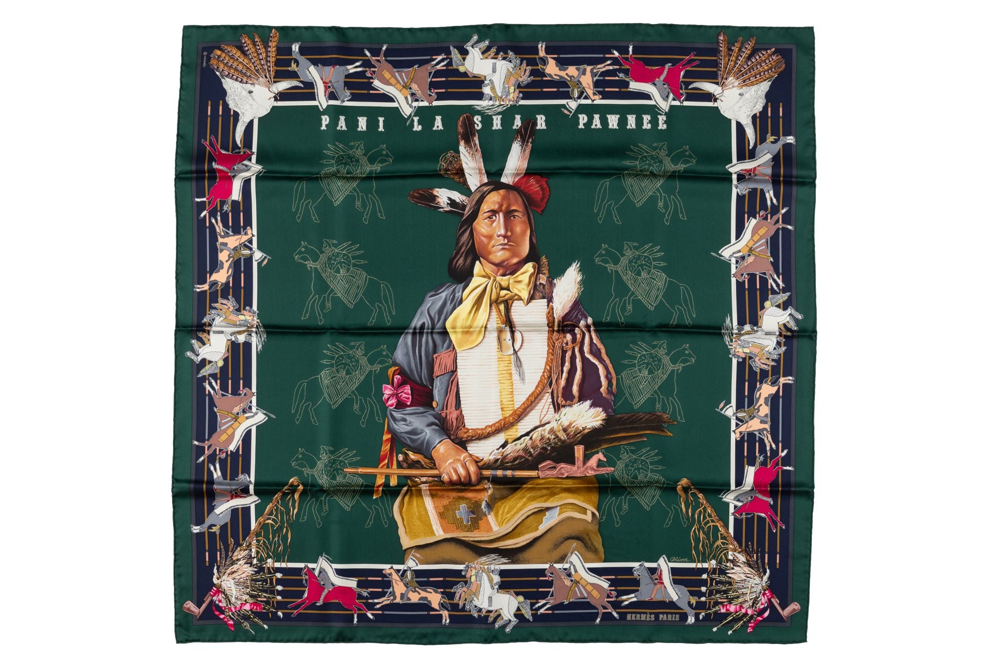 Hermès Omani La Shar Pawnee silk twill scarf originally issued in 1984. Designed by Kermit Oliver, the most famous painter of Texas natives images. Hand rolled edges. Comes with original box and ribbon.