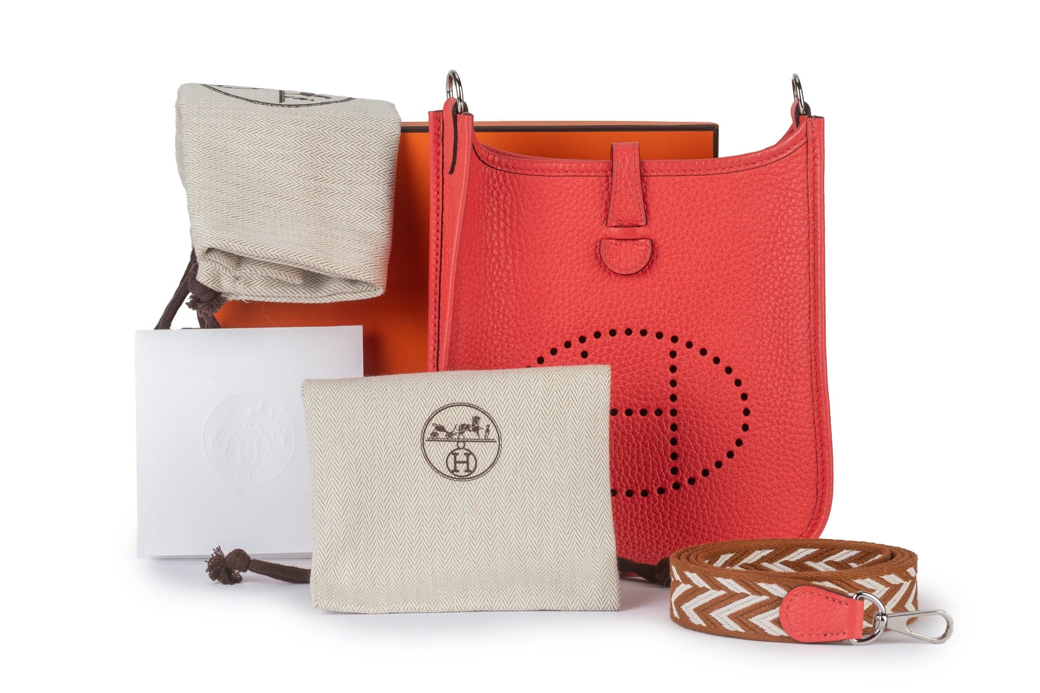 This Hermès Mini Evelyne Bag features rouge pivoine Clemence leather, palladium hardware, a detachable contrast color flat strap, and an open top with a tuck closure and perforated “H” logo on the front. Comes with booklet, original dustcover and box. First letter B.