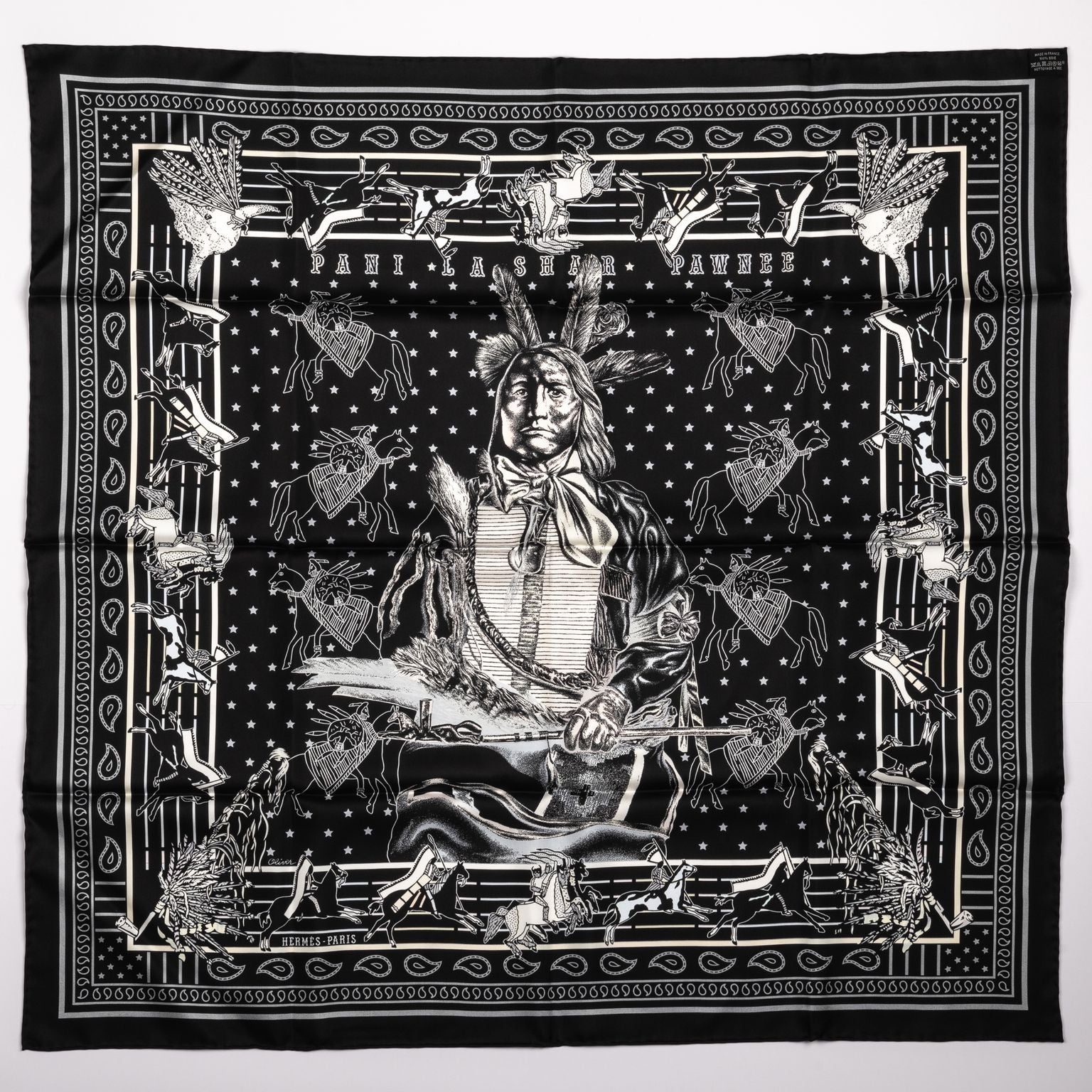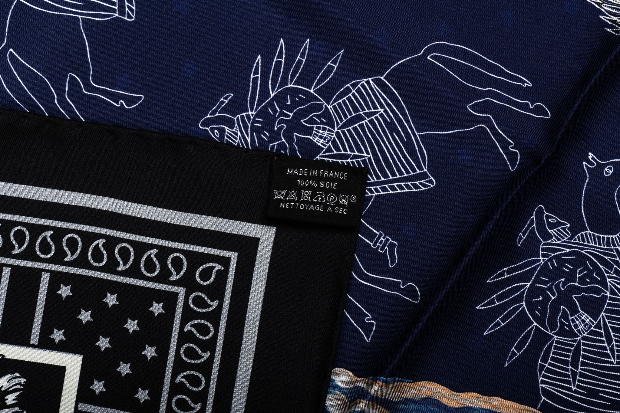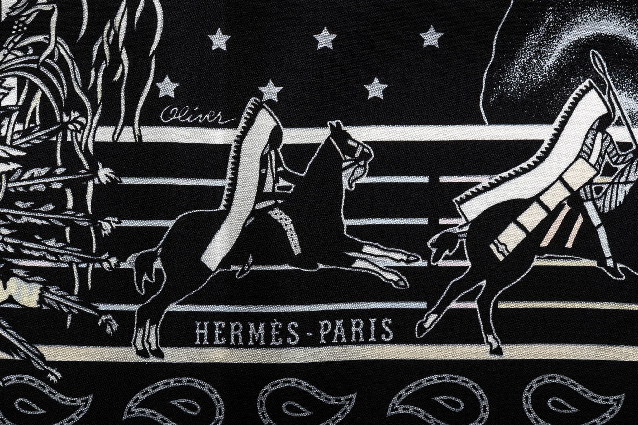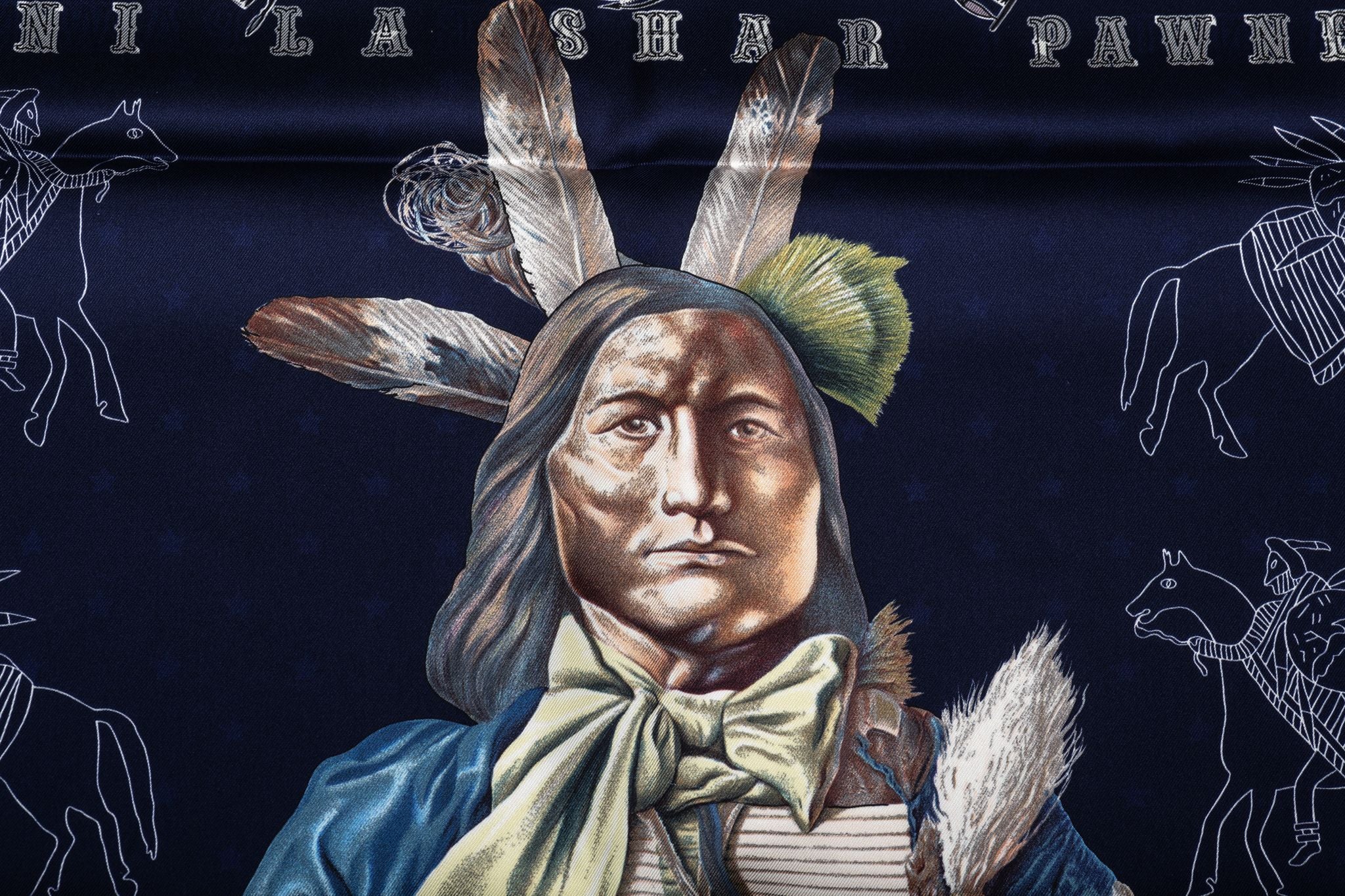 Hermès silk twill Pani La Shar Pawnee 90cm scarf in black with blue color. Designed by artist Kermit Oliver. Limited edition reissue "bandana" with reverse black and white design. Brand new with box .