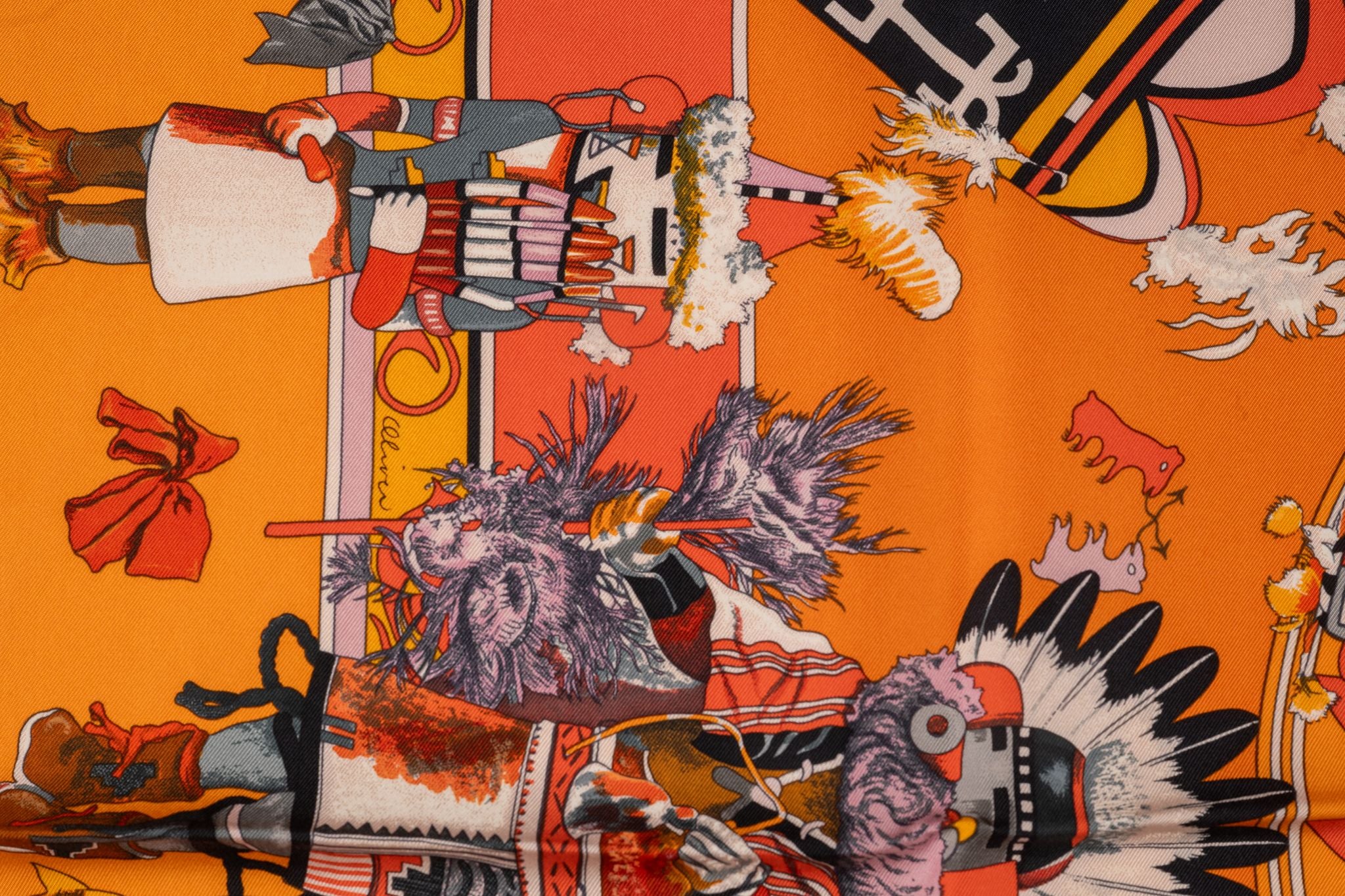 This Hermès "Kachinas" Scarf is in orange, designed by Kermit Oliver, and features rolled edges. Excellent condition. Rare color combination.