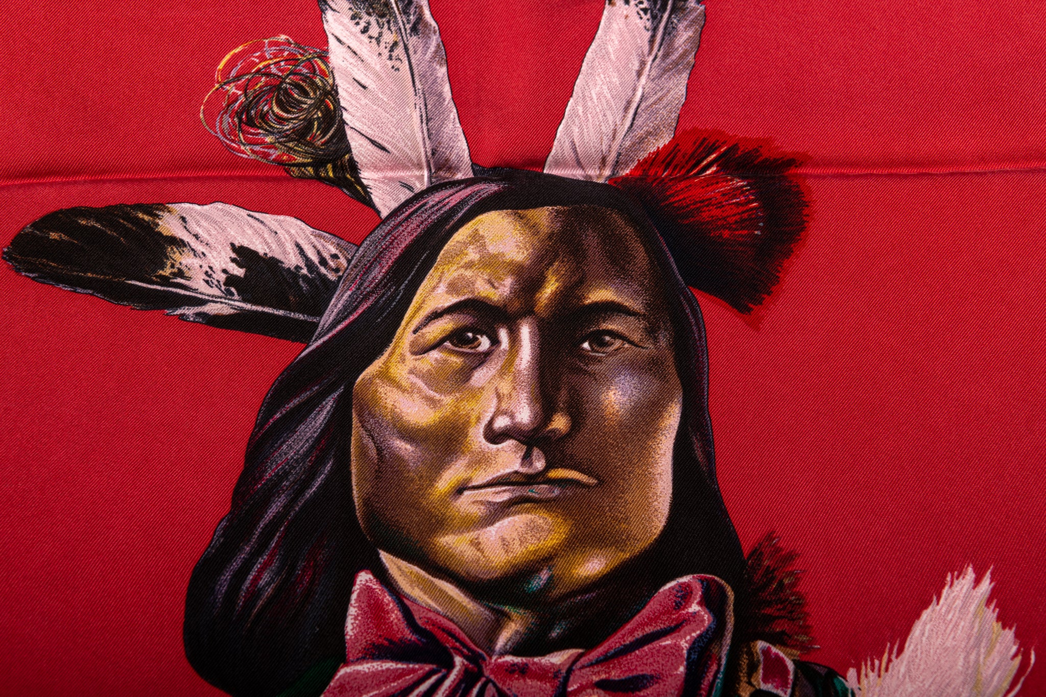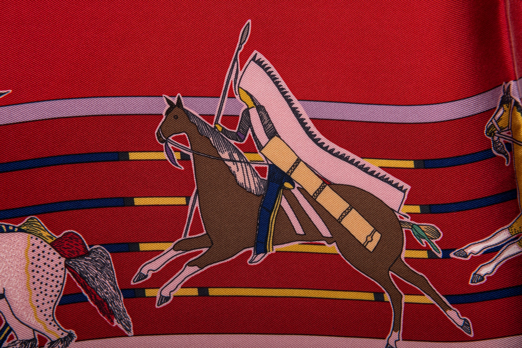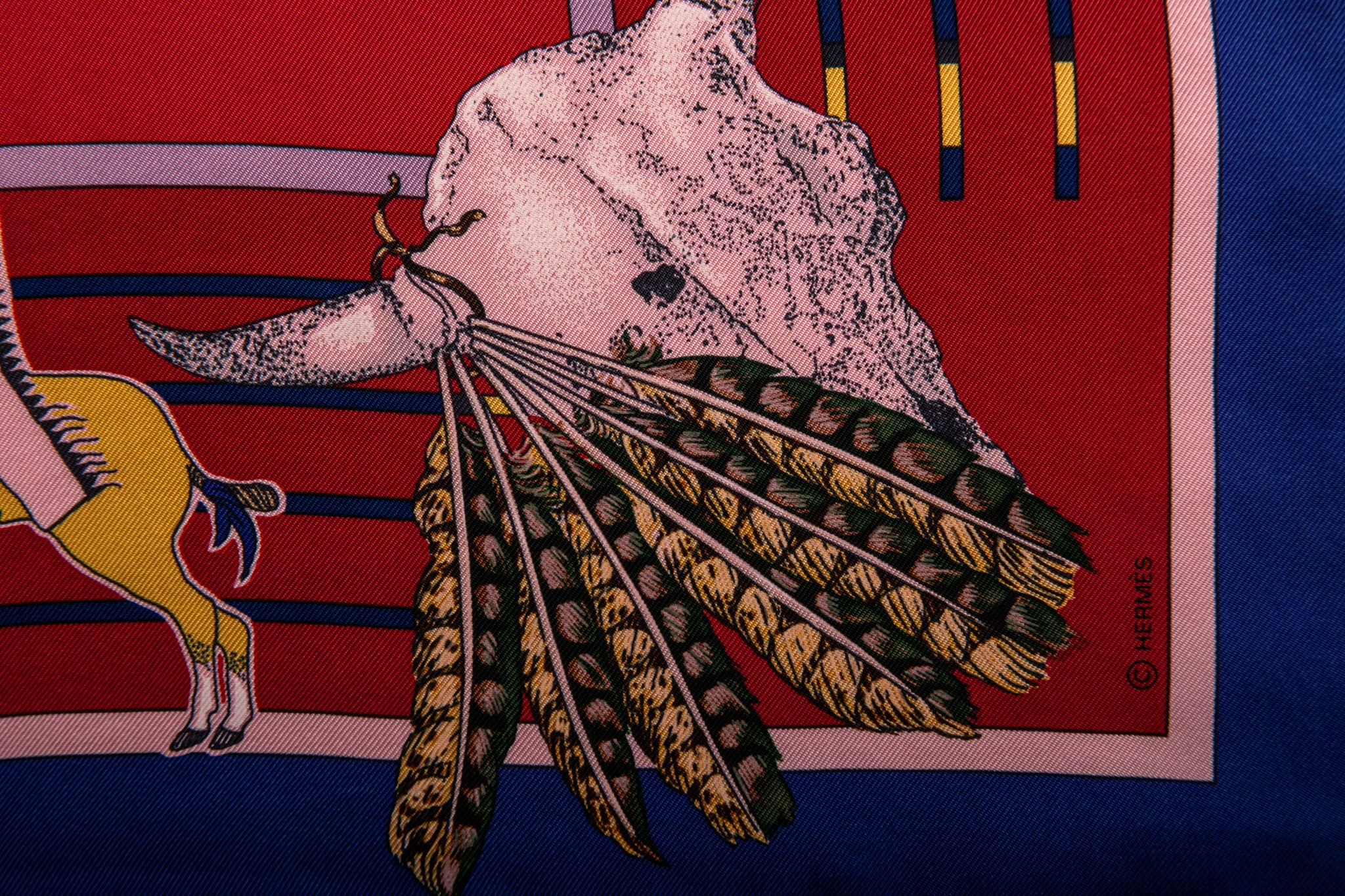 Hermès reissue Pani la Shar Pawnee scarf designed by Kermit Oliver. Hand-rolled edges. Brand new with box.