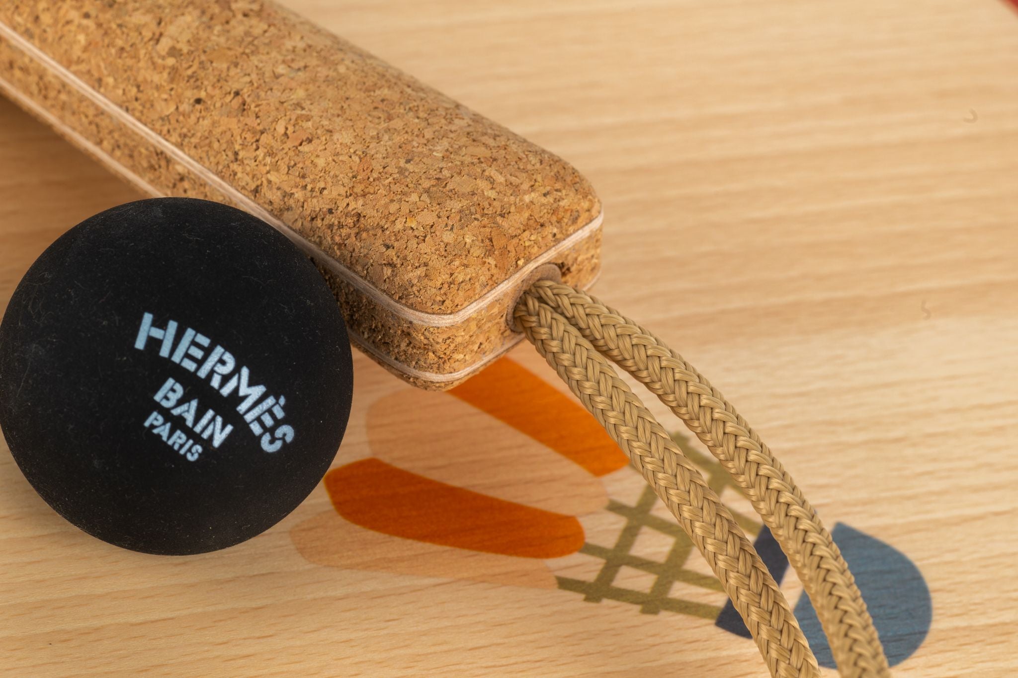 Hermès brand new in box set of 2 beach rackets in printed beechwood and cork, rubber ball, dust cover and box included.