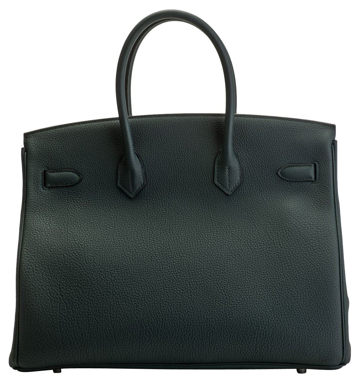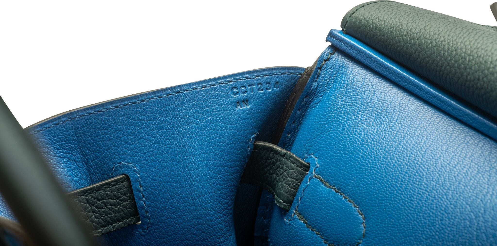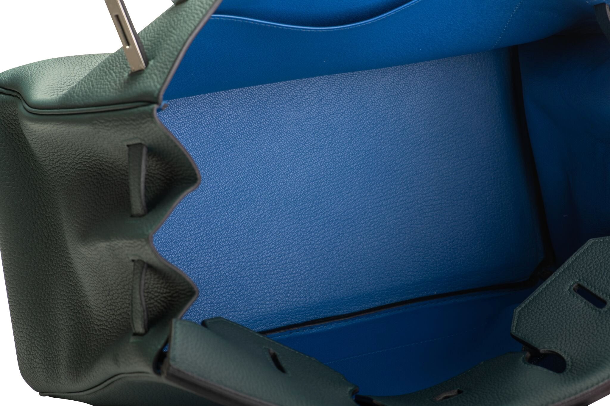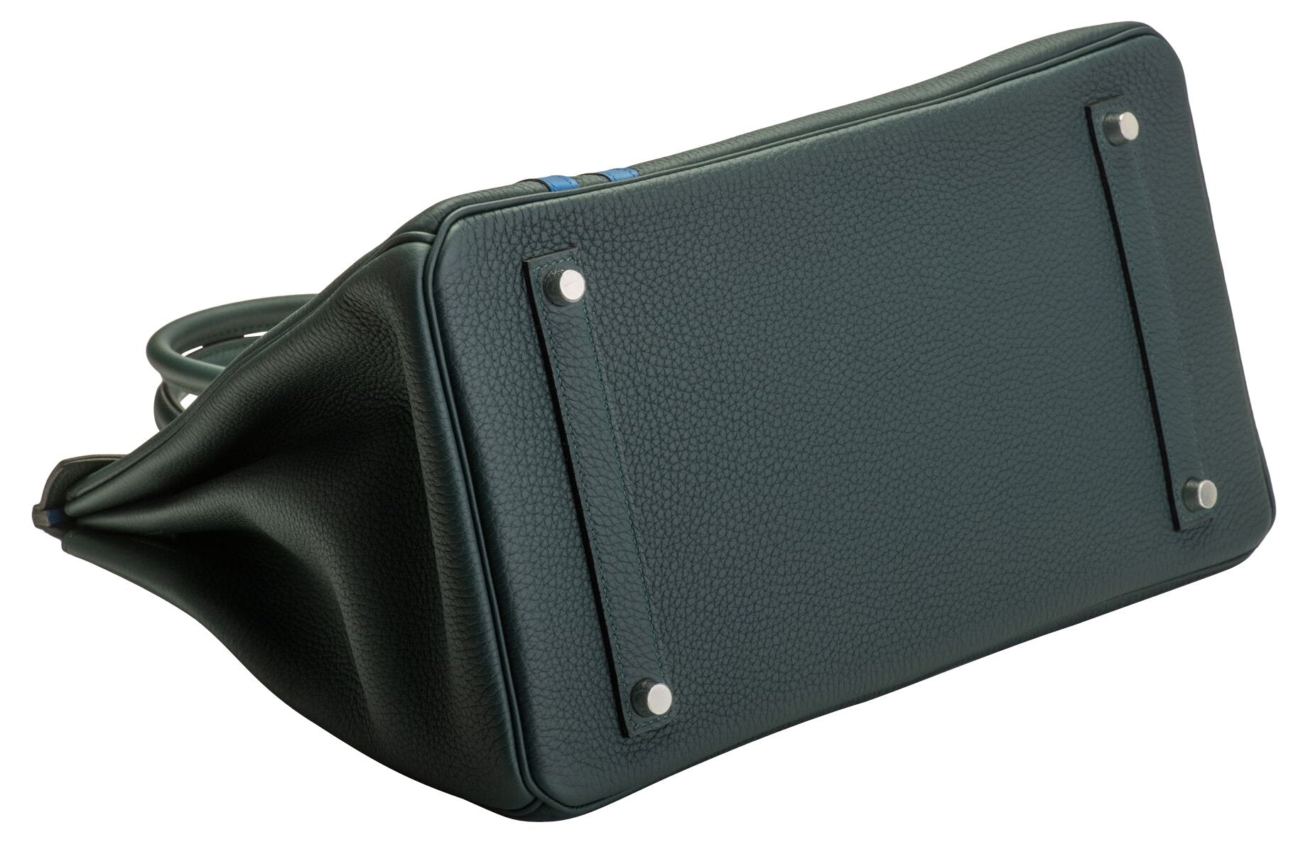 Hermès 35cm Officier Birkin in vert cypress Togo leather with blue zellige swift stripes and interiors. Palladium hardware. Date stamp C for 2018. Comes with the full set: rain jacket, lock, two keys, clochette, tirette, booklet, box, ribbon, and shopper.