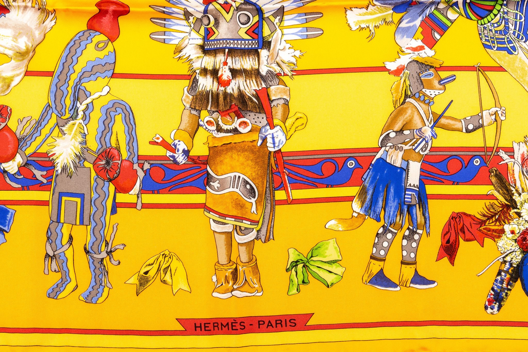 Hermès collectible yellow silk twill Kachinas scarf designed by Kermit Oliver. Hand-rolled edges. Excellent condition. No box, with composition and care label.