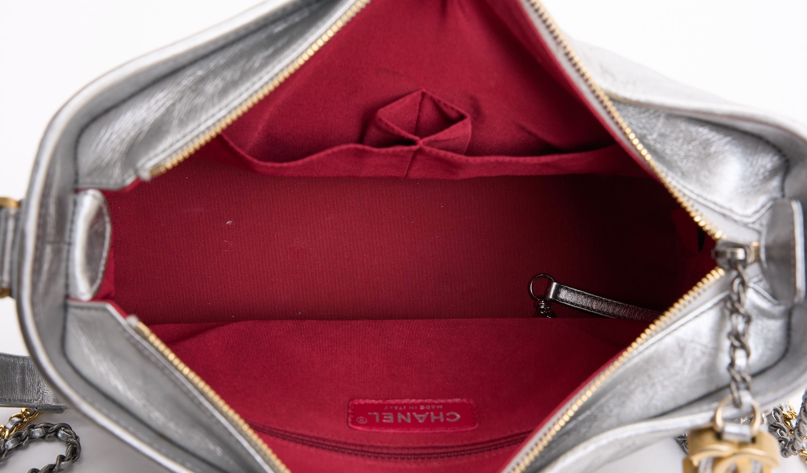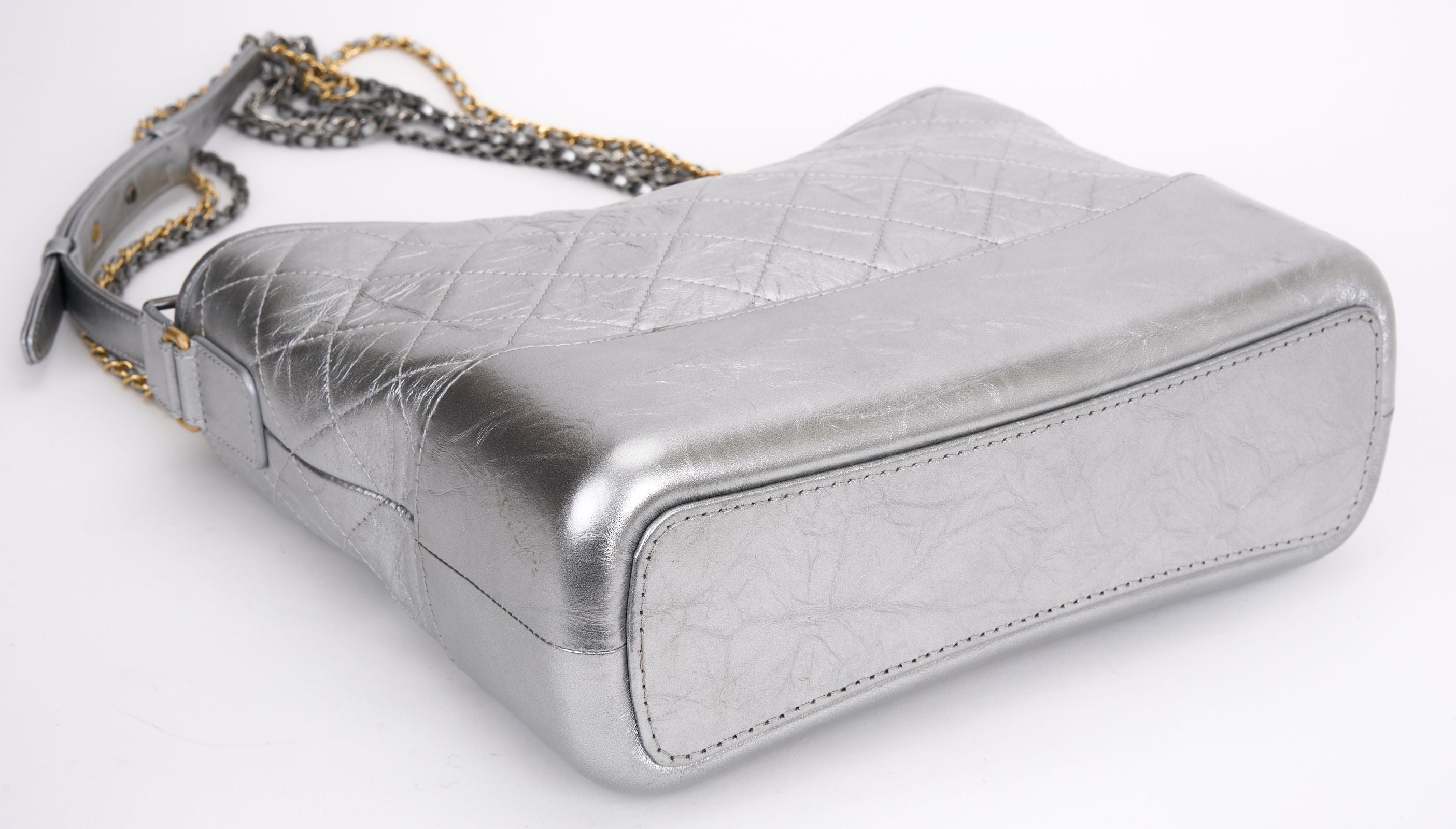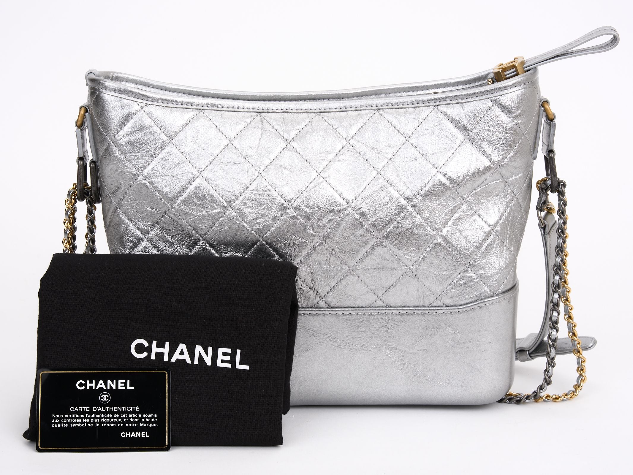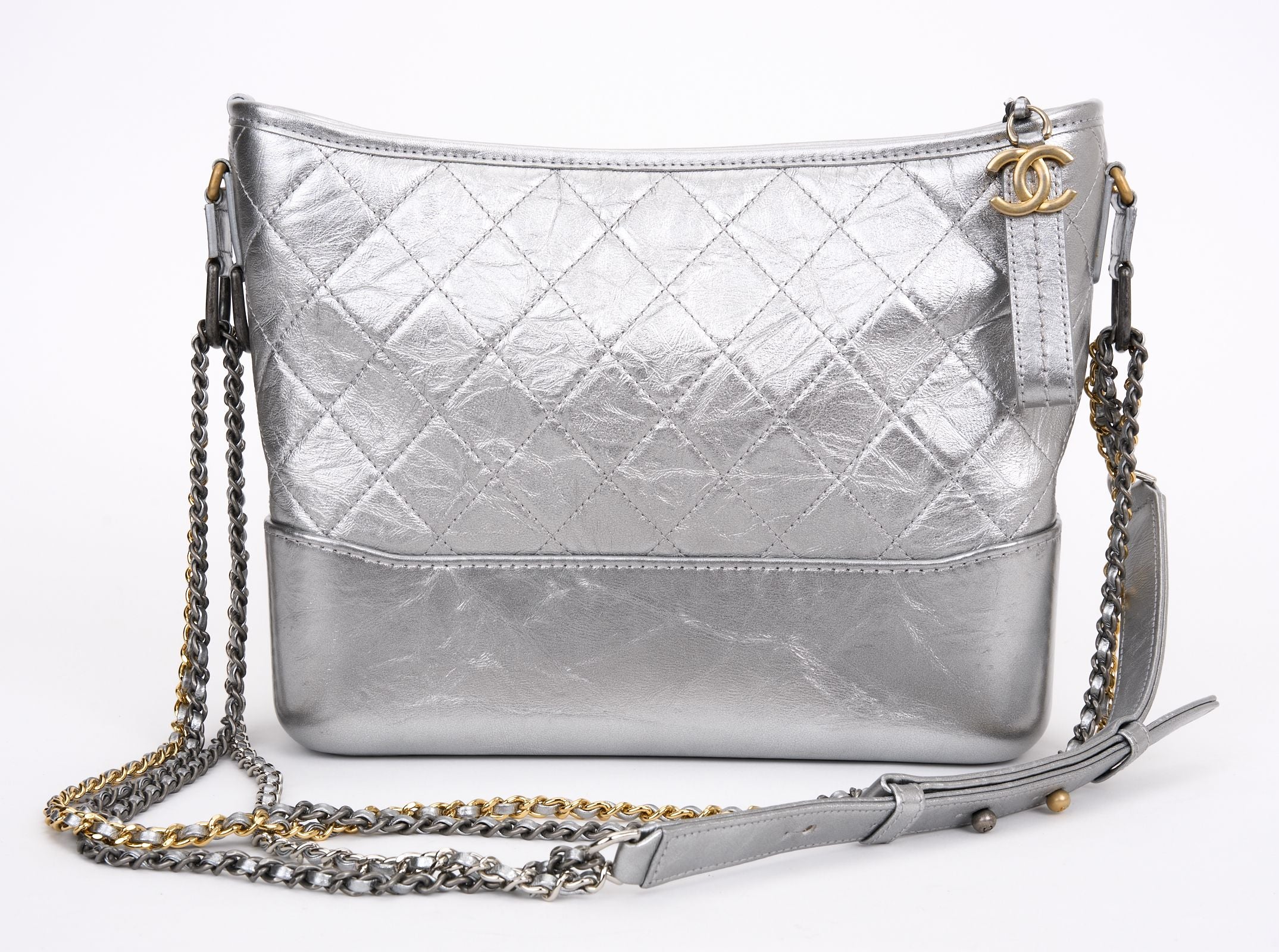 This Chanel Metallic Aged Calfskin Gabrielle bag features hardware in gold and silver metal, and a double chain strap allowing the bag to be worn on the shoulder or across the body. A zip closure opens up to an interior lining in red canvas, one zip pocket, a double patch pocket, and a lipstick pocket. Dust Cover and ID card included. Hologram first two numbers are 24 Strap Drop - 16.5".