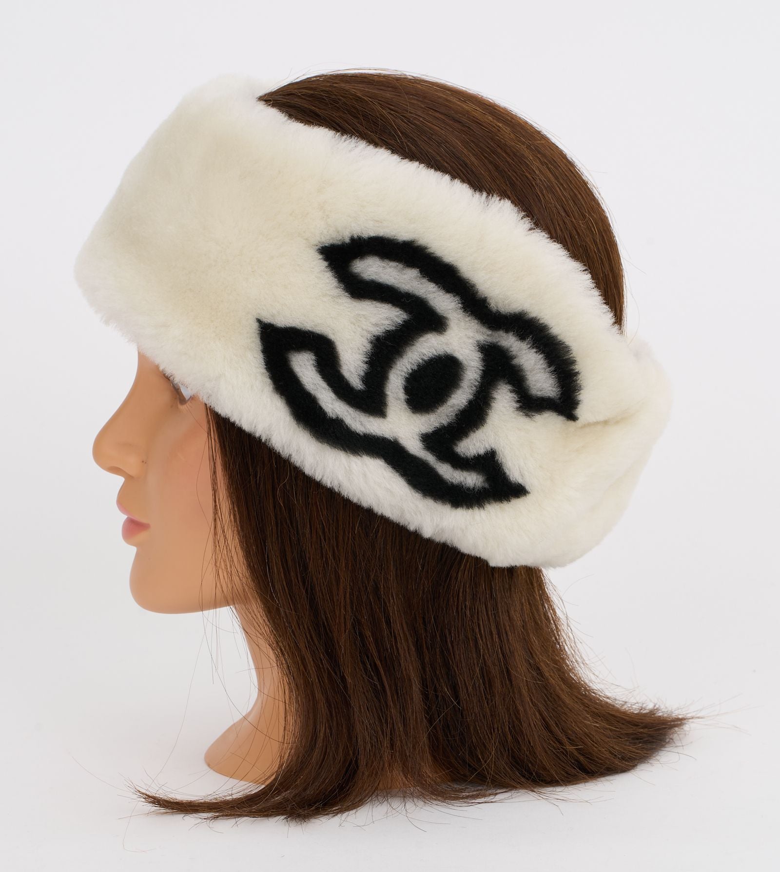 This white and black Chanel headband made out of shearling. The CC logo in black is featured on both sides of the band. The perfect pieces for your next ski vacation.