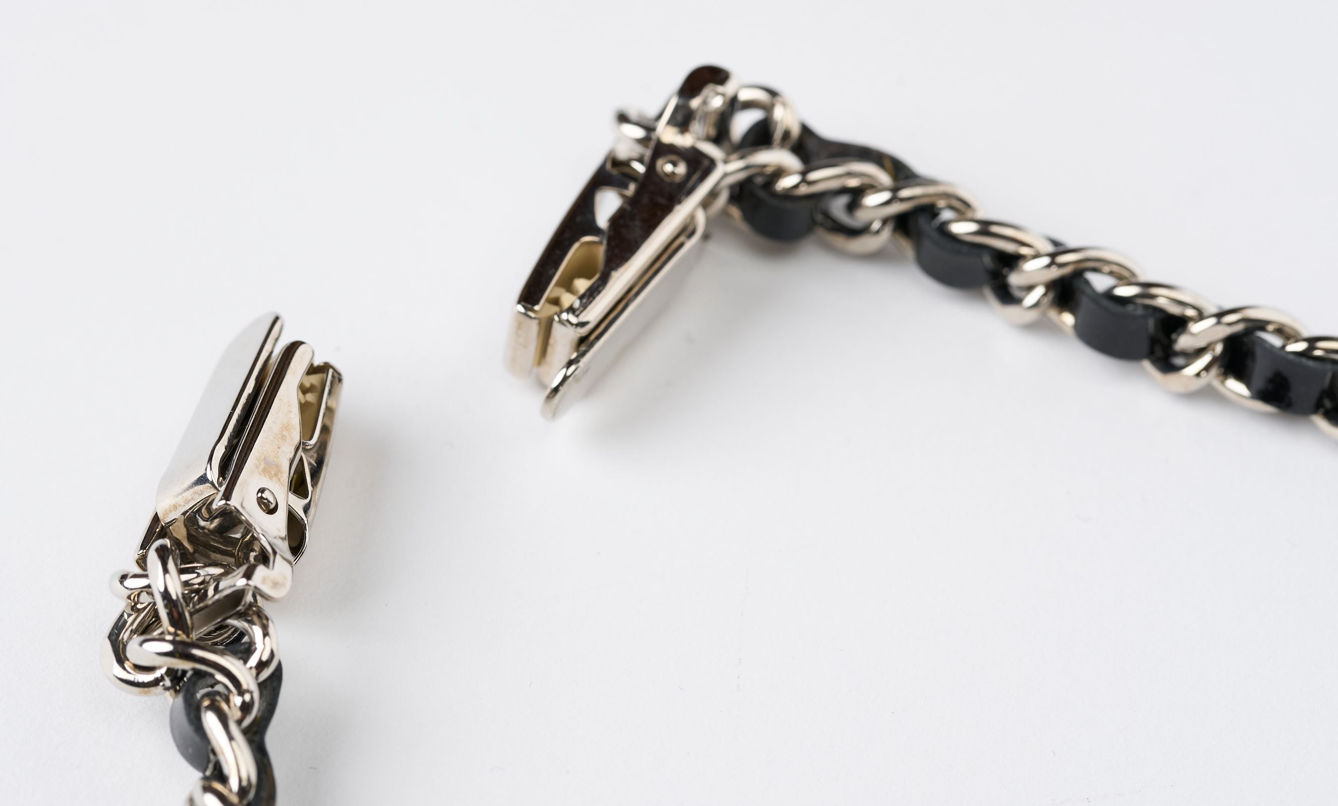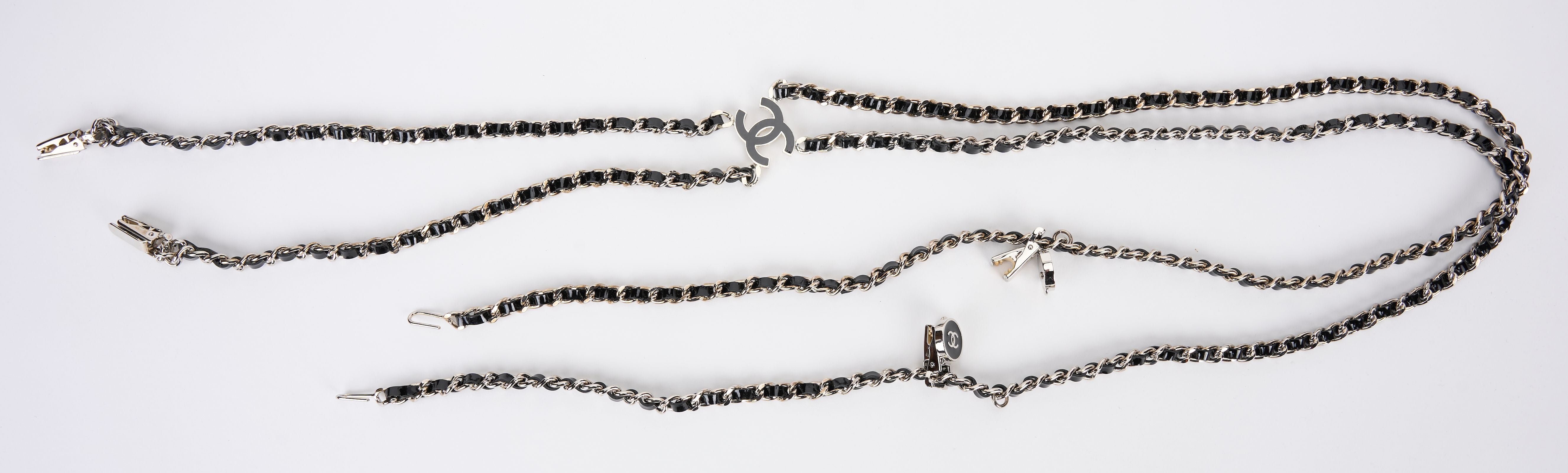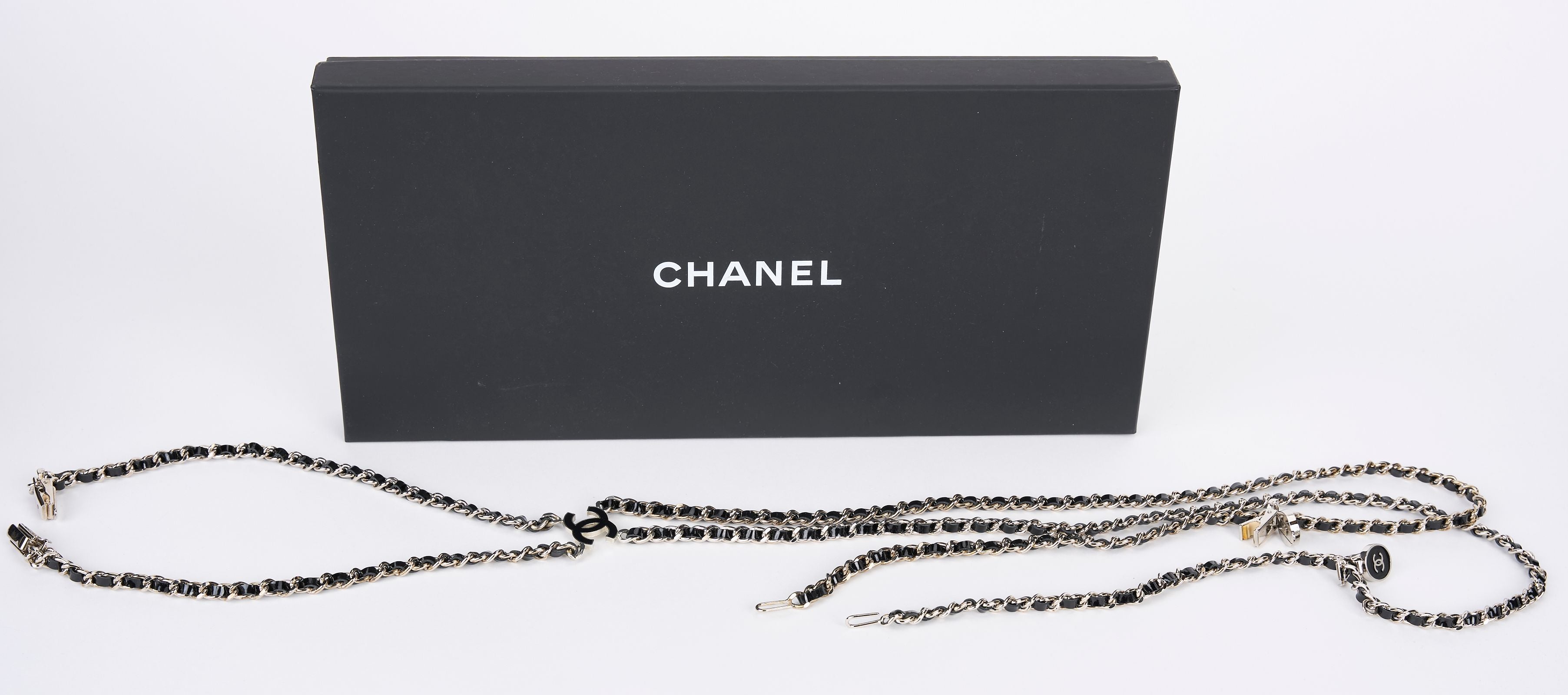 Chanel rare and collectible silver tone suspenders with black woven leather . Adjustable length with two cc logo cursors. Comes with original tag, booklet and box.