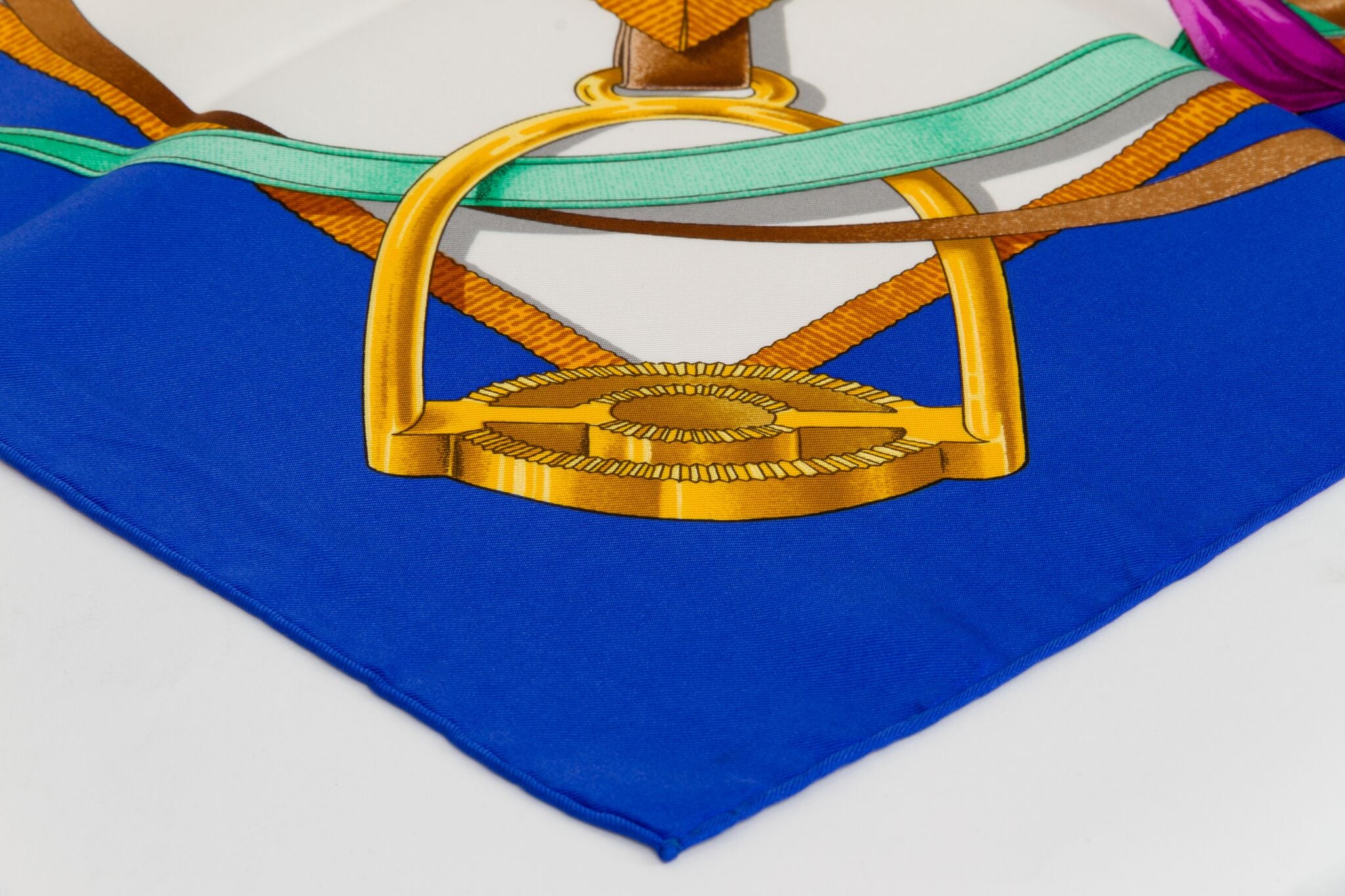 Hermès blue "Grand Manege" silk twill scarf. Hand'-rolled edges. Excellent condition.