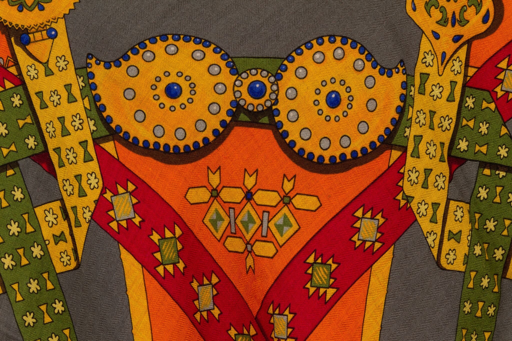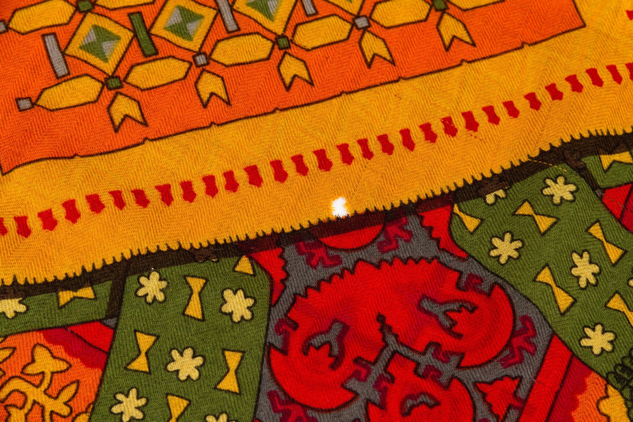 Hermès 54" square cashmere-and-silk blend Brins d'Or shawl designed by Julia Abadie. Originally issued in 1982. Green, gold, red and beige colorway. Hand-rolled edges.