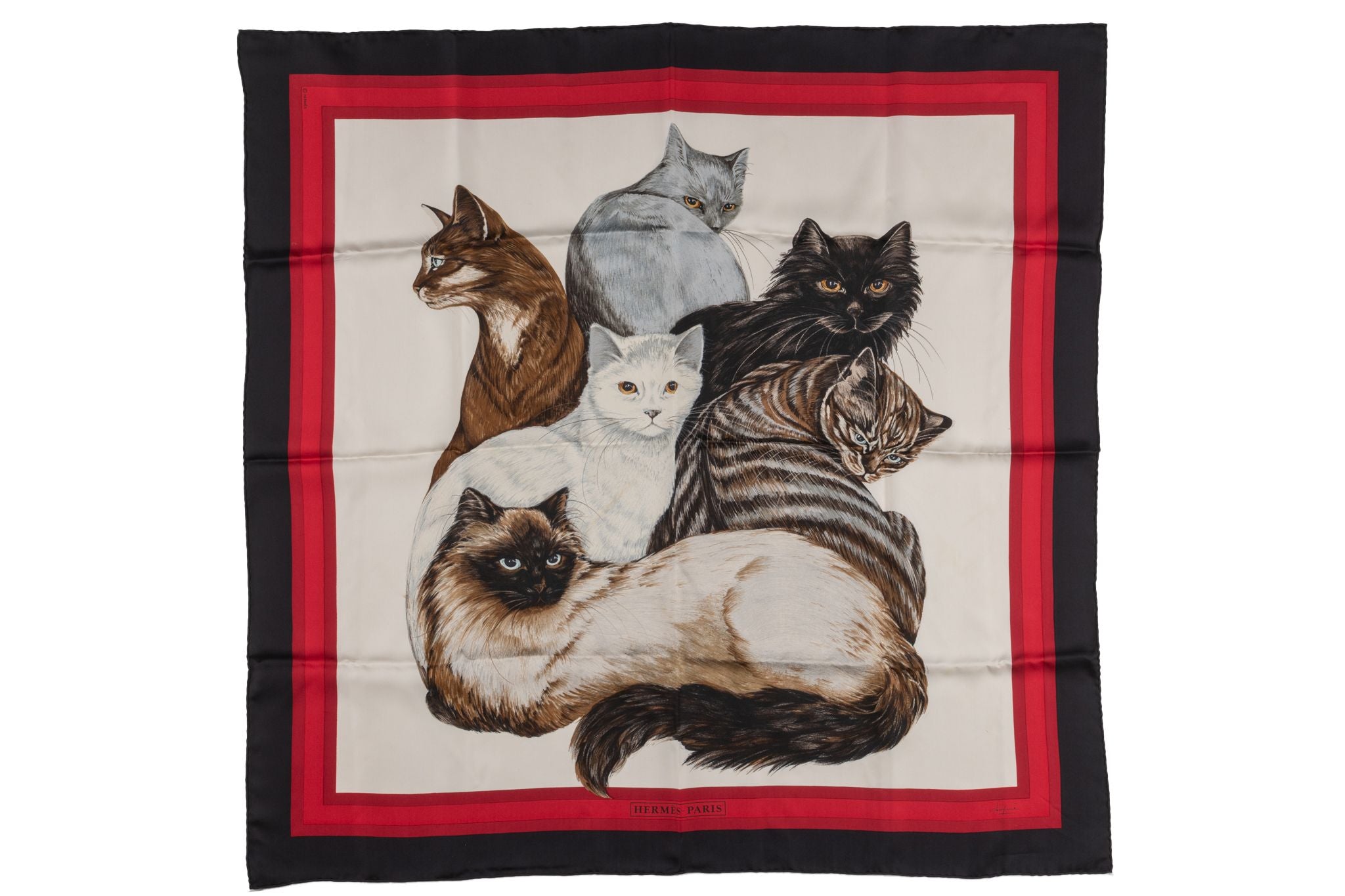 This Hermès Scarf "Les Chats" by Daphne Duchesne is in 100% Silk with hand rolled edges. Minor stains, please refer to photos. No tag. Highly collectible design.
