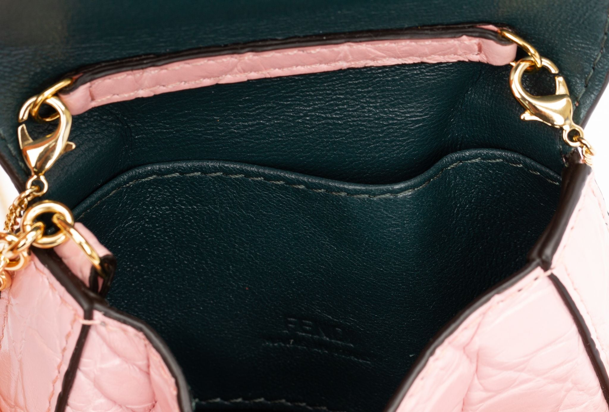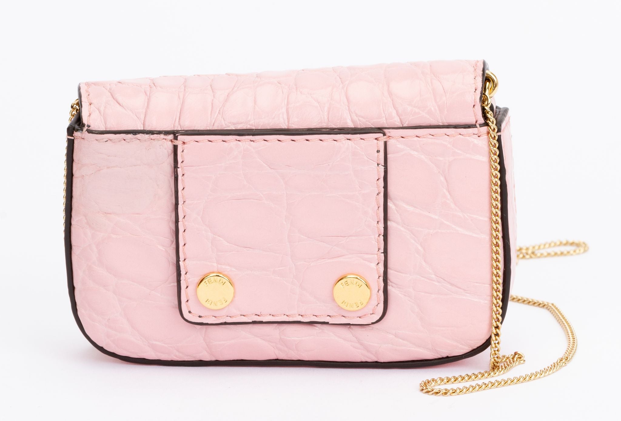 Fendi nano baguette charm made of lamb leather in pink. The pattern of the leather is crocodile skin. The charm can be attached to a bigger bag with the clip or just be worn by itself with the detachable shoulder strap (drop 23.75"). The bag is brand new and comes with the original box and the dust cover. Cites documents.