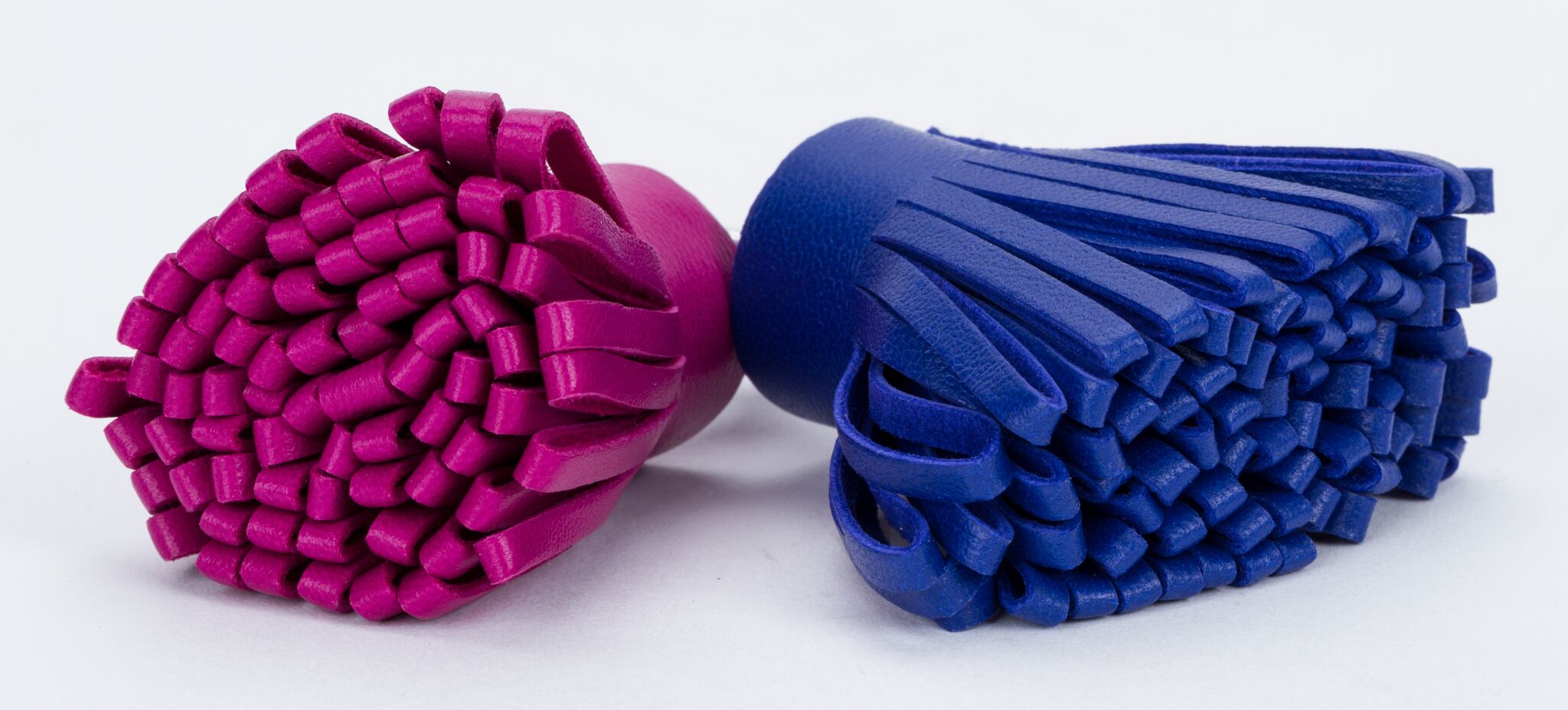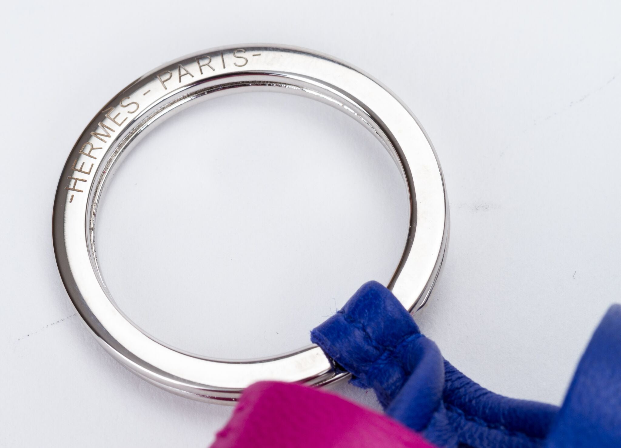 Hermès double-tassel keychain in electric blue and rose pourpre milo lambskin with palladium hardware. New in box with ribbon.