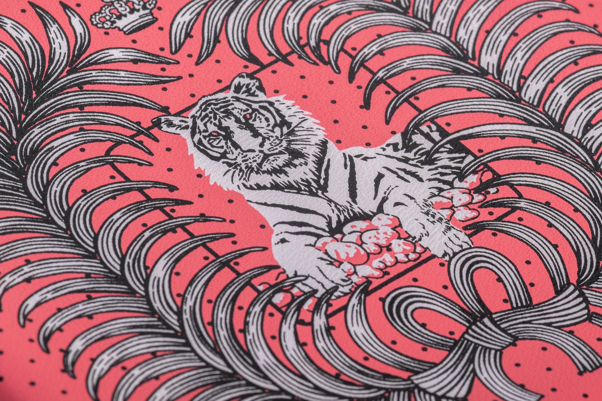 Hermes brand new in box small square pochette. Rose d’ ete’ leather with imperial tiger design.