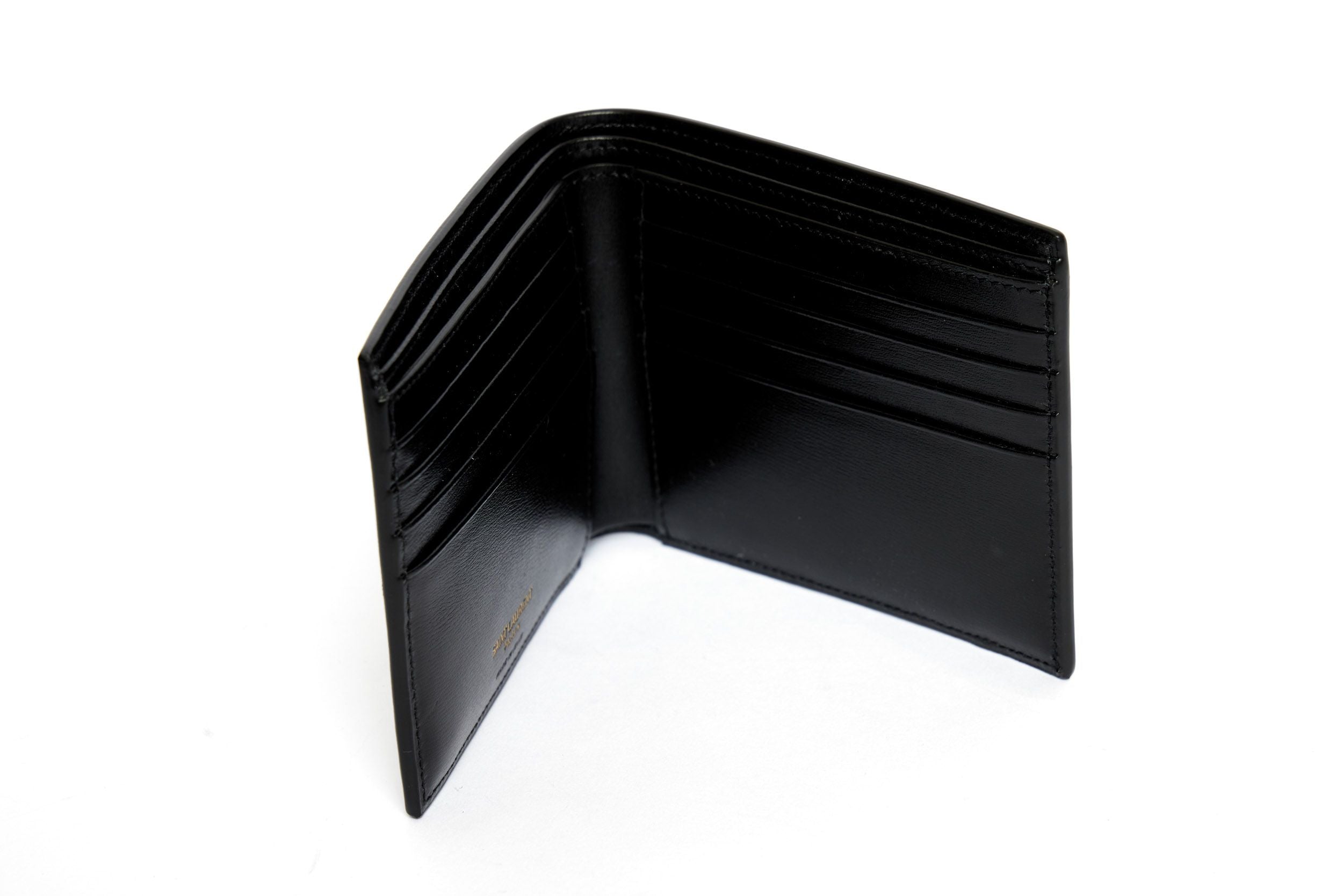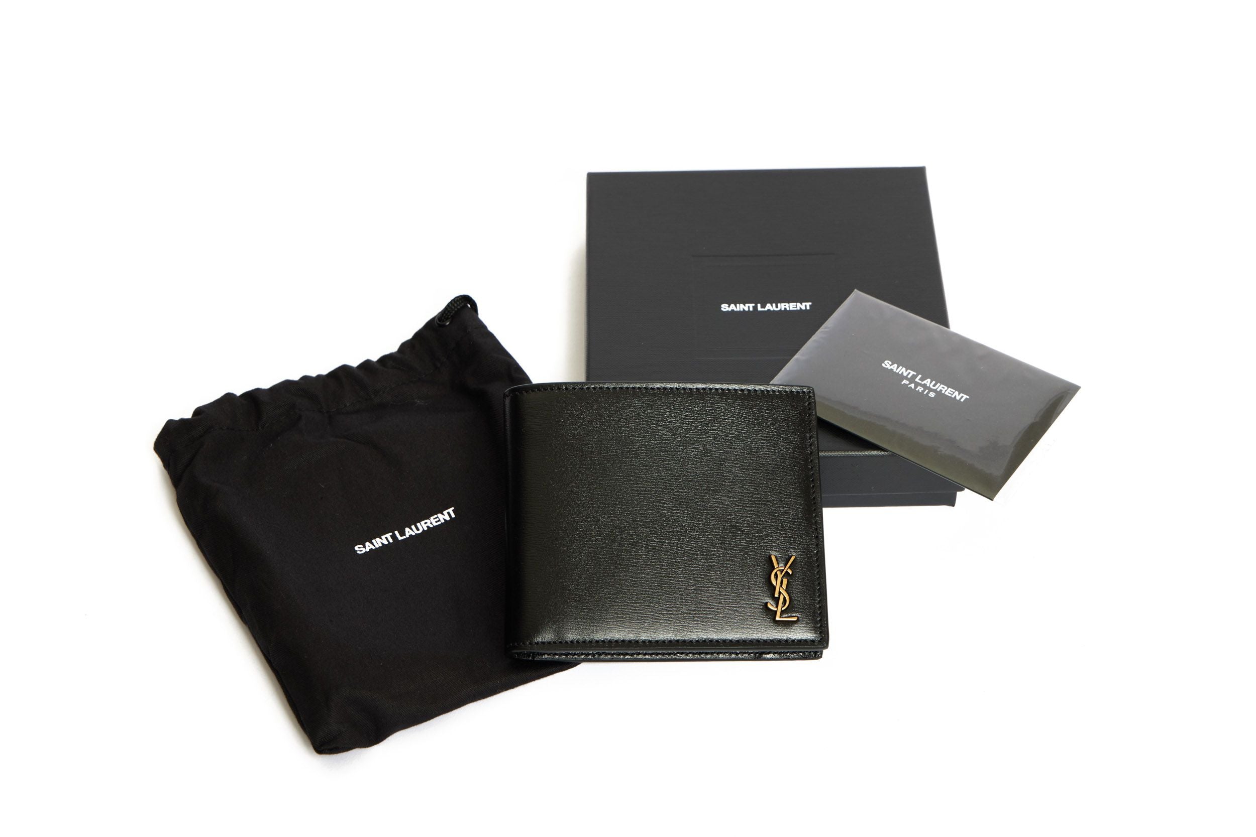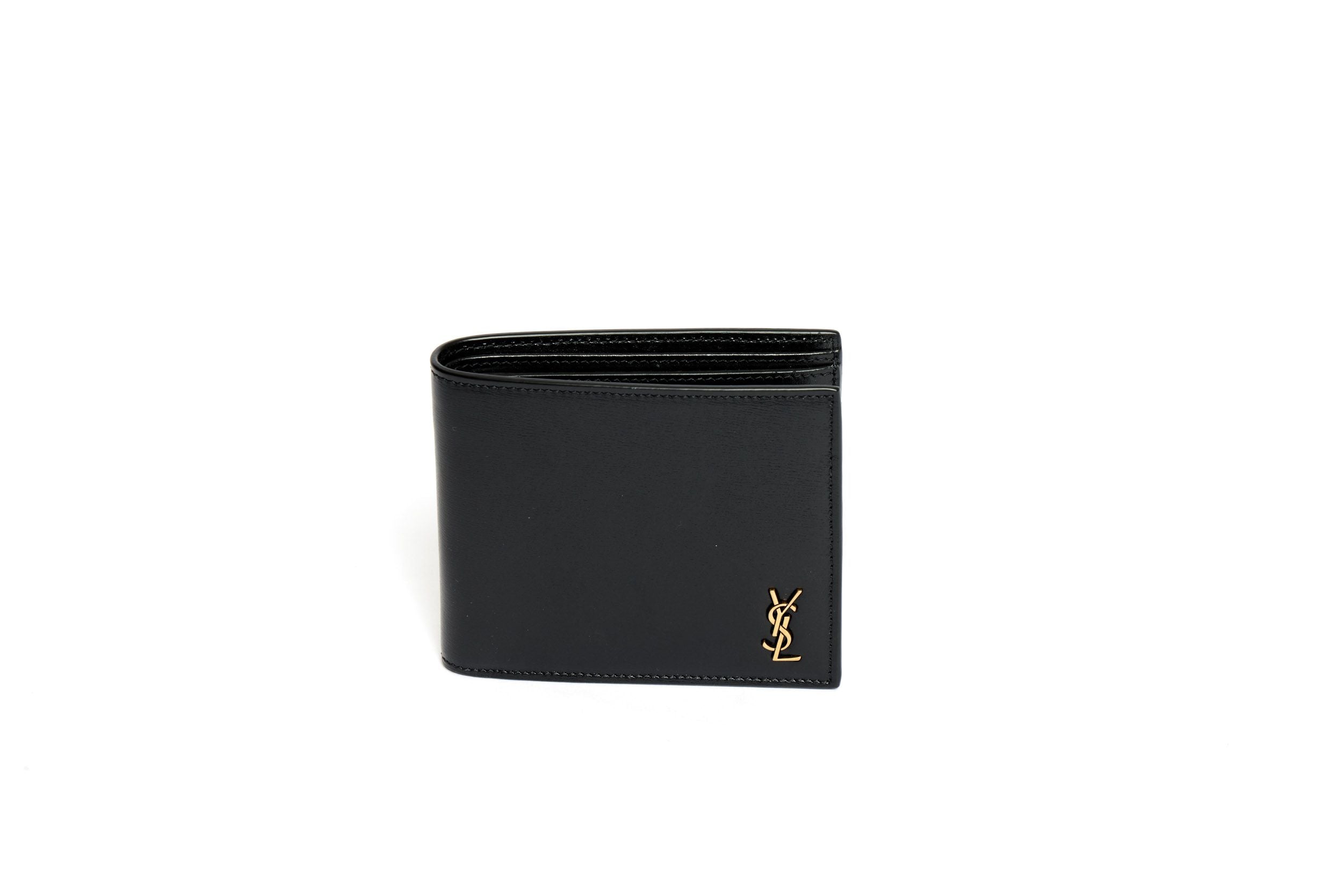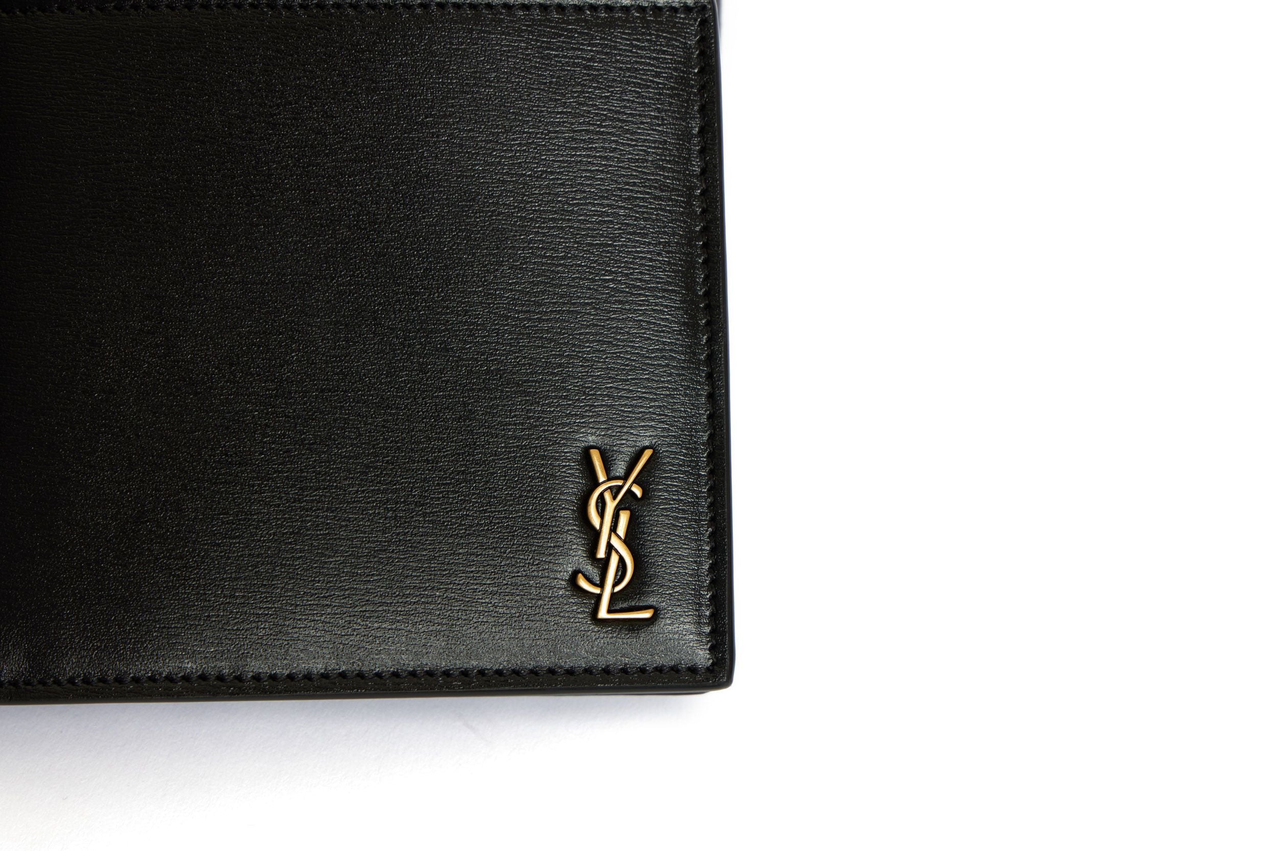YSL black leather wallet with 8 card slots and 2 compartments inside. The interior is crafted of black fabric lining. On the outside front right corner is a gold metal YSL logo. The piece is new and comes with booklet, original dust cover and box.