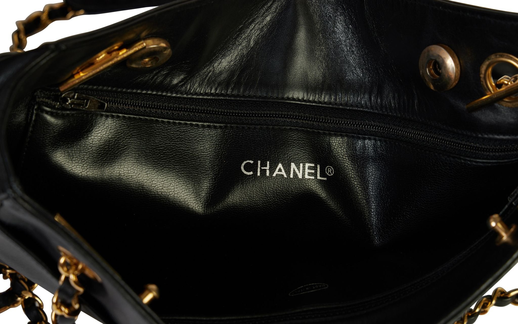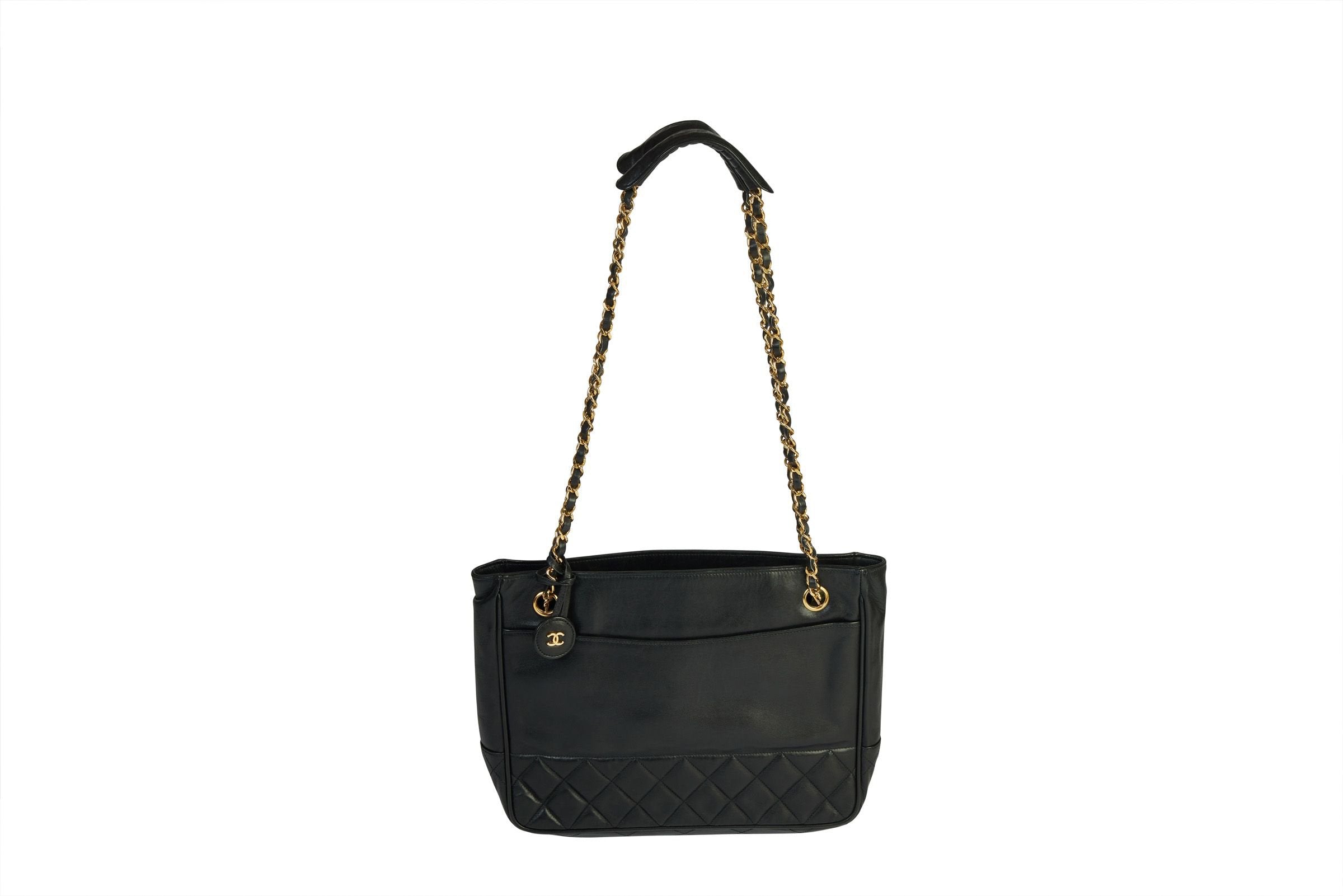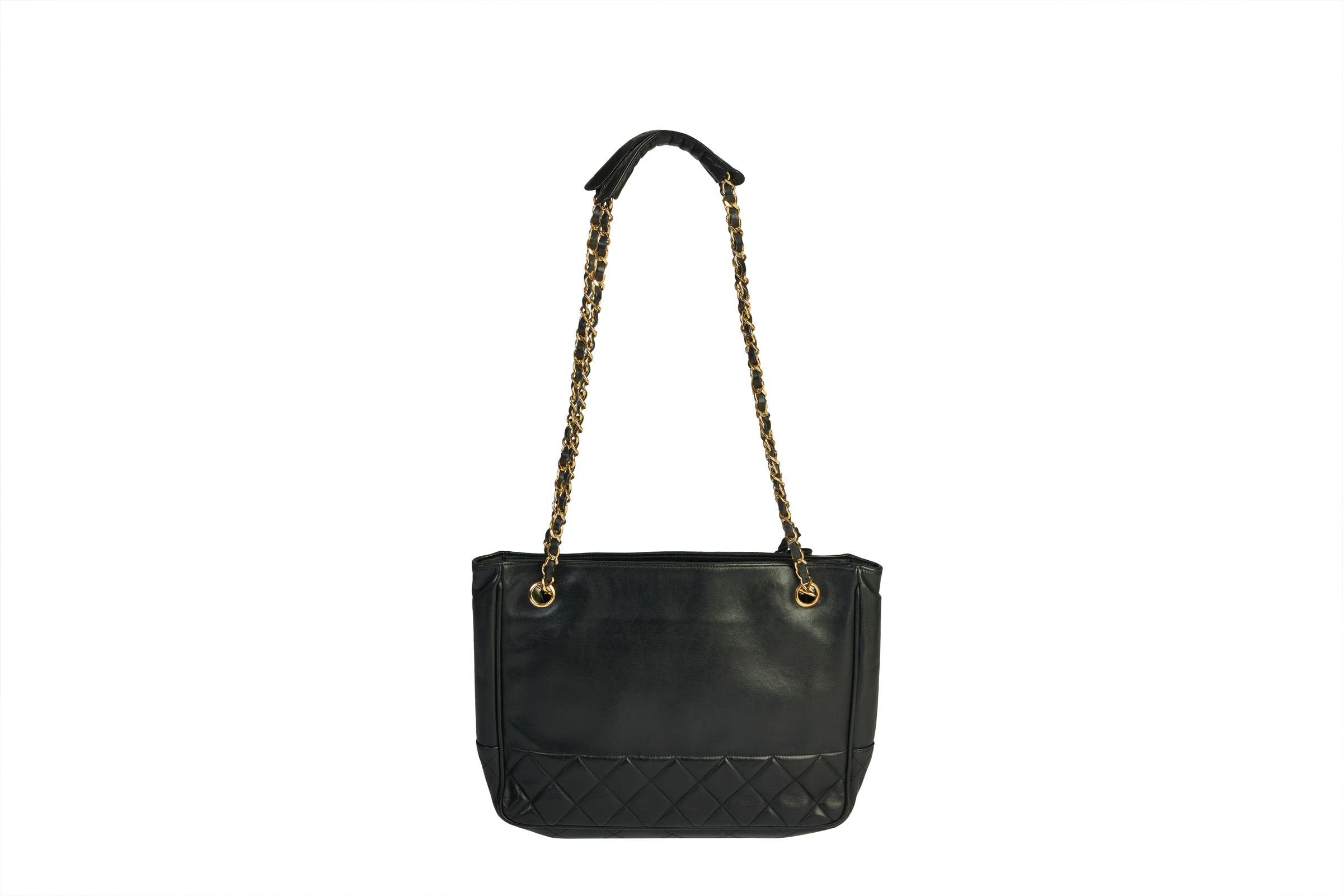 Chanel excellent vintage black shoulder bag, partially quilted. Gold tone hardware. Collection 1986/1988. Shoulder drop 13". Comes with hologram and original dust cover.