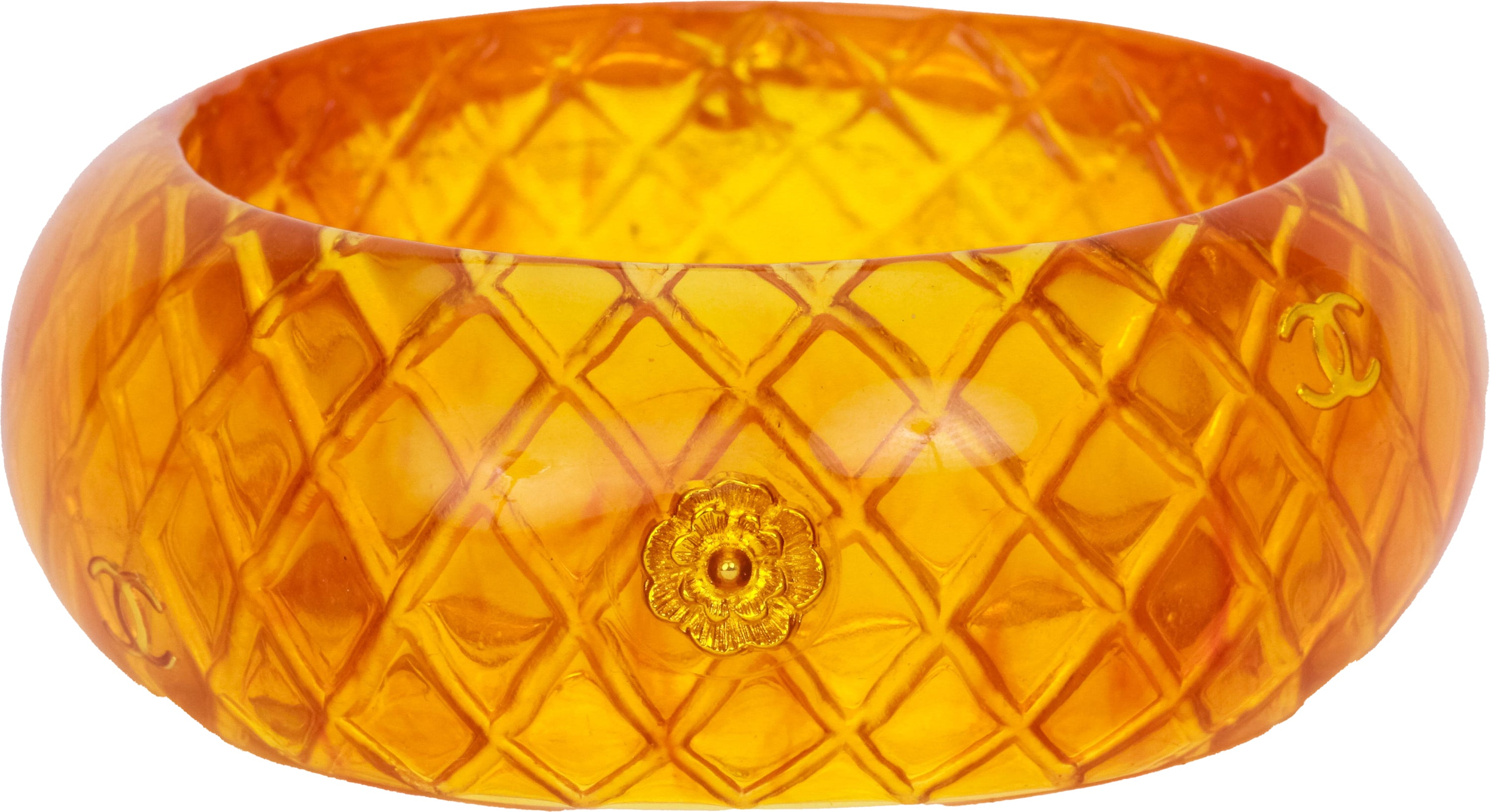 Chanel amber quilted bangle bracelet with inlay CC logos, camellia flowers, and even a lucky turtle. inside diam 2.5" outer diam. 3.5". Comes with original pouch.