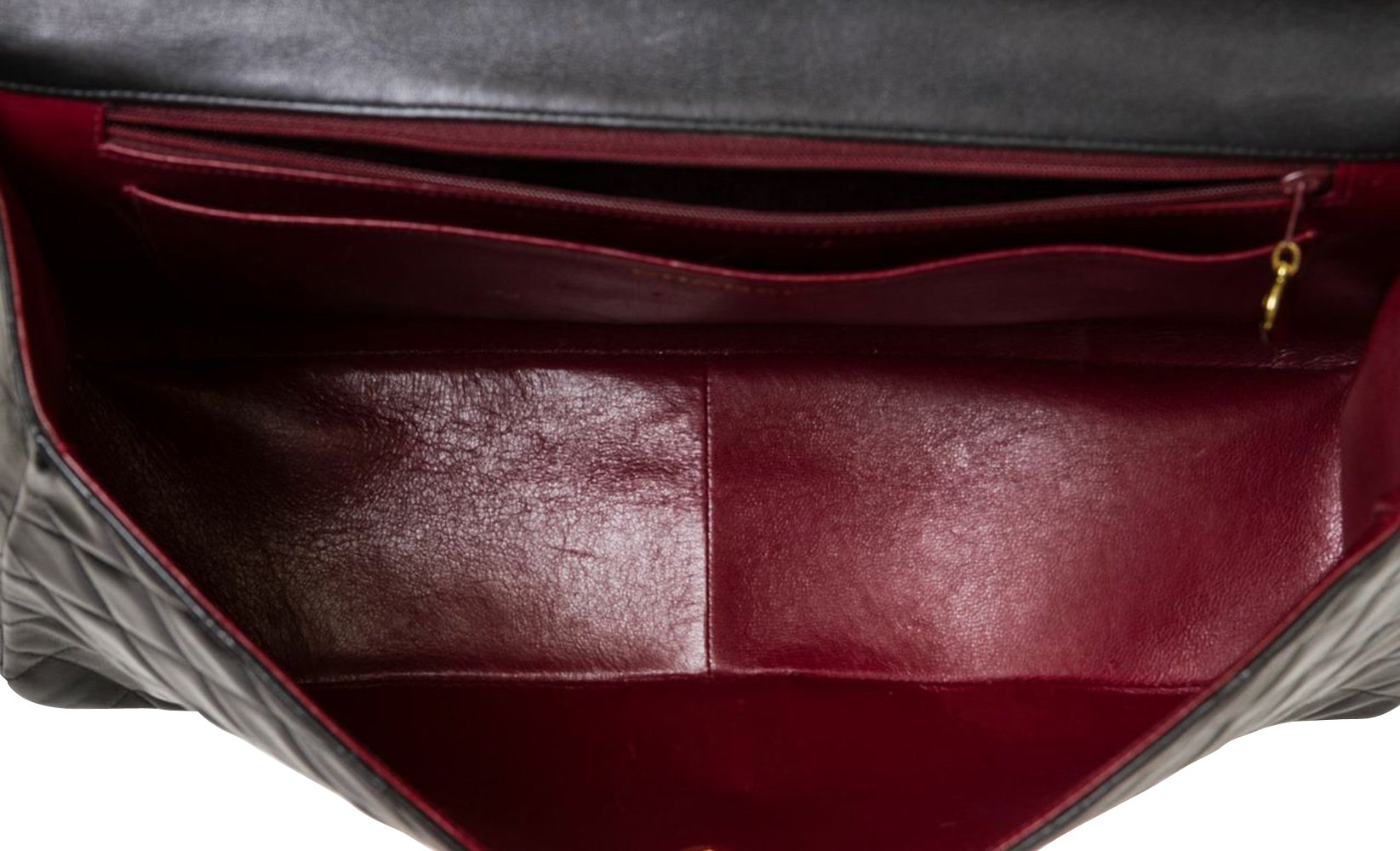 Chanel classic maxi flap bag with signature oversize "CC" logo. Turn lock closure. Black quilted lambskin and goldtone hardware. Very good condition. Strap, 25"L - 14"L. Comes with hologram and original dust bag.