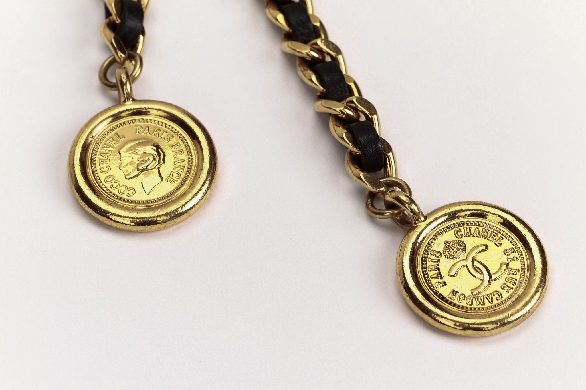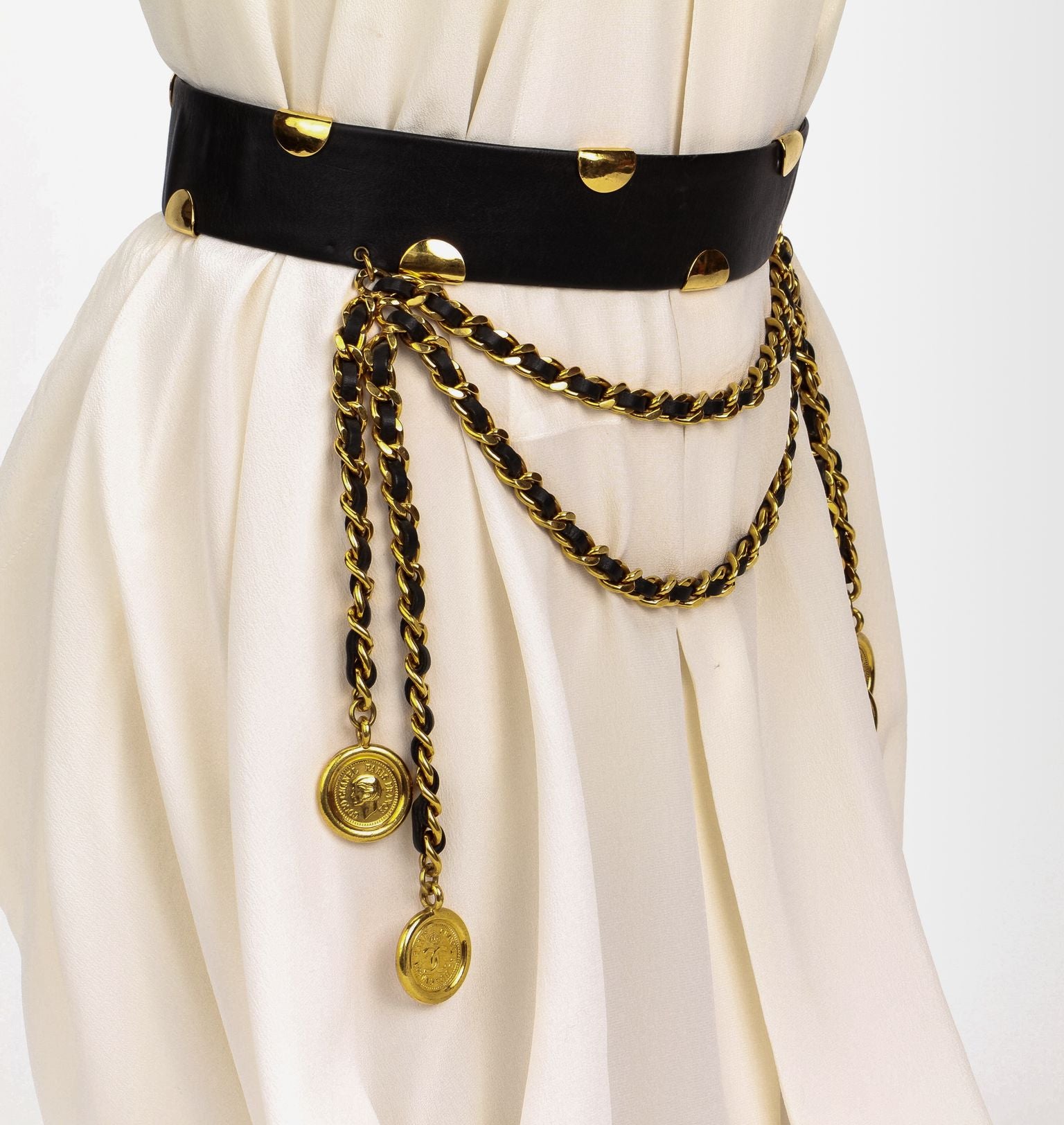 Chanel black leather belt with hanging charms. Collection spring 93, 70/28, original box or dust cover. Very collectible 90s supermodel belt. Small size.