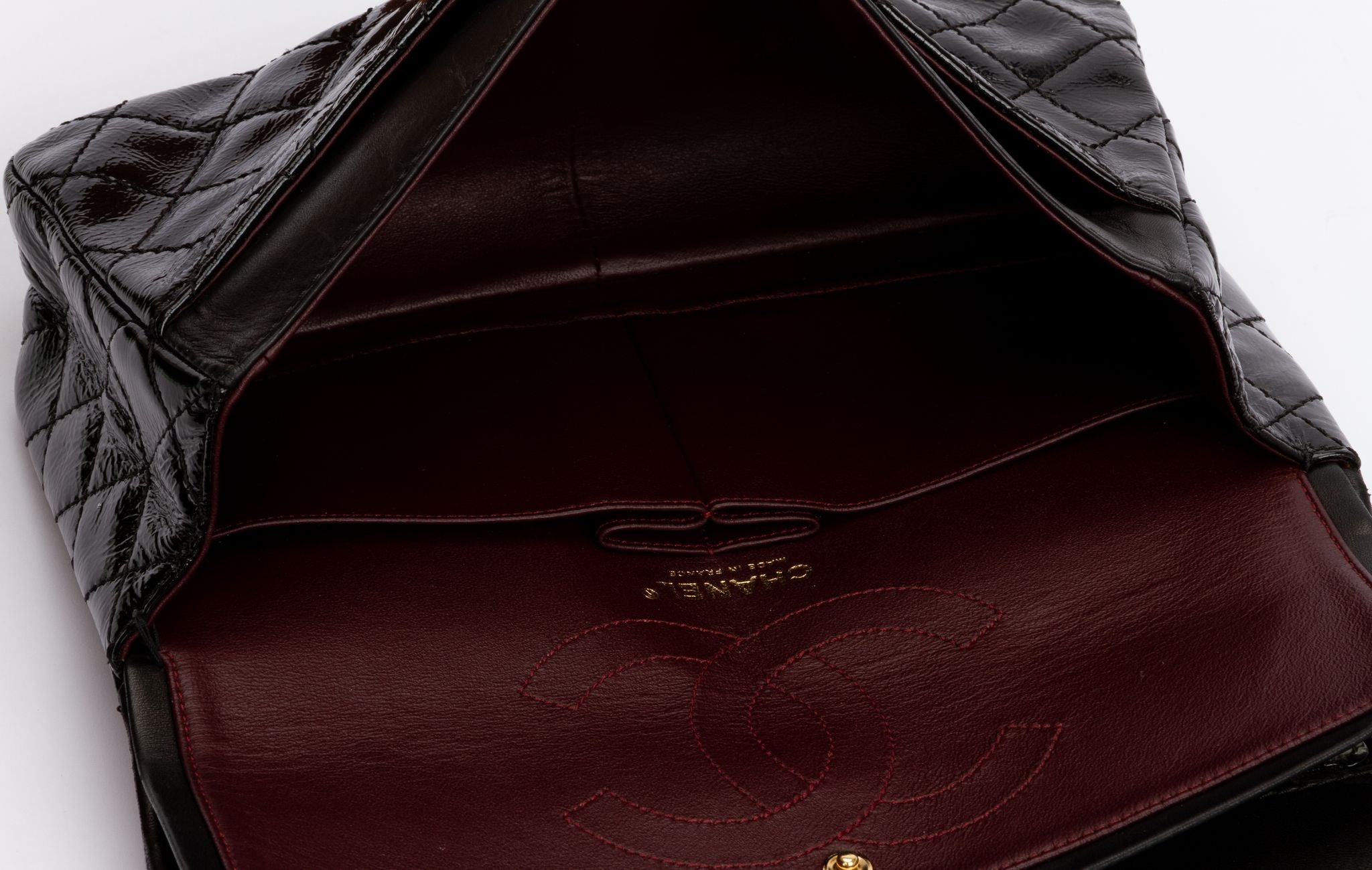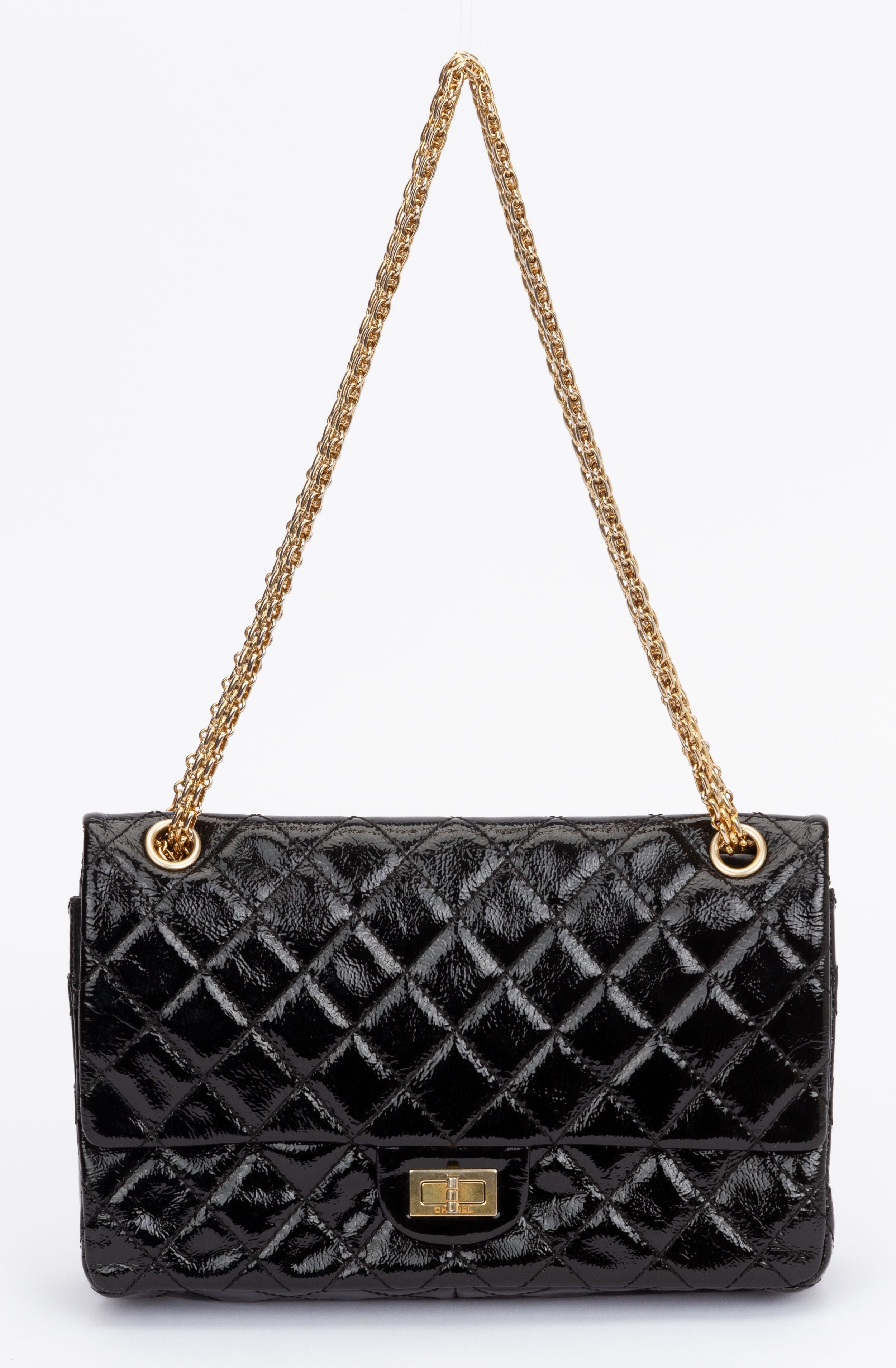 Chanel black patent leather medium reissue double flap with gold tone hardware. Shoulder strap drop 8"/20.25". Collection 11. Missing love letter compartment zipper pull. Includes hologram and original dust cover. Current store price $8800.