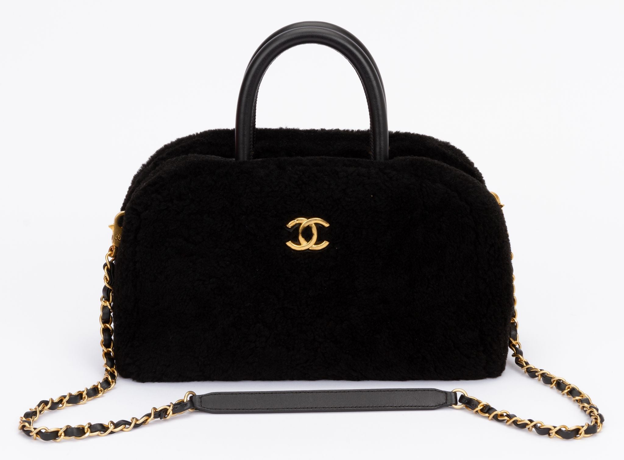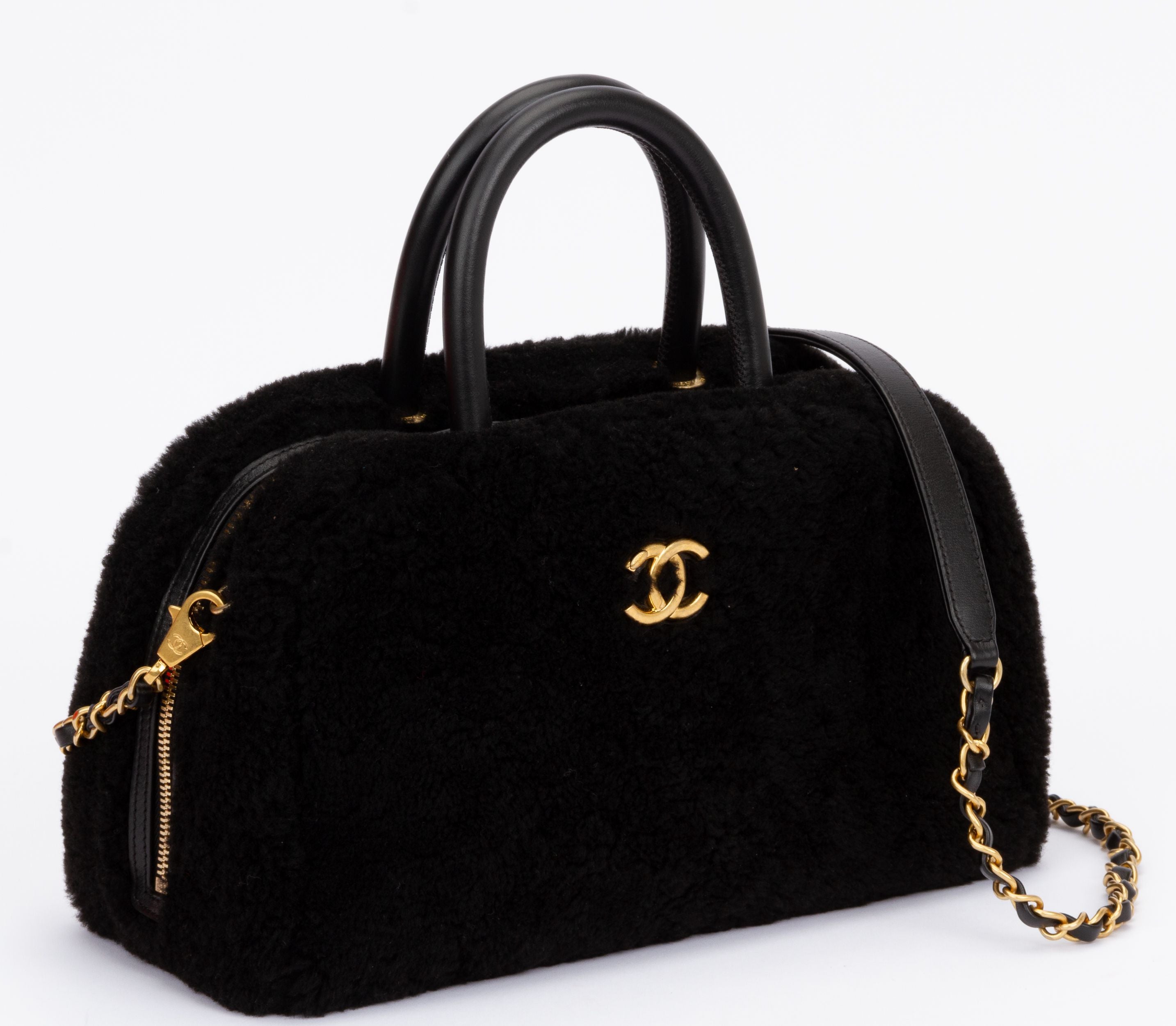 Chanel mint condition black shearling bowler bag with detachable strap . Detachable shoulder strap (drop 19"). Collection 23. Includes card and hologram.