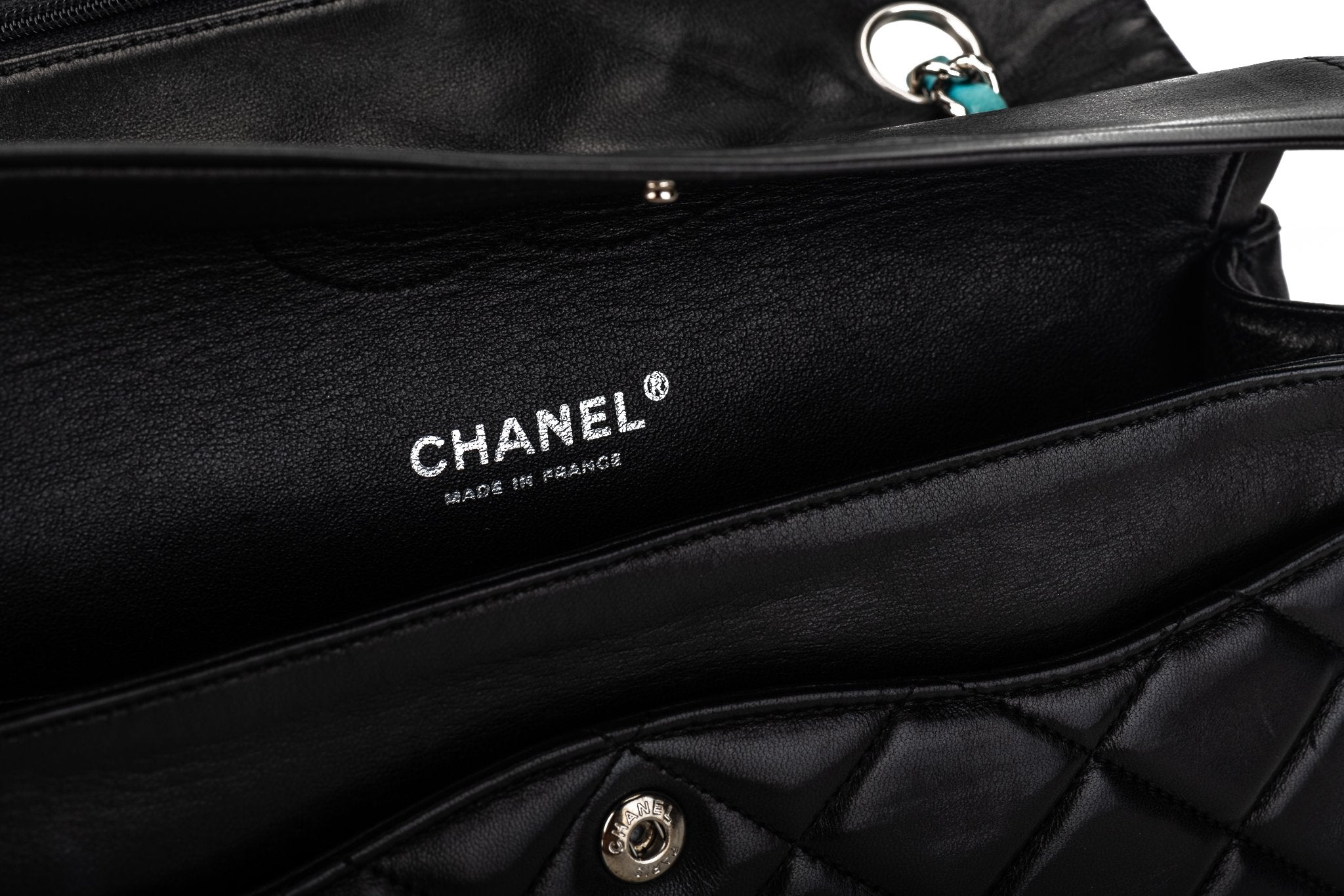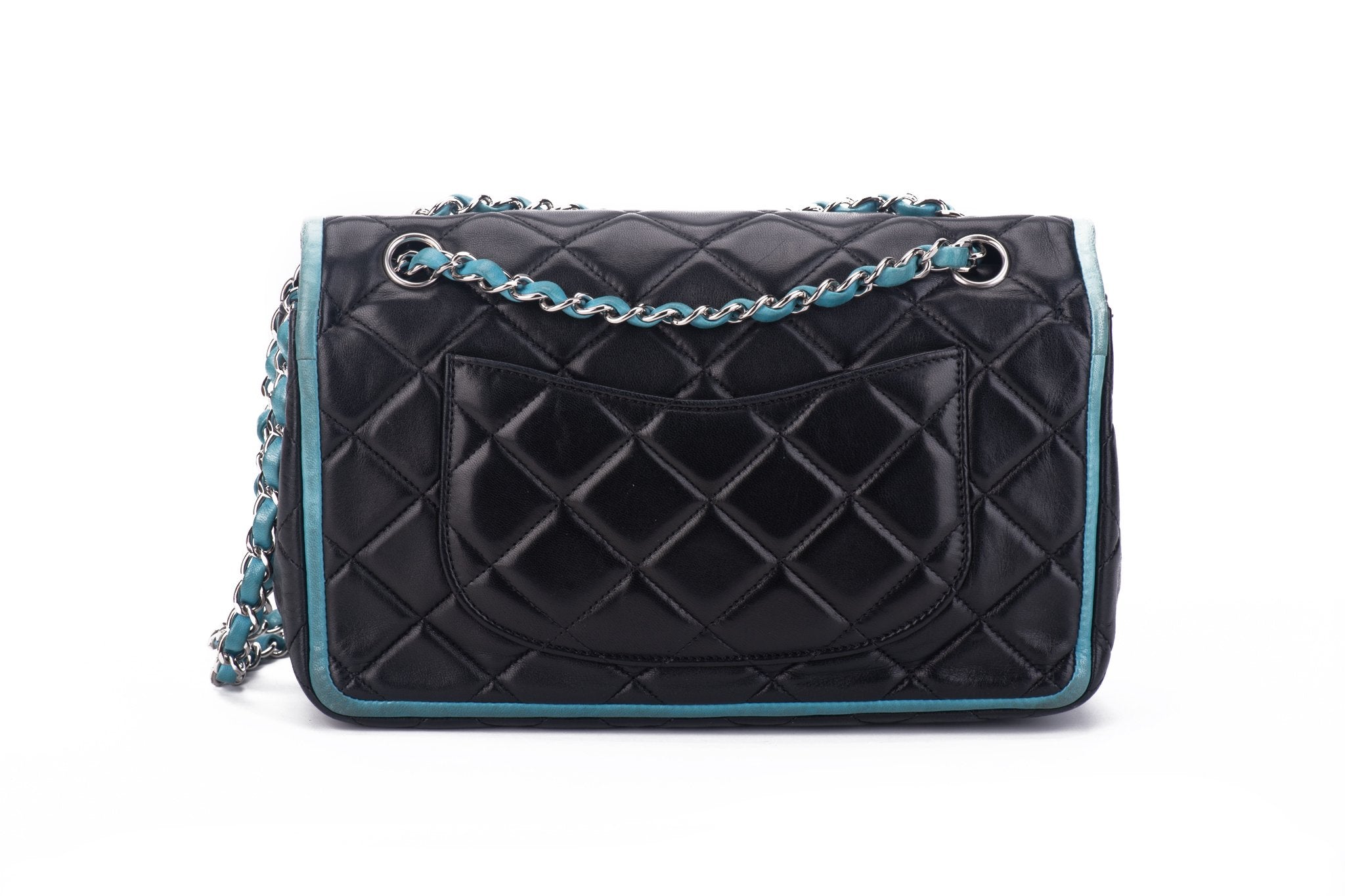 Highly collectible butte lambskin double flap with turquoise leather trim. Ruthenium hardwware. Should drop 9.5"/17". Collection 11. Comes with hologram and generic dust cover.