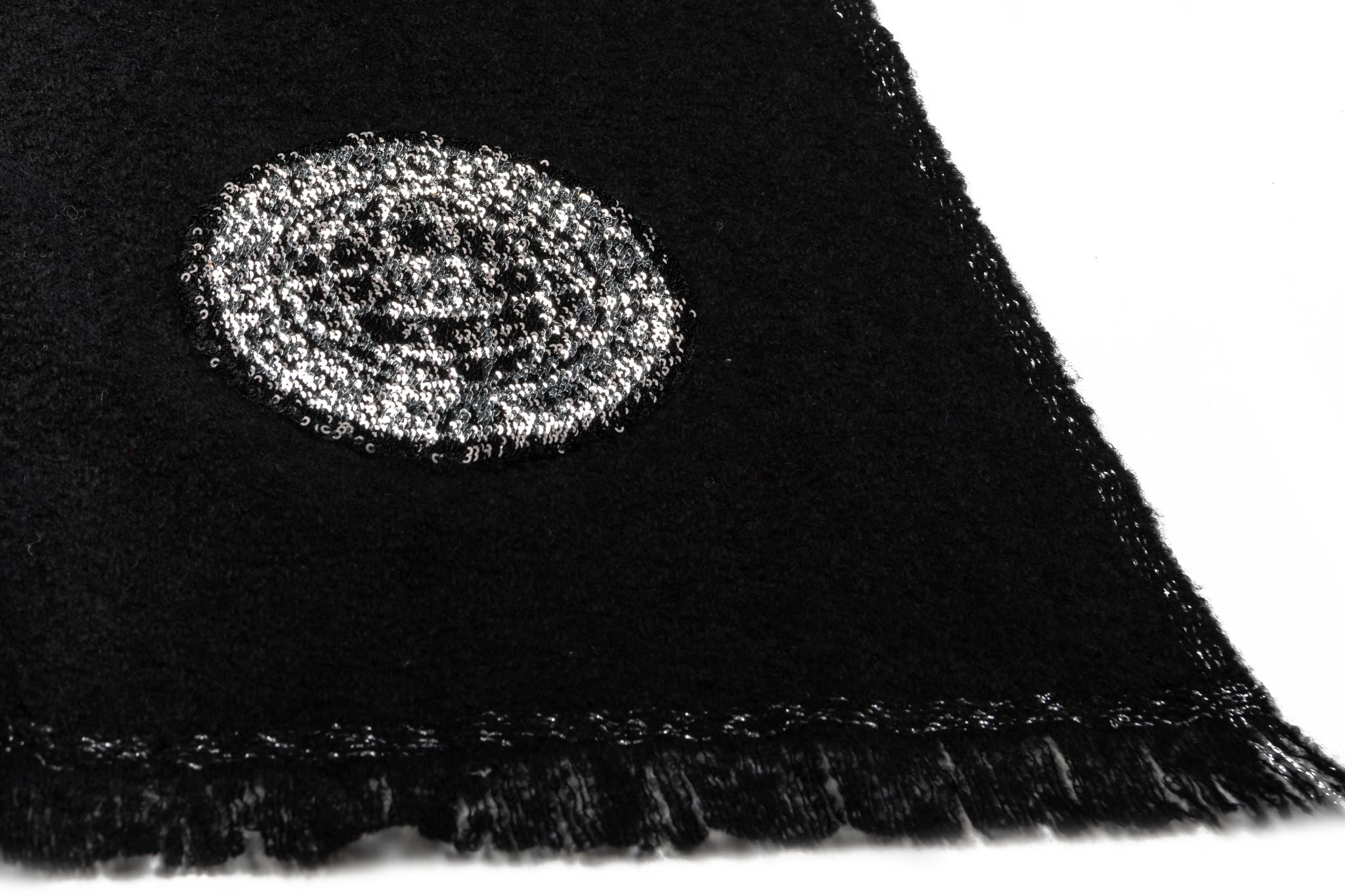 Chanel brand new cashmere black and silver lurex combination shawl. Embroidered logo. Hand rolled edges. Care tag.