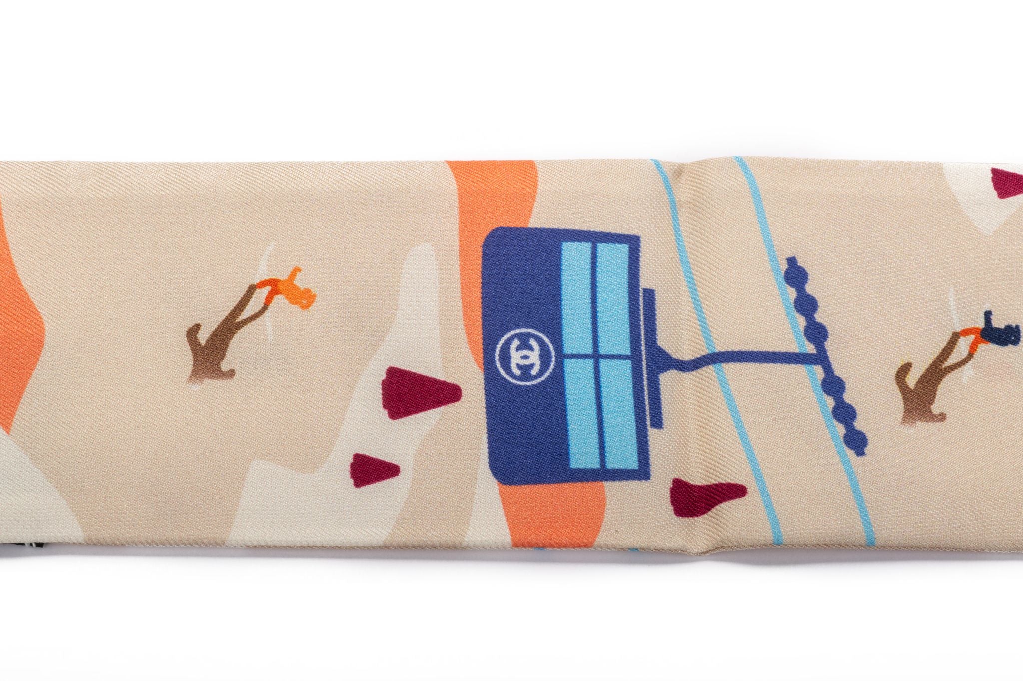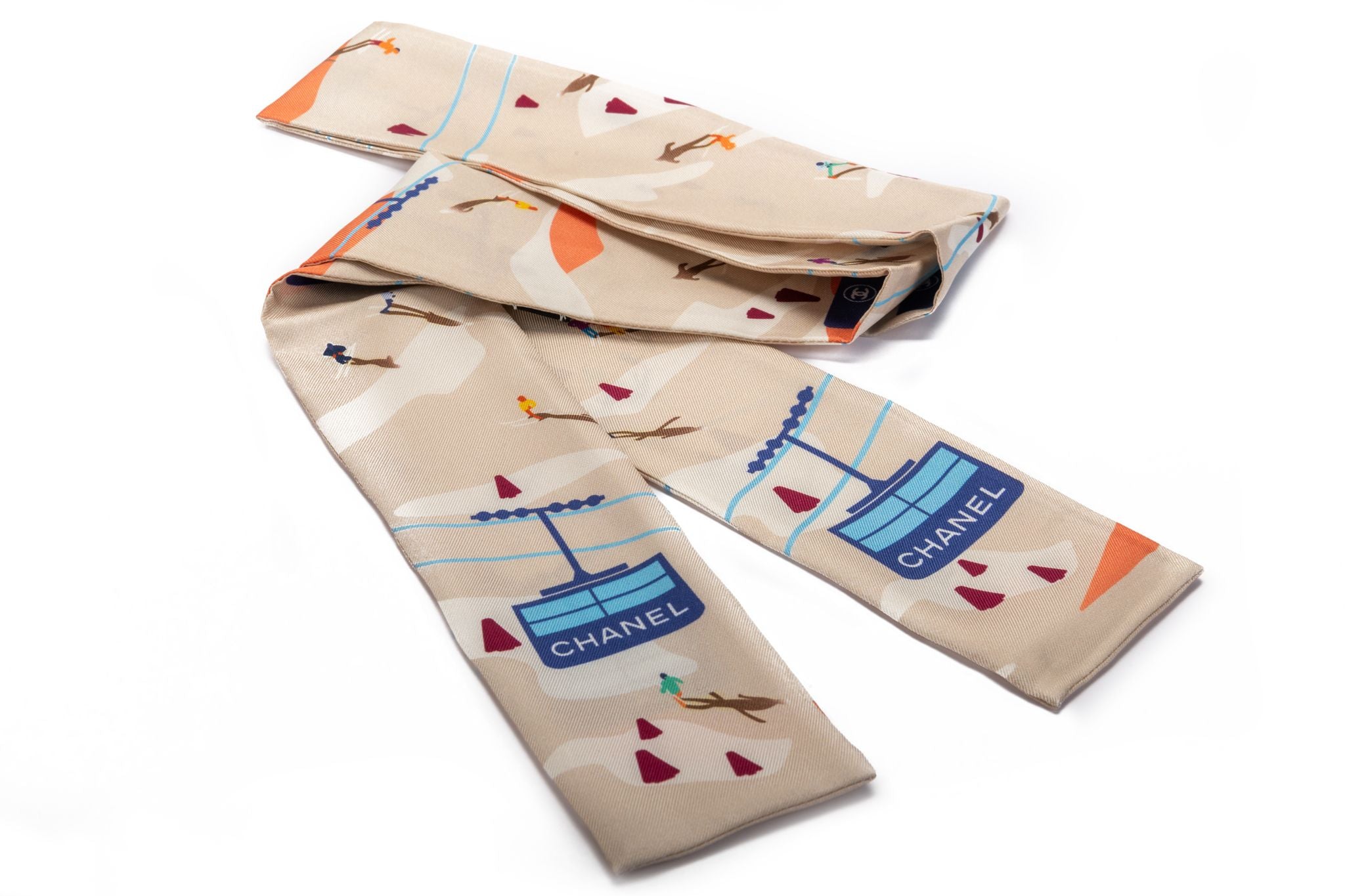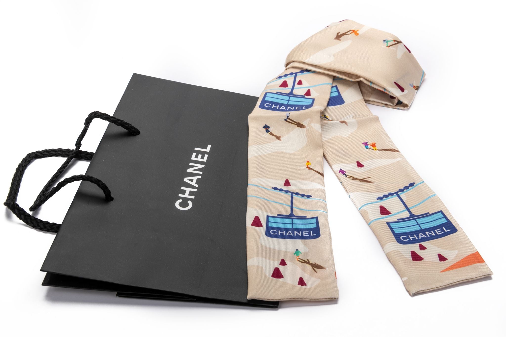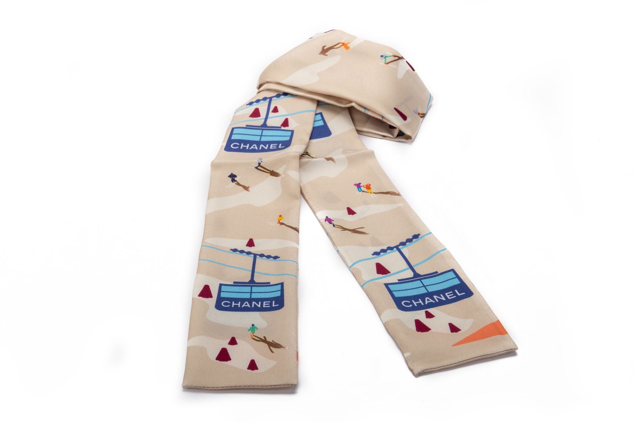Chanel brand new 100% silk twilly scarf. Coco niege collection with skiers and cable car. Beige base color with blue and burgundy detail. Chanel shopper not included.