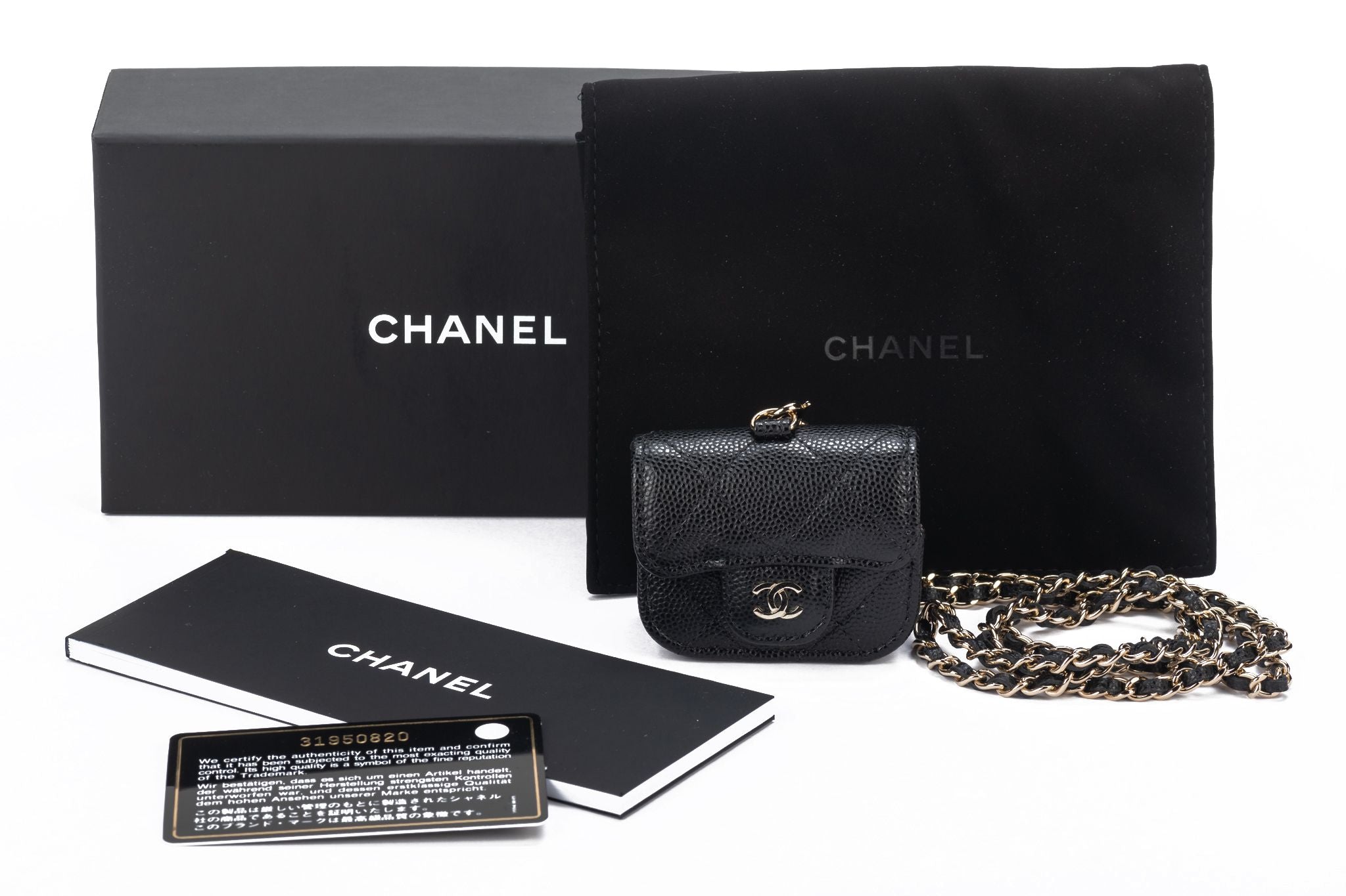 Chanel brand new in box black quilted caviar air pods case necklace/cross body. Chain drop 17”. Collection 31. Comes with hologram, id card, original dust cover and box .