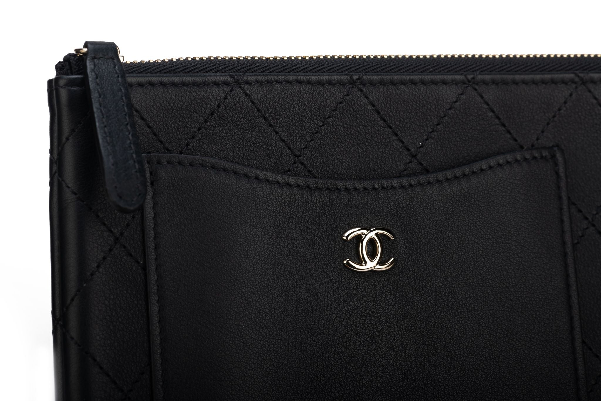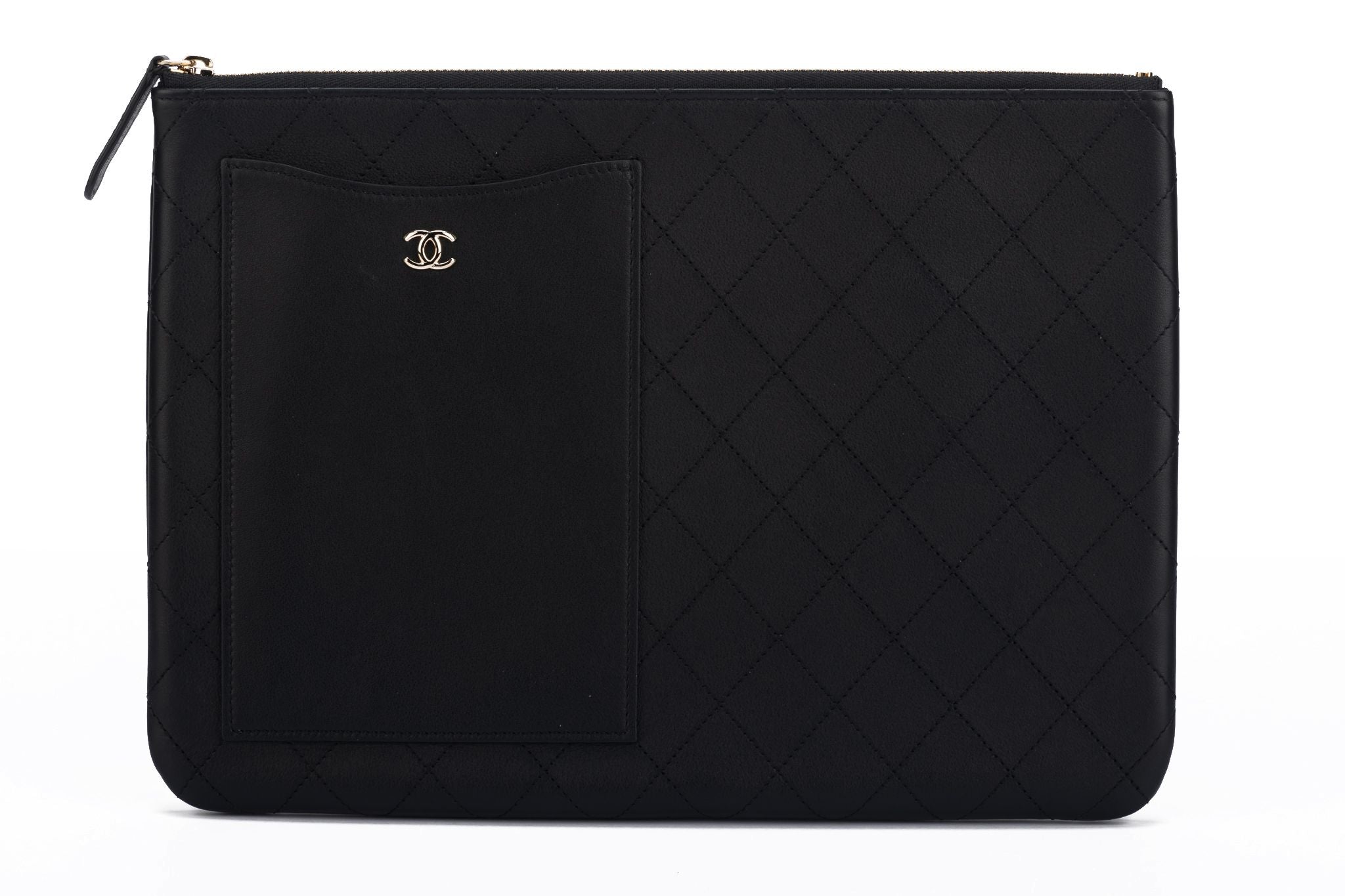 Chanel new black Lambskin quilted leather clutch. Gold tone hardware. Collection 28. Comes with hologram , ID card, original dust cover and box.