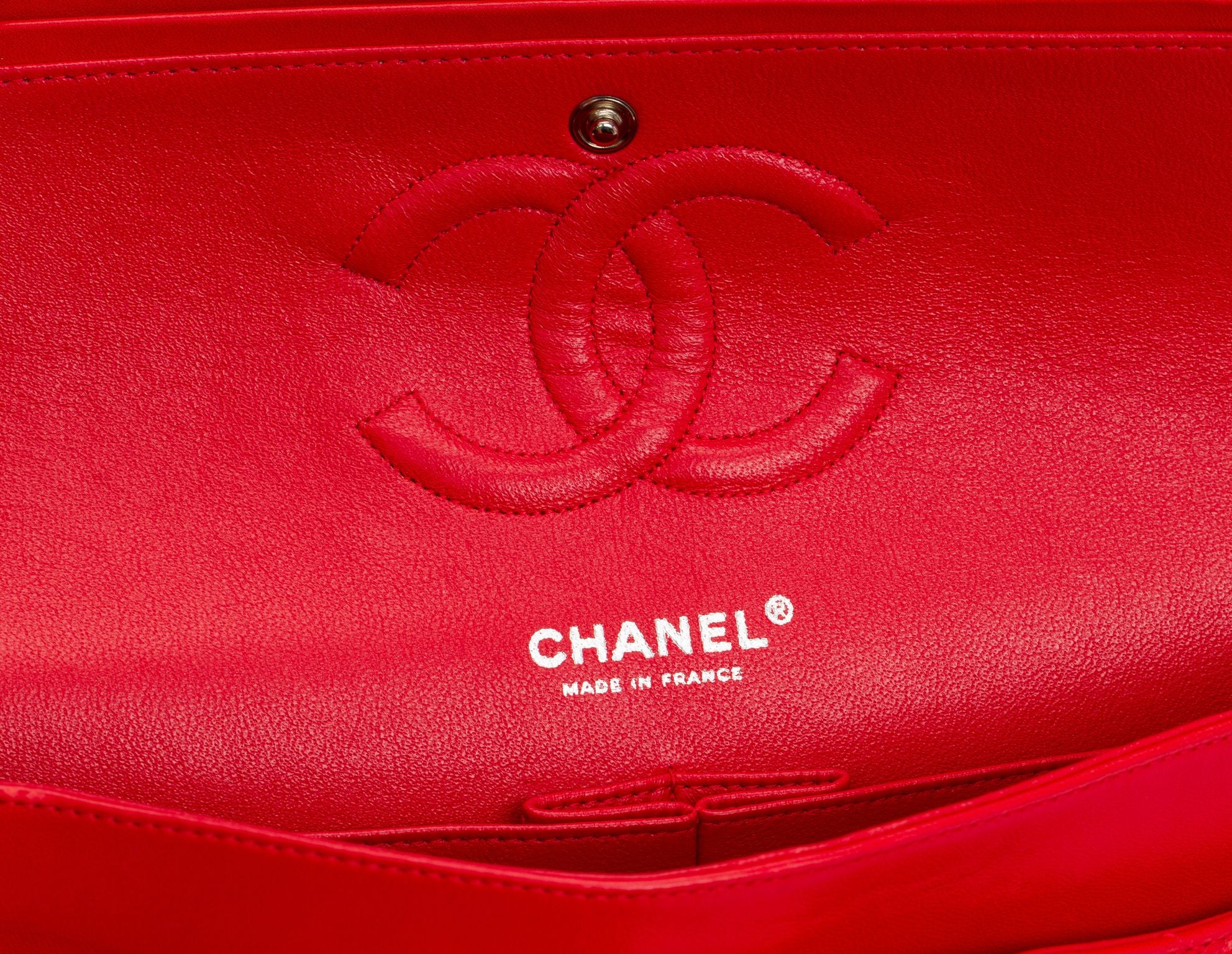 Chanel bright red lambskin 10 double flap with silver tone hardware. Includes card and original dust cover. Collection 9. Shoulder drop 9.5"/16.75". Current store retail $10,200.