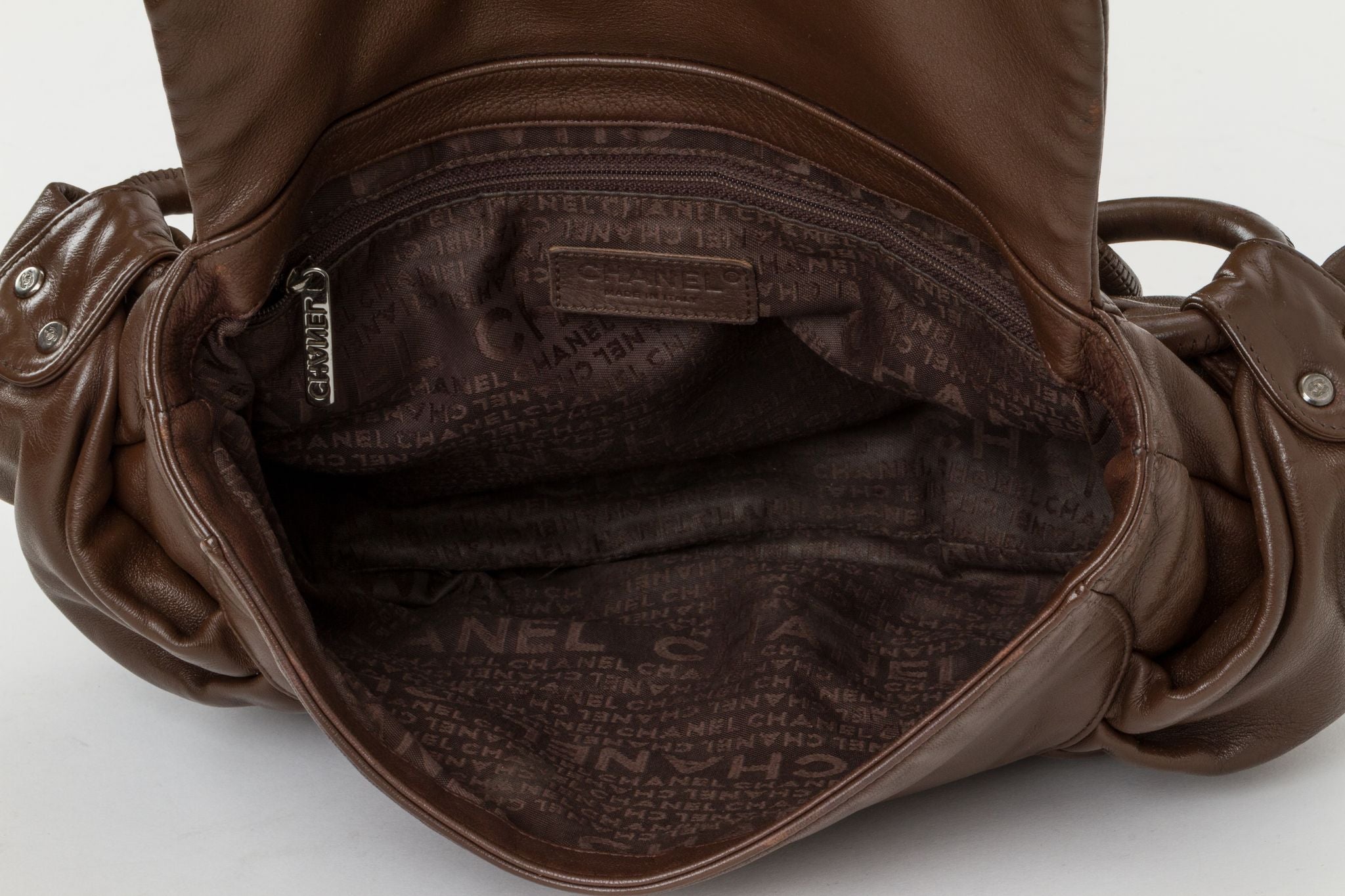 Chanel large croissant-shaped pleated shoulder bag, oversize leather link chain. Drop, 12"L. Made in Italy, comes with ID card holder, seal, booklet and generic dust bag.