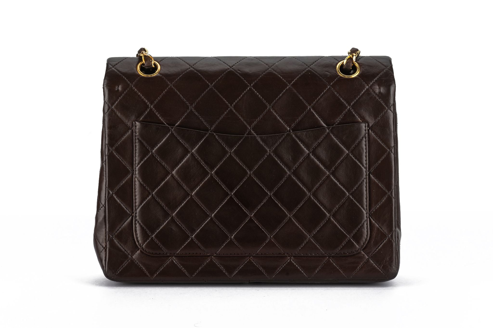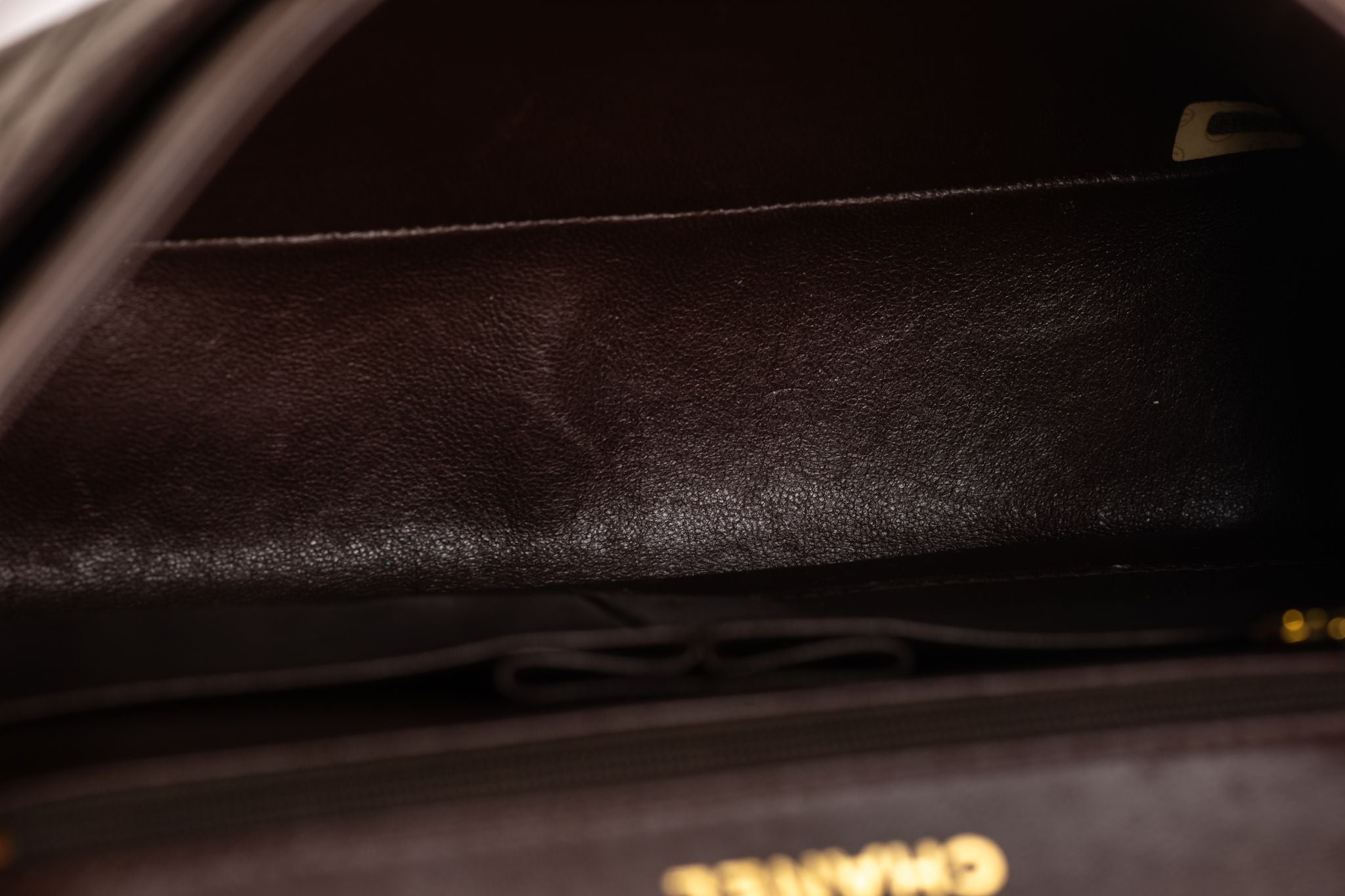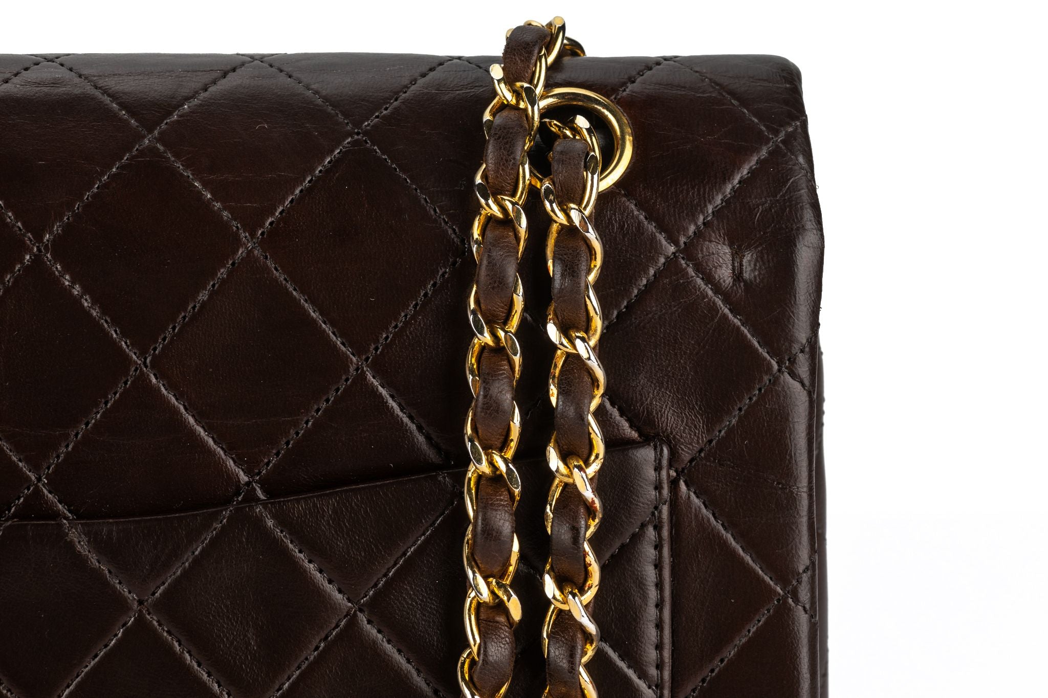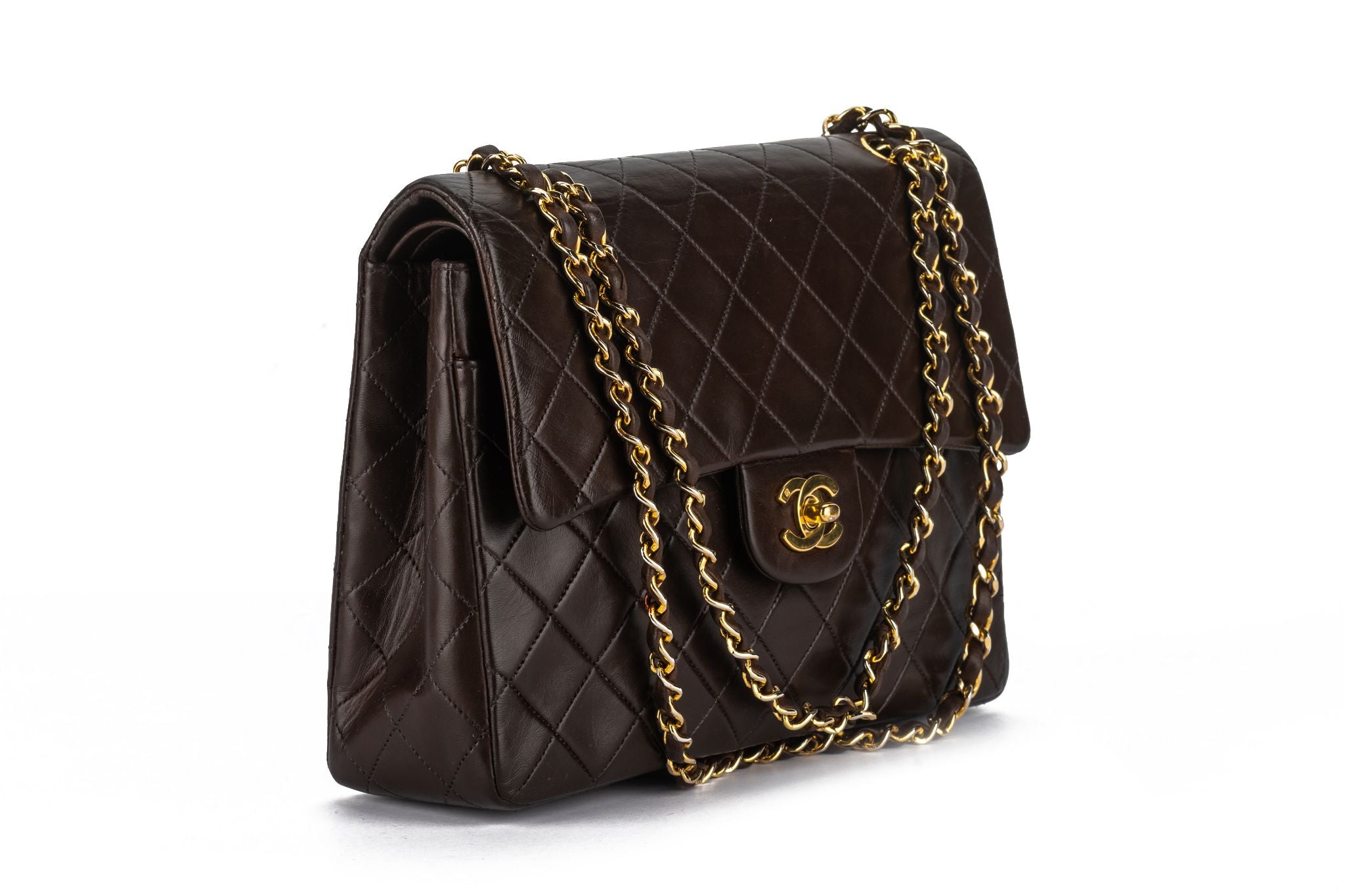 This Chanel shoulder bag features brown lambskin, an interlocking CC Logo & a quilted pattern, gold-tone hardware, chain-link shoulder straps, leather lining, turn-lock, flap, and snap closures at the front. Special style a little bit taller than regular . Comes with an original dust cover and authenticity card. First two numbers 16.