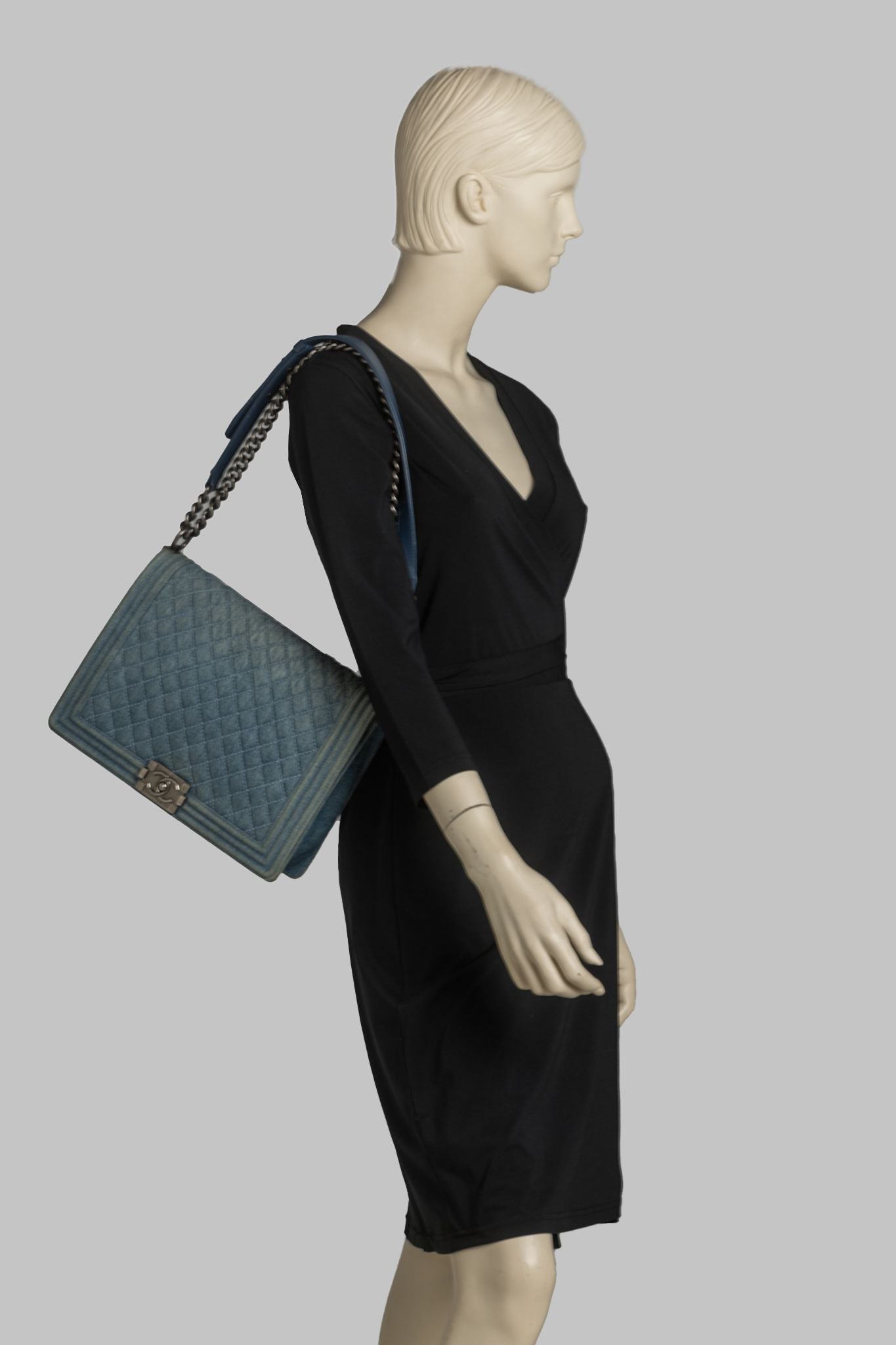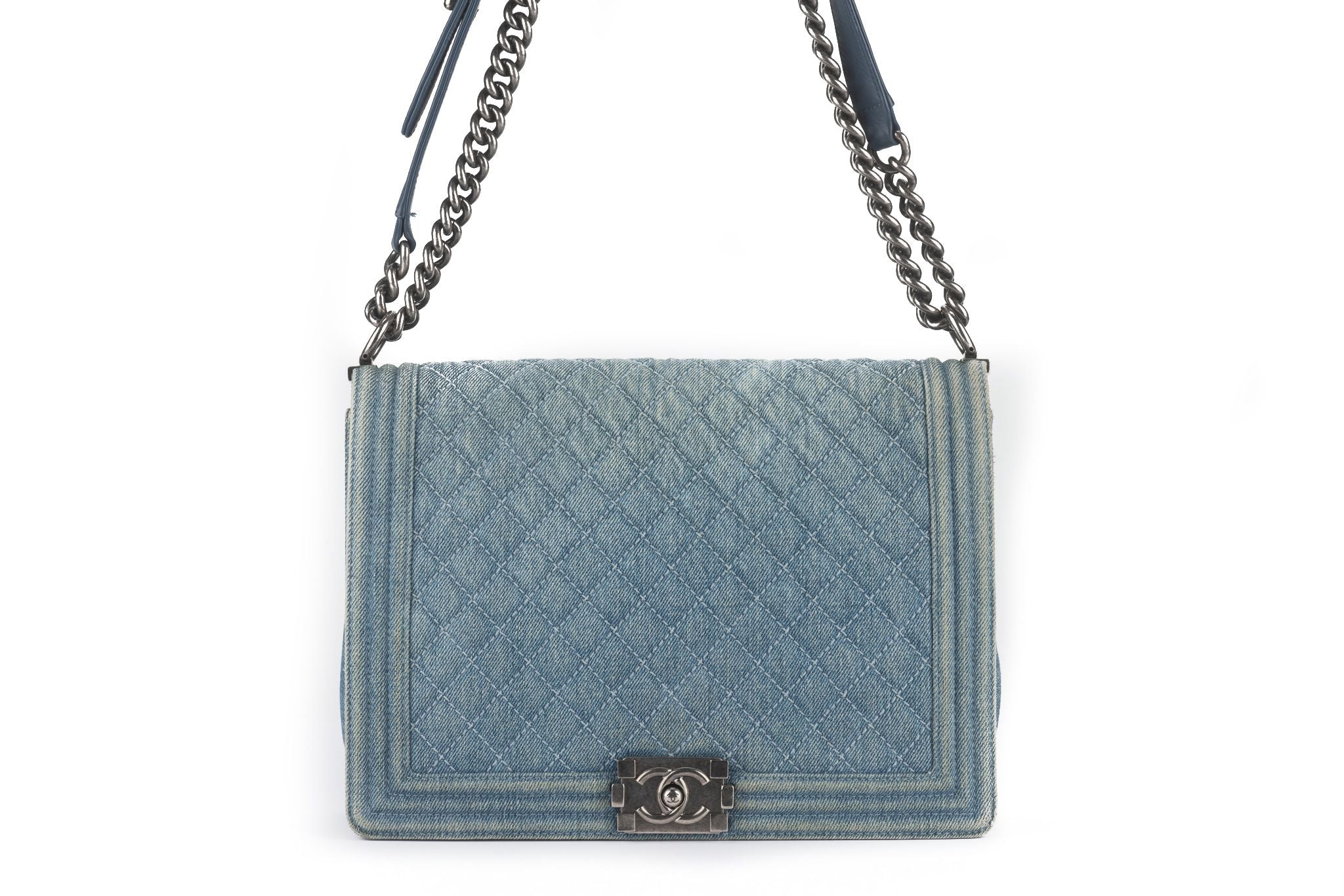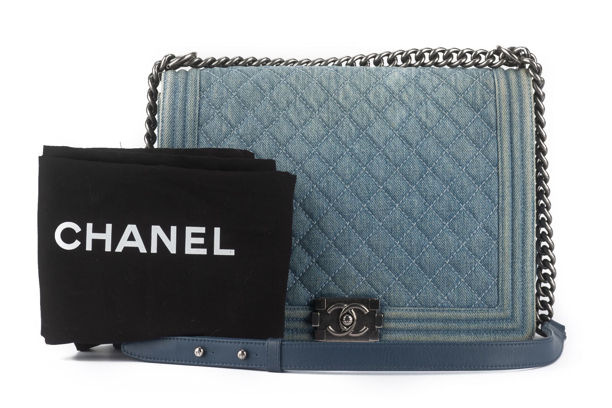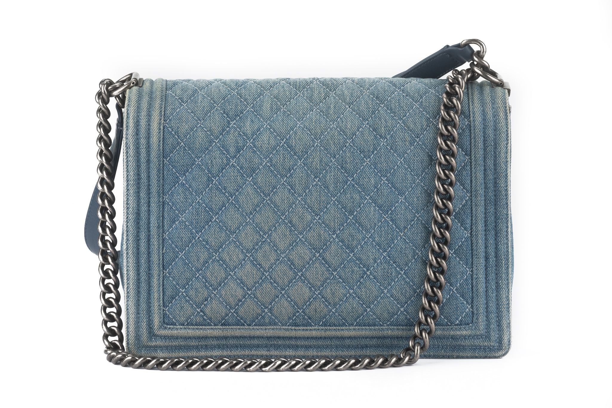 This Chanel Denim Quilted Large Boy Flap in Blue features quilted denim with quilted framed blue denim edges. The bag features a ruthenium chain link shoulder strap with a shoulder pad and the flap opens with a ruthenium Mademoiselle CC Chanel lock to a blue leather interior with a zipper pocket. Comes with hologram and original dust cover. Strap drop - 11.5"/19.5". Hologram starts with 17.